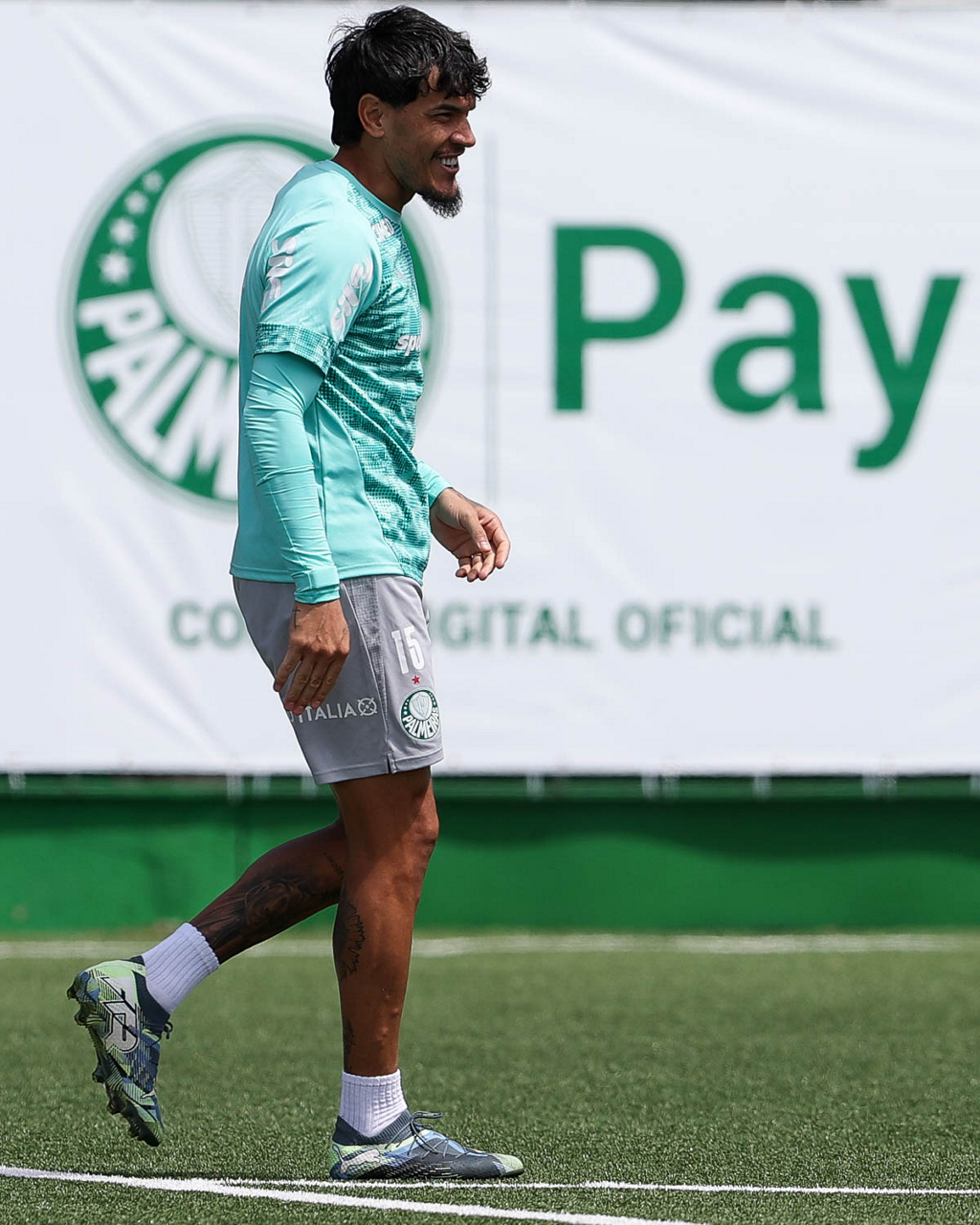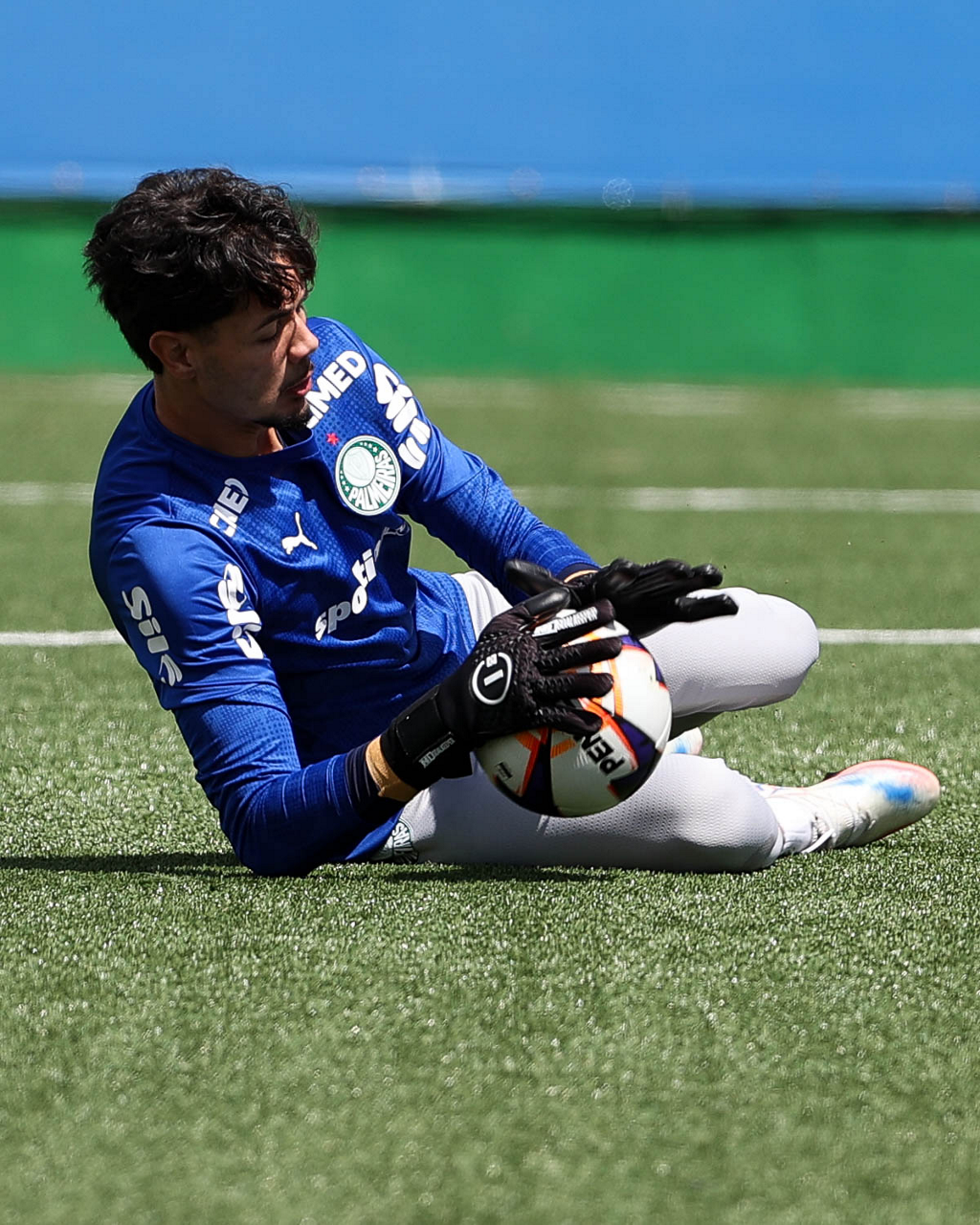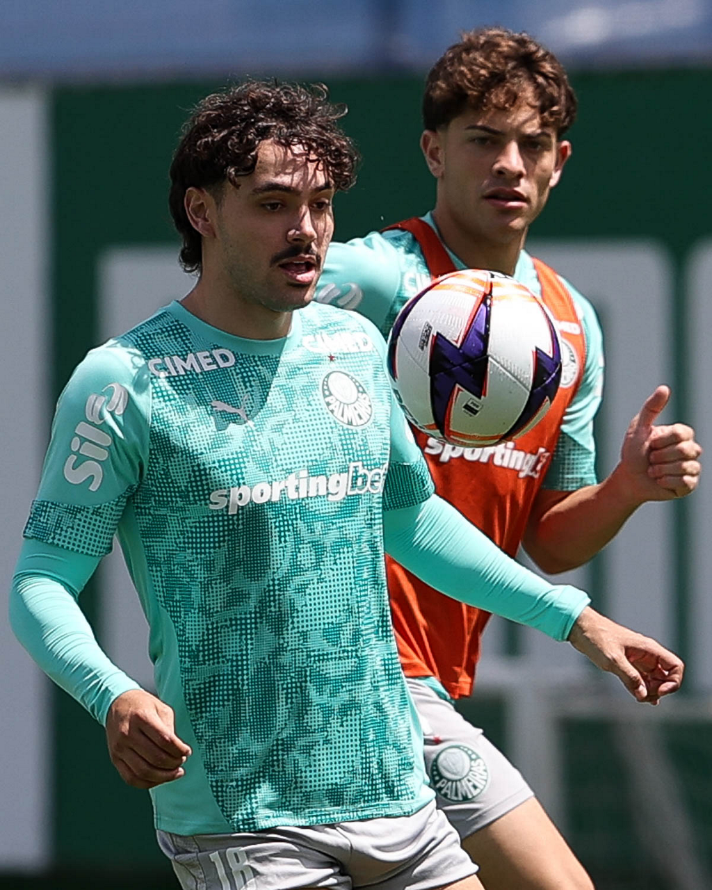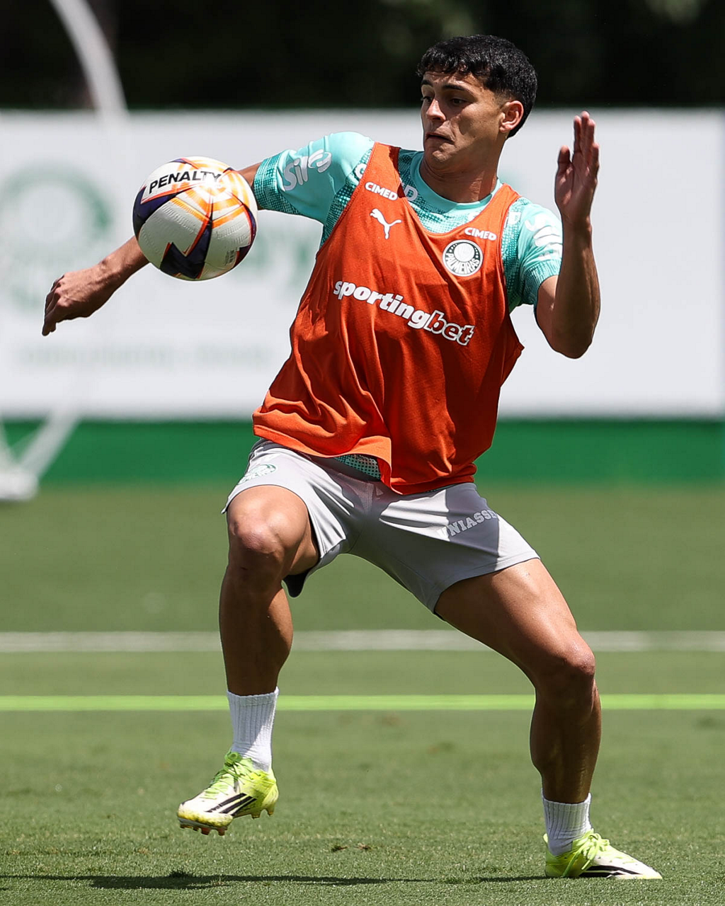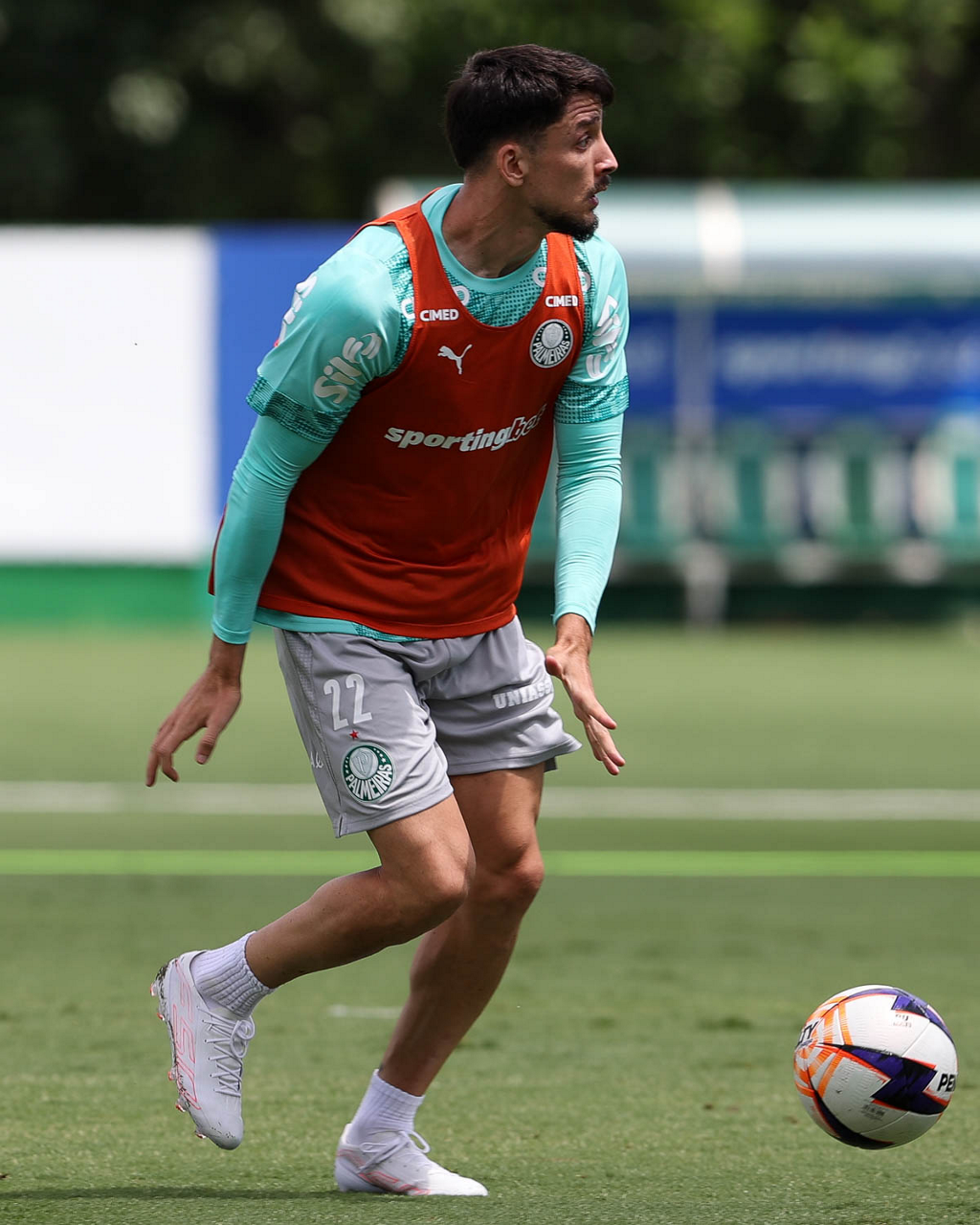 Os jogadores Sá, Larson, Carlos Miguel, Gustavo Gómez e Luighi (E/D em pé) e Vitor Roque, Arthur, Joaquín Piquerez, Ramón Sosa, Agustín Giay, Flaco López, Emiliano Martínez e Jhon Arias (E/D agachados), da SE Palmeiras, durante treinamento, na Academia de Futebol. (Foto: Cesar Greco/Palmeiras/by Canon)