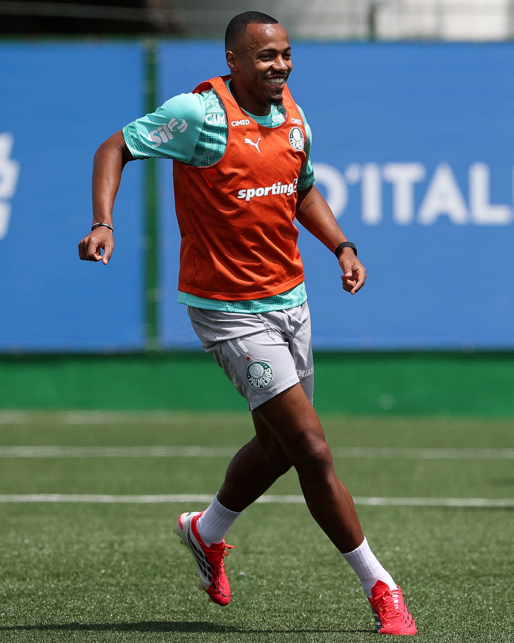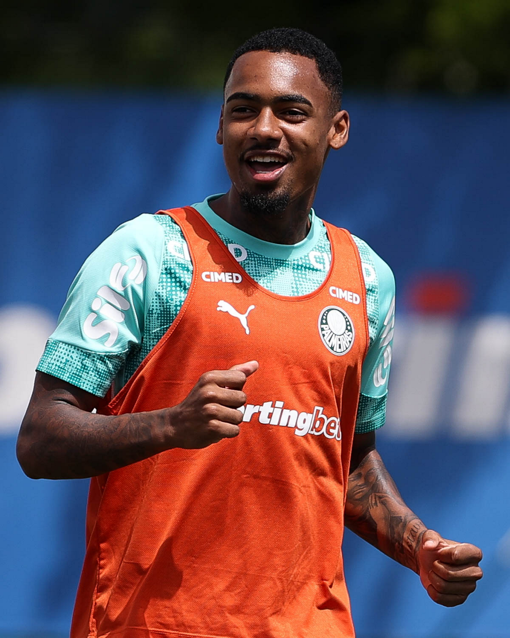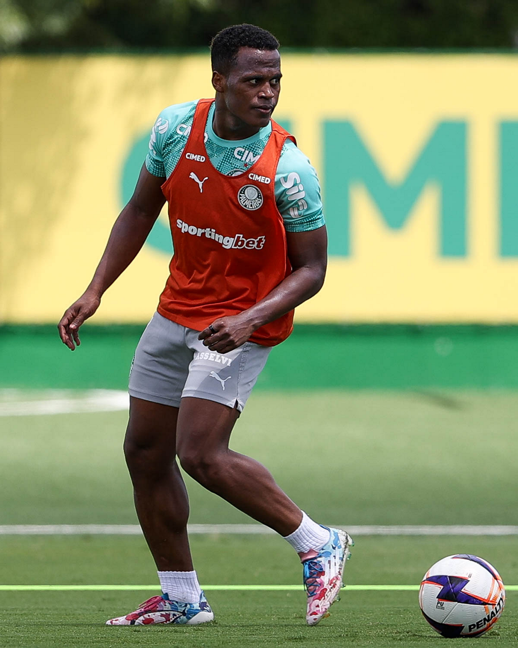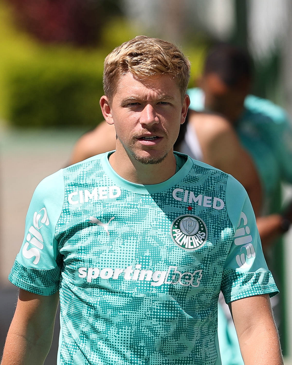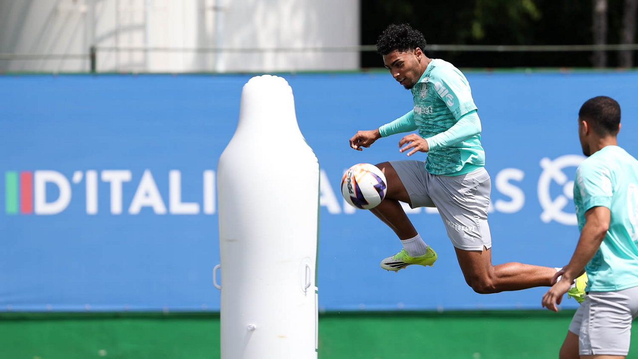 Os jogadores Sá, Larson, Carlos Miguel, Gustavo Gómez e Luighi (E/D em pé) e Vitor Roque, Arthur, Joaquín Piquerez, Ramón Sosa, Agustín Giay, Flaco López, Emiliano Martínez e Jhon Arias (E/D agachados), da SE Palmeiras, durante treinamento, na Academia de Futebol. (Foto: Cesar Greco/Palmeiras/by Canon)