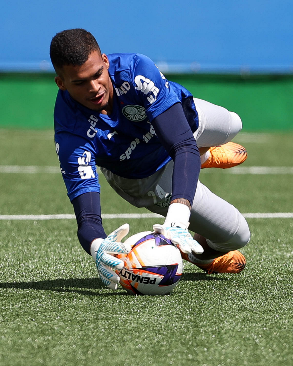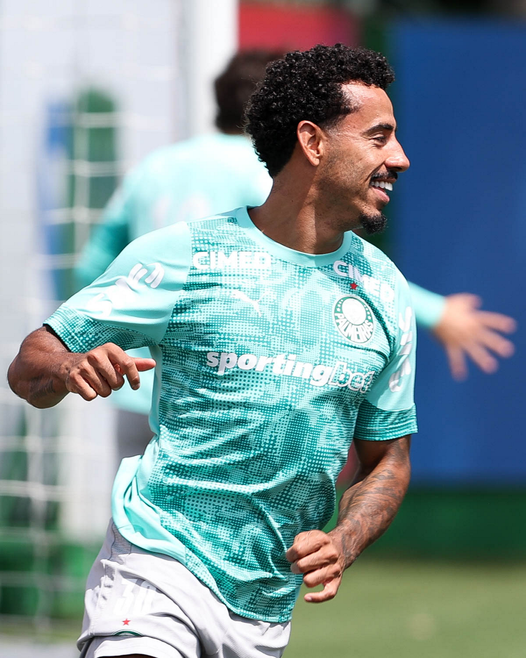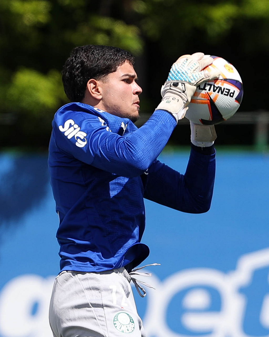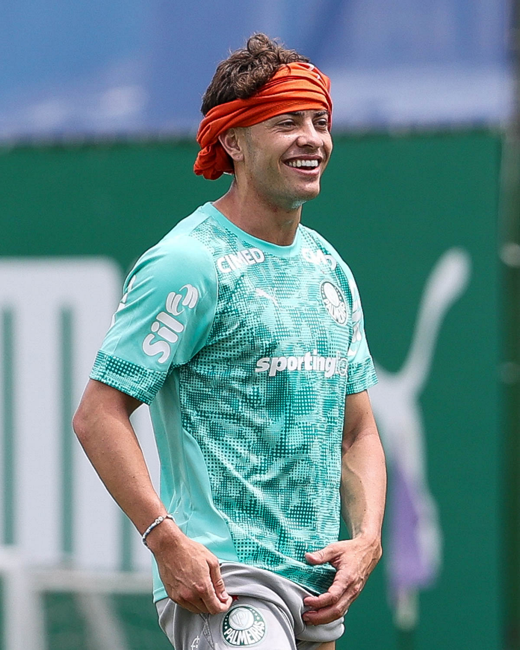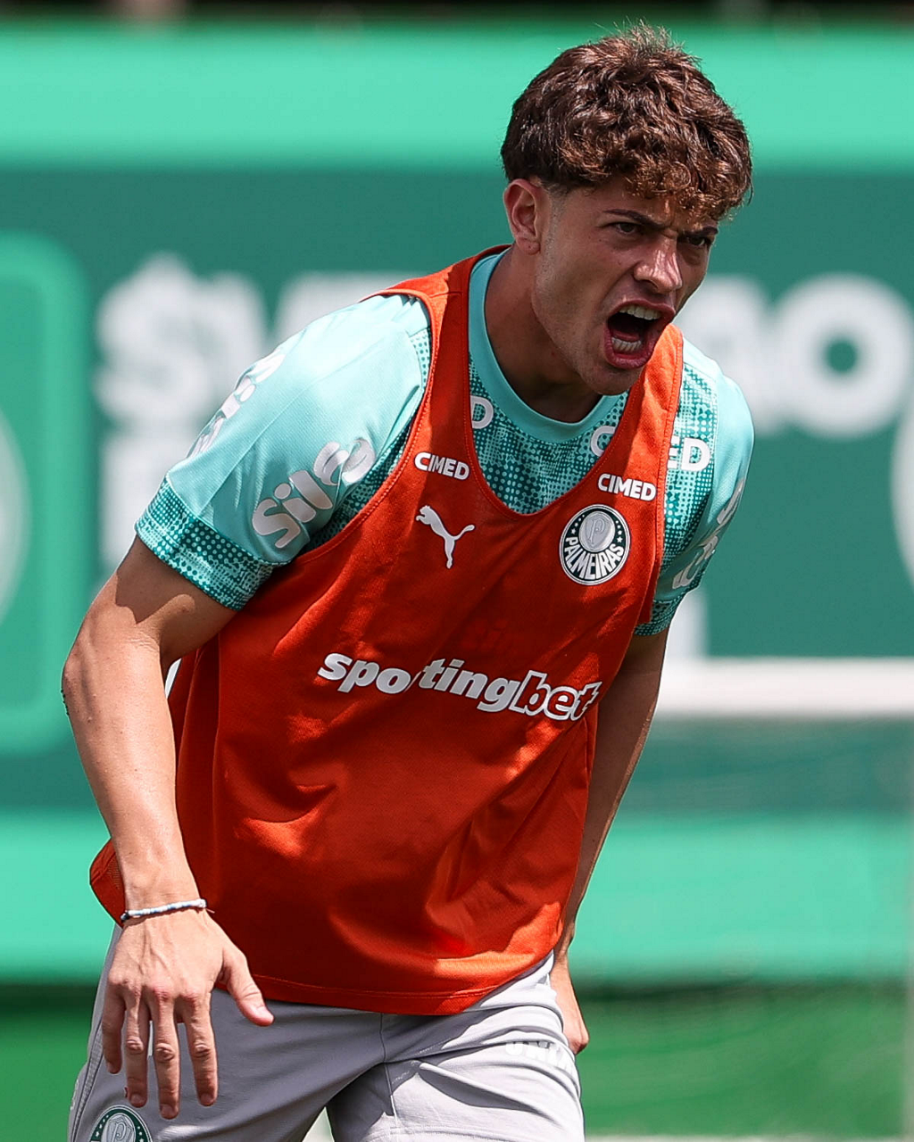 Os jogadores Sá, Larson, Carlos Miguel, Gustavo Gómez e Luighi (E/D em pé) e Vitor Roque, Arthur, Joaquín Piquerez, Ramón Sosa, Agustín Giay, Flaco López, Emiliano Martínez e Jhon Arias (E/D agachados), da SE Palmeiras, durante treinamento, na Academia de Futebol. (Foto: Cesar Greco/Palmeiras/by Canon)