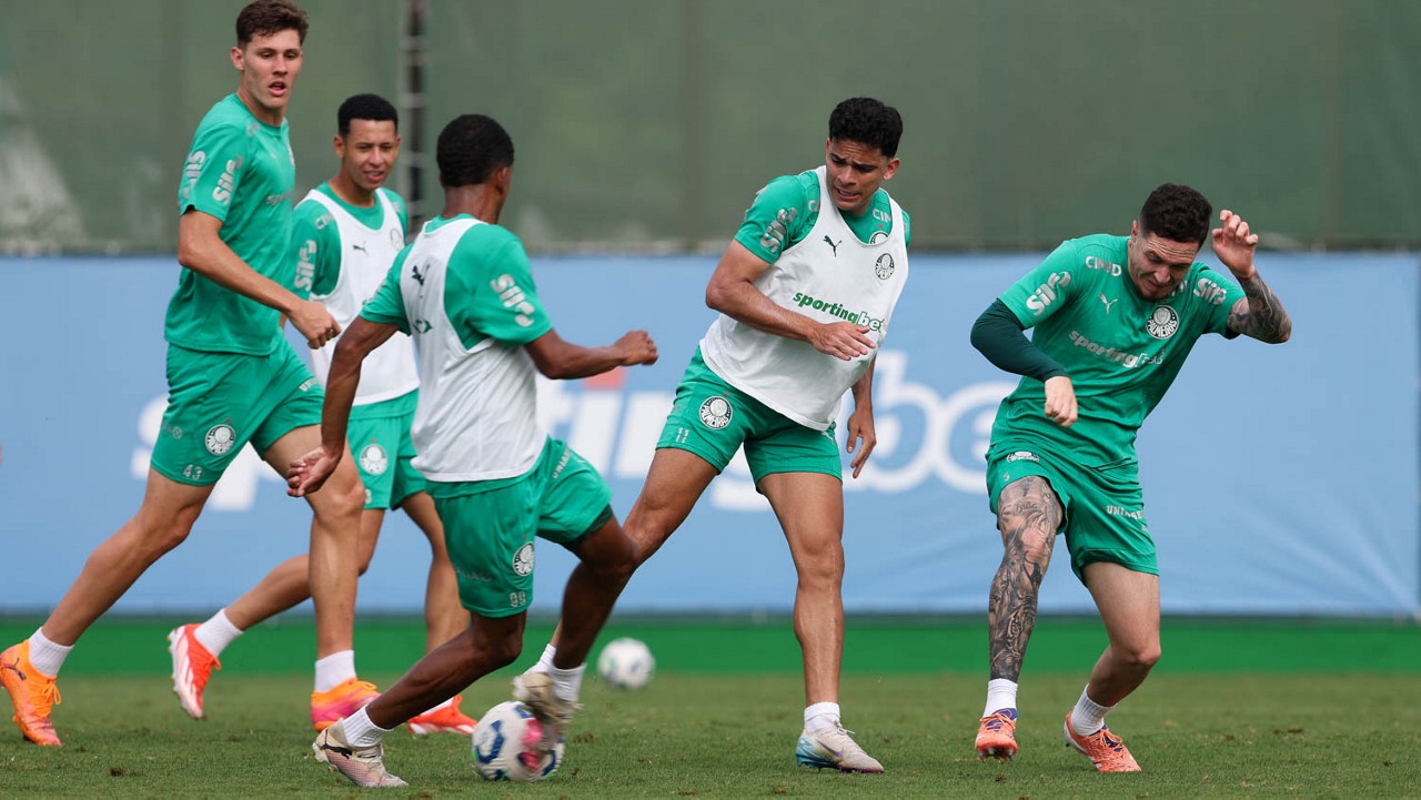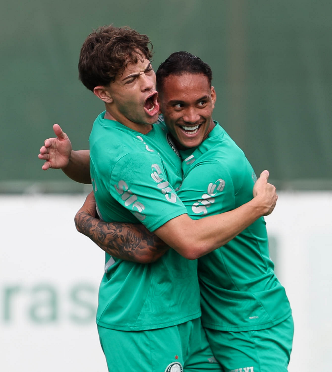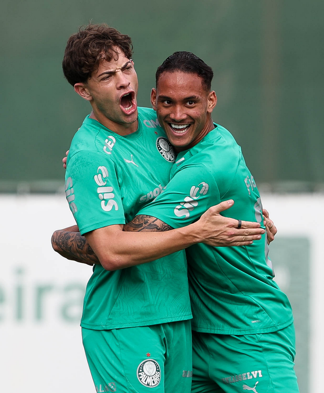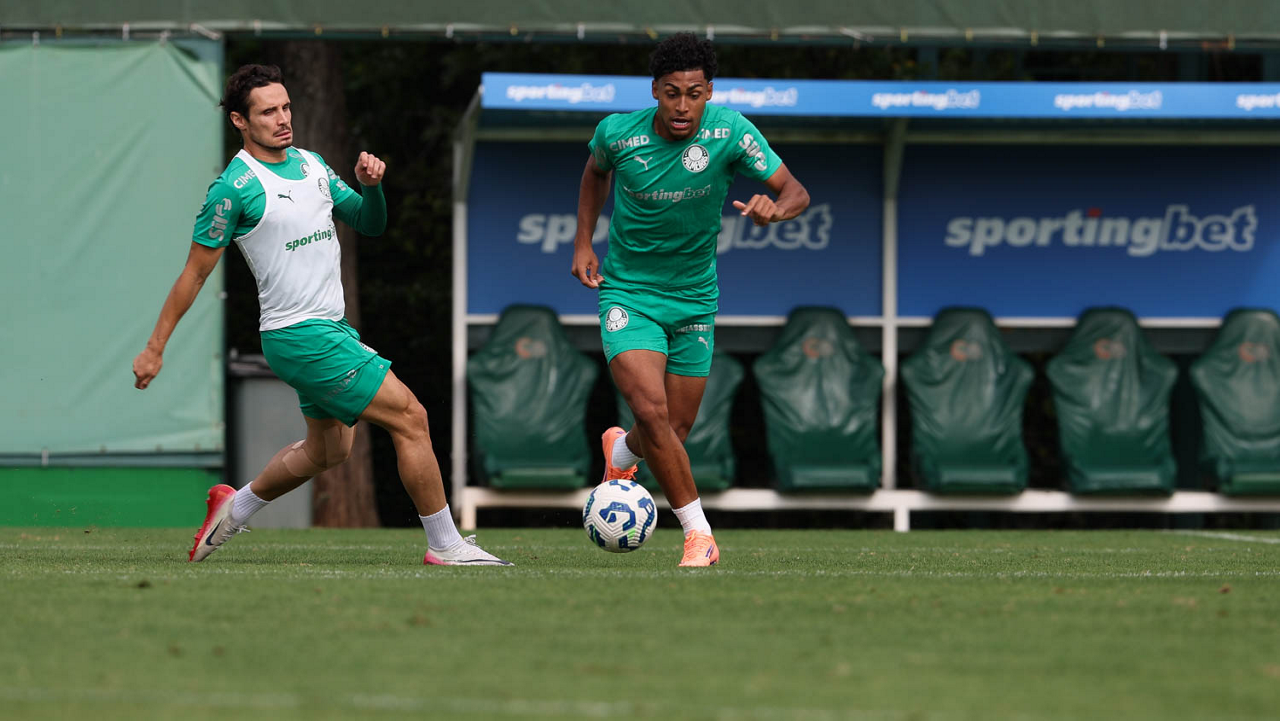 Os jogadores Raphael Veiga e Luighi (D), da SE Palmeiras, durante treinamento, na Academia de Futebol. (Foto: Cesar Greco/Palmeiras/by Canon)