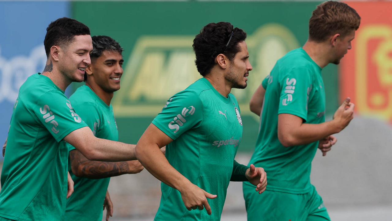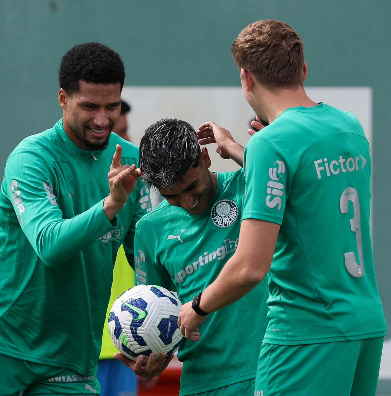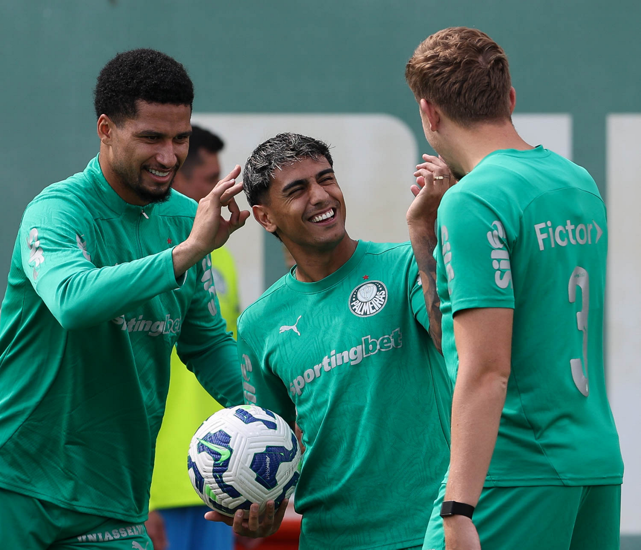 Os jogadores Murilo, Facundo Torres e Bruno Fuchs (E/D), da SE Palmeiras, durante treinamento, na Academia de Futebol. (Foto: Cesar Greco/Palmeiras/by Canon)