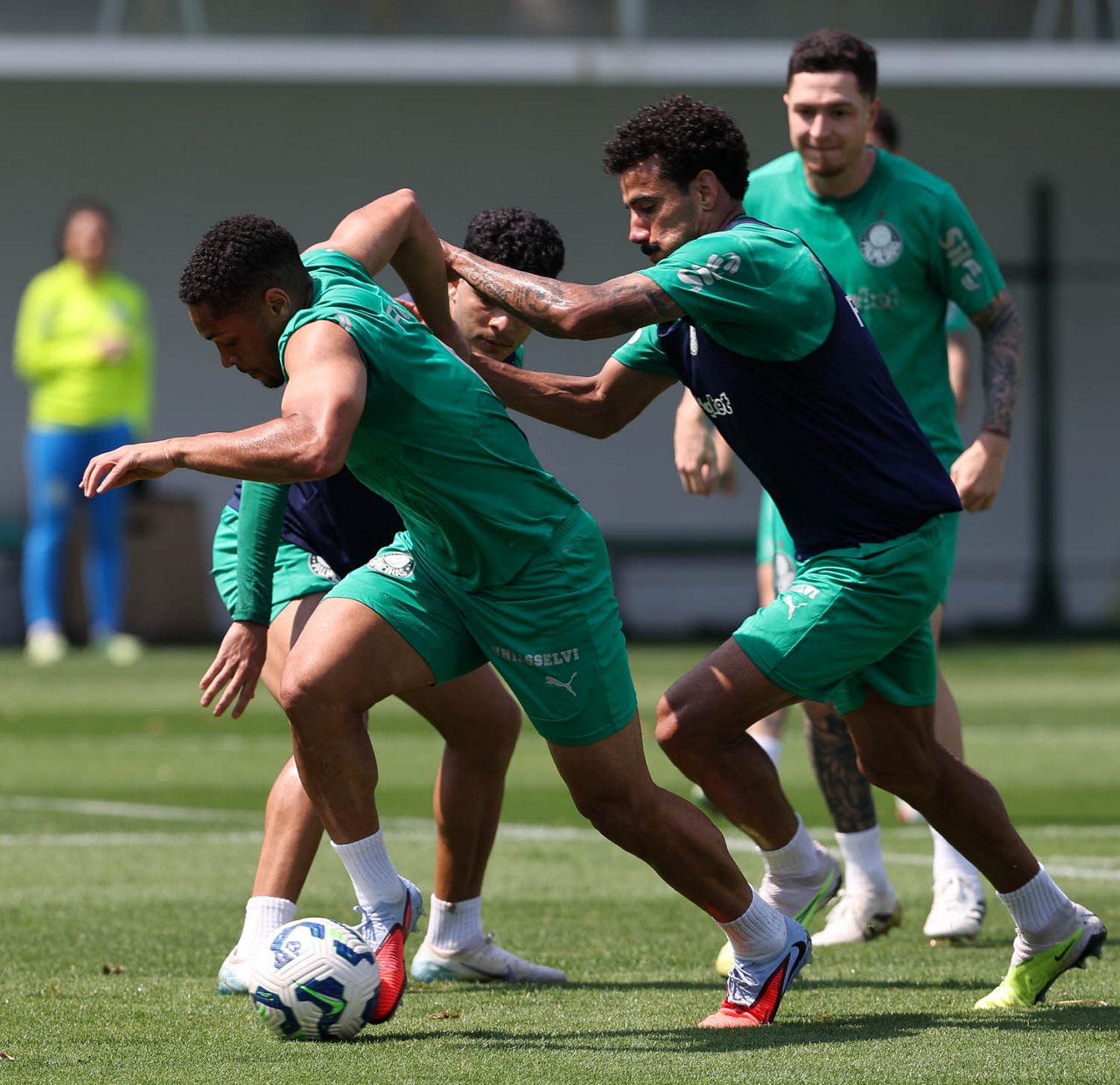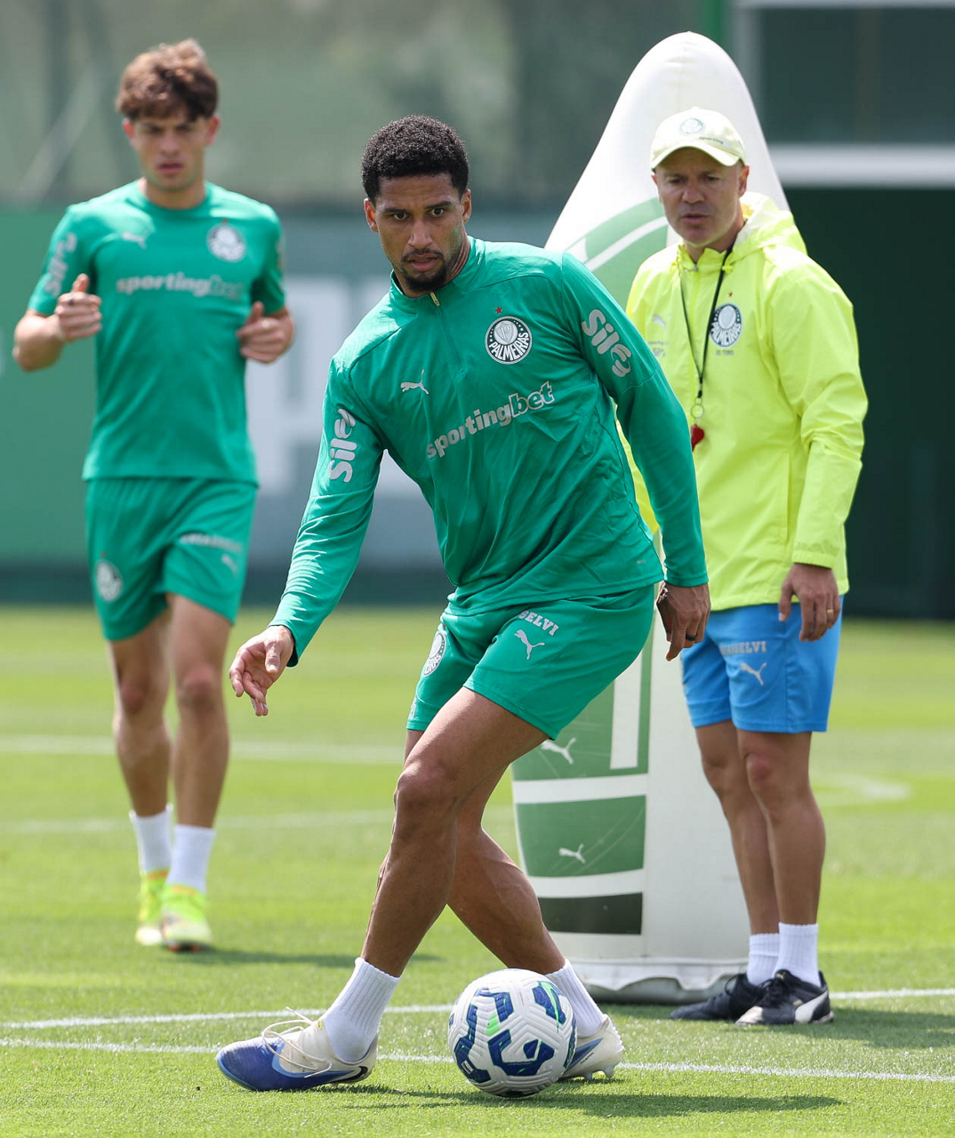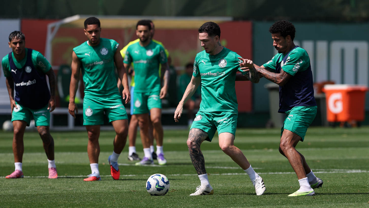 Os jogadores Murilo, Facundo Torres e Bruno Fuchs (E/D), da SE Palmeiras, durante treinamento, na Academia de Futebol. (Foto: Cesar Greco/Palmeiras/by Canon)