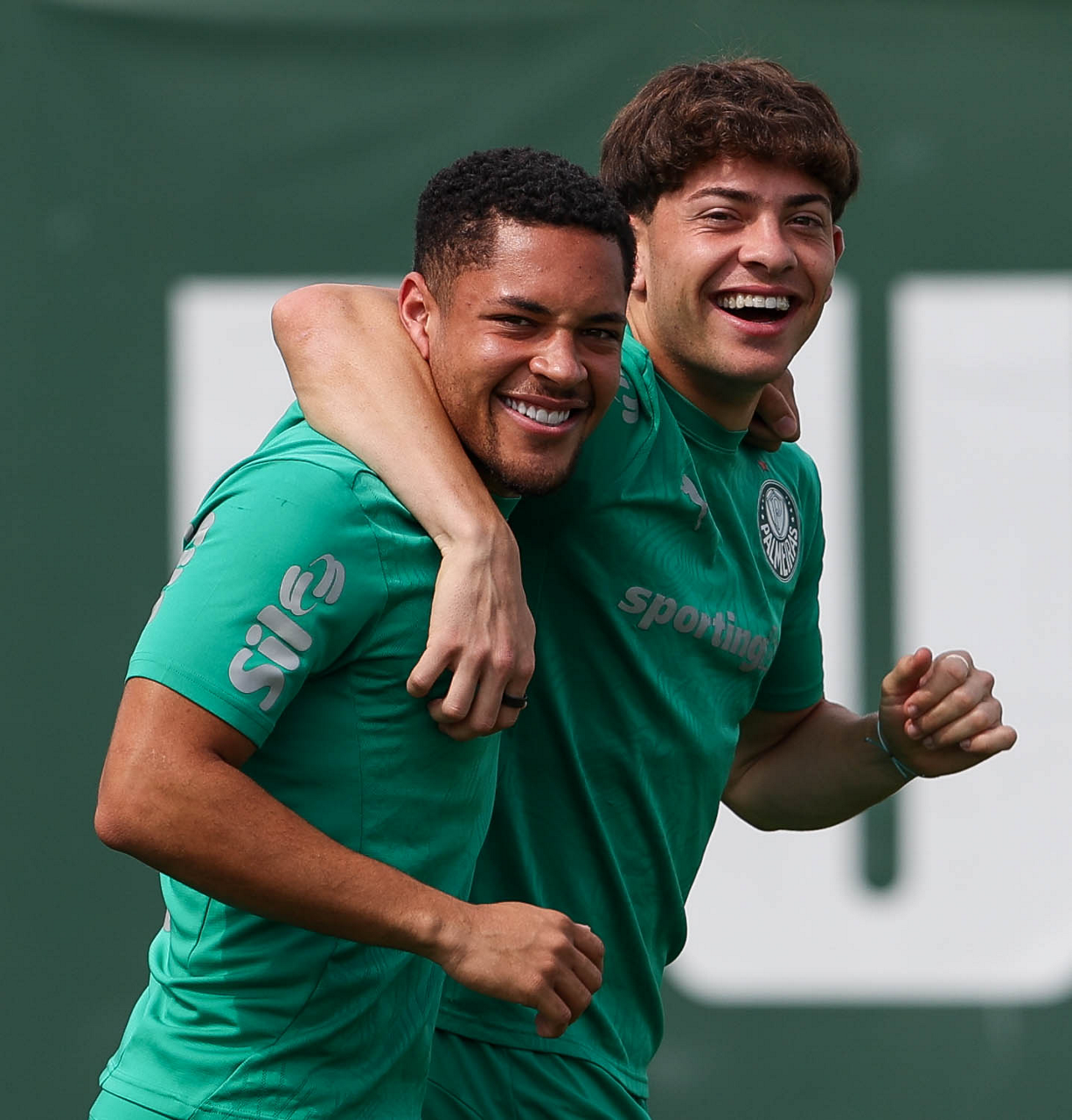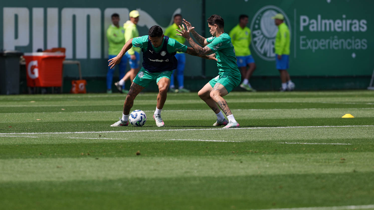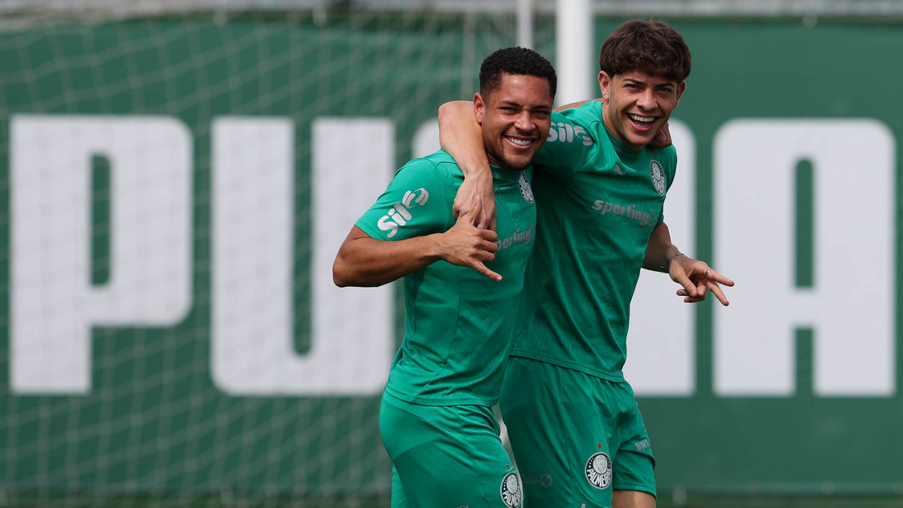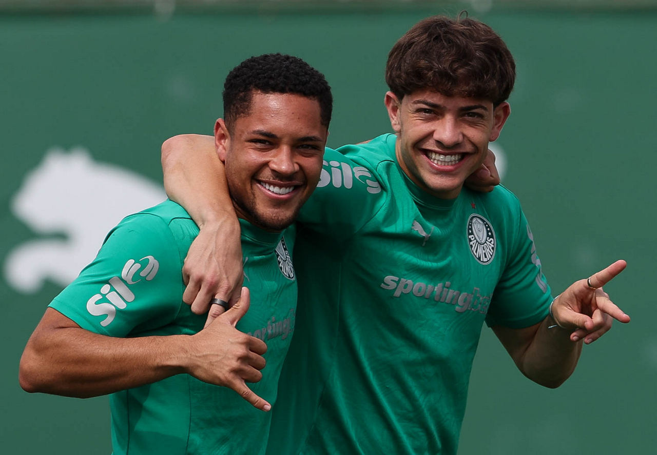 Os jogadores Vitor Roque e Agustín Giay (D), dda SE Palmeiras, durante treinamento, na Academia de Futebol. (Foto: Cesar Greco/Palmeiras/by Canon)