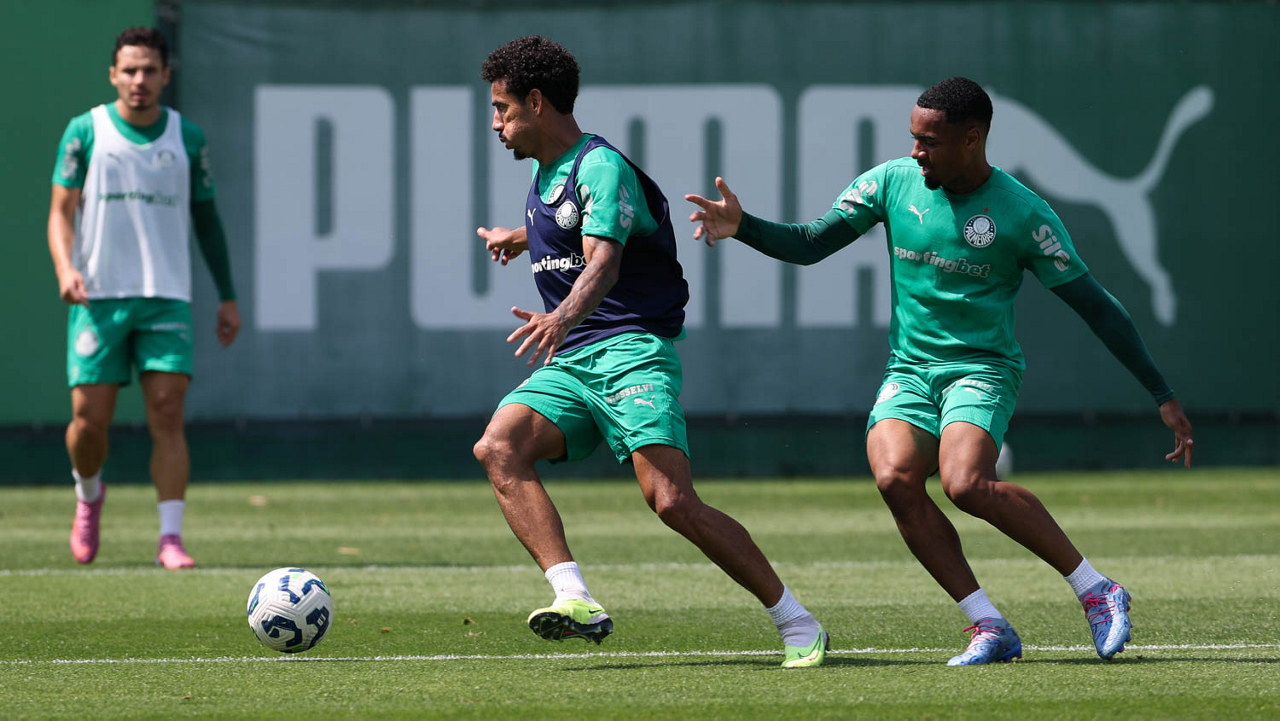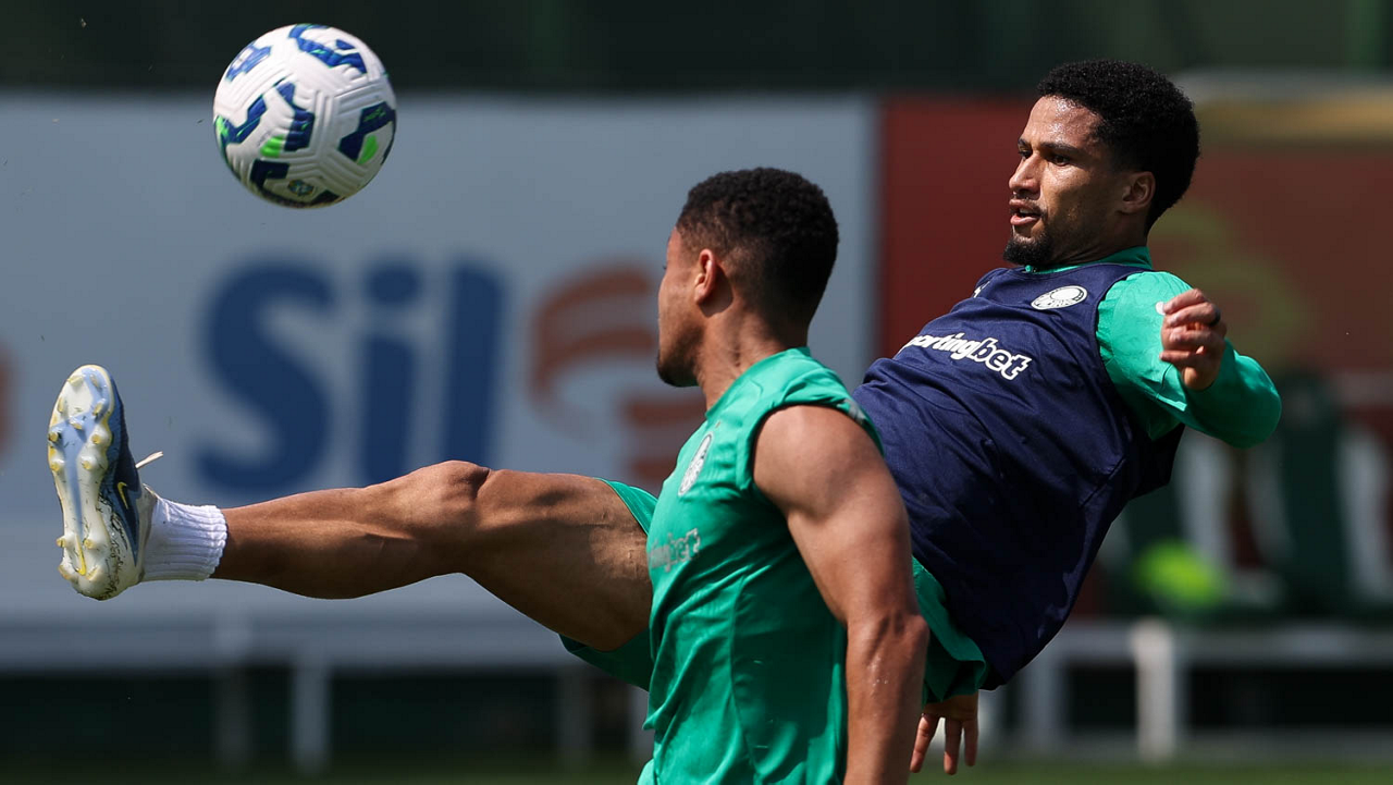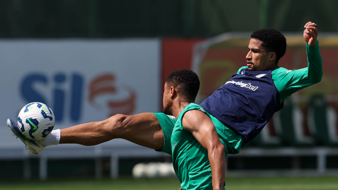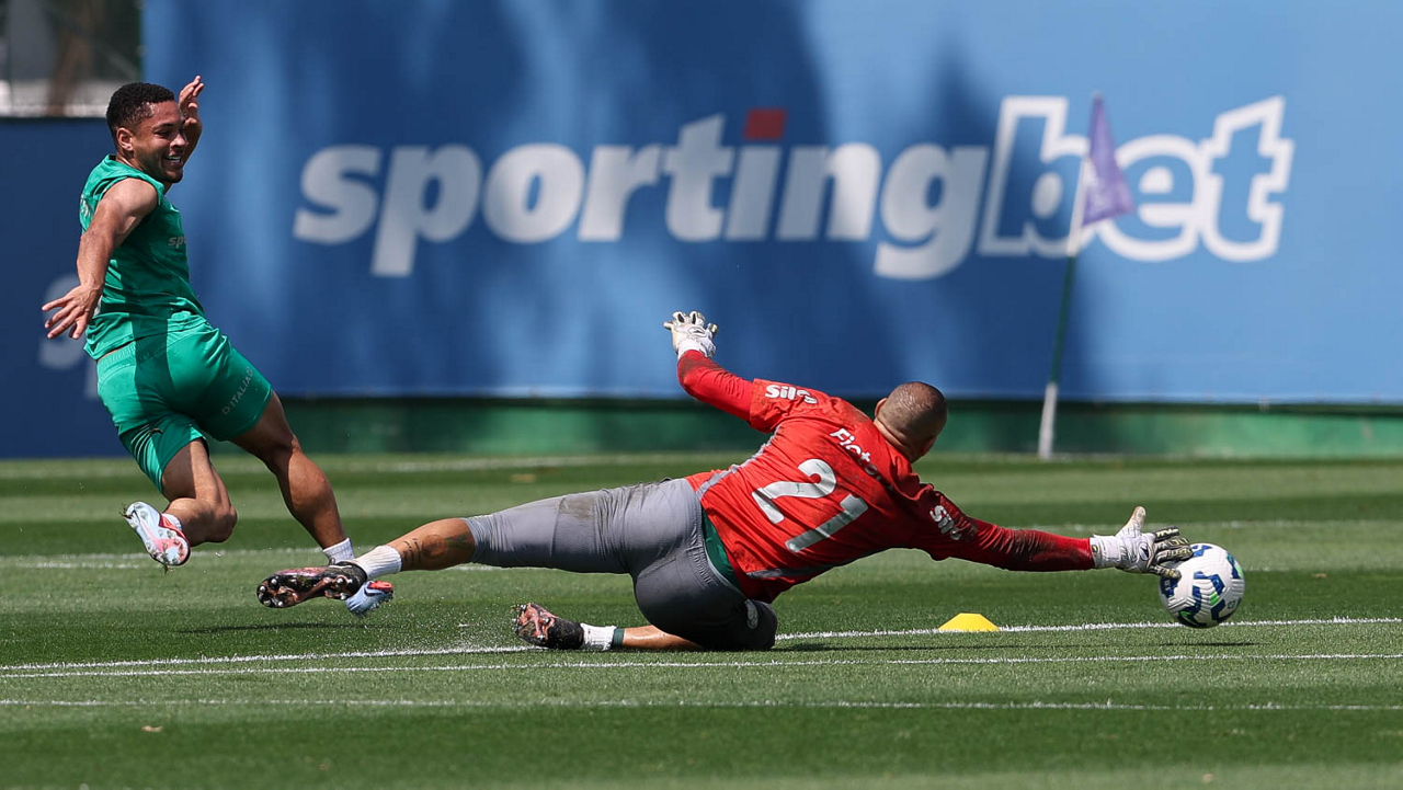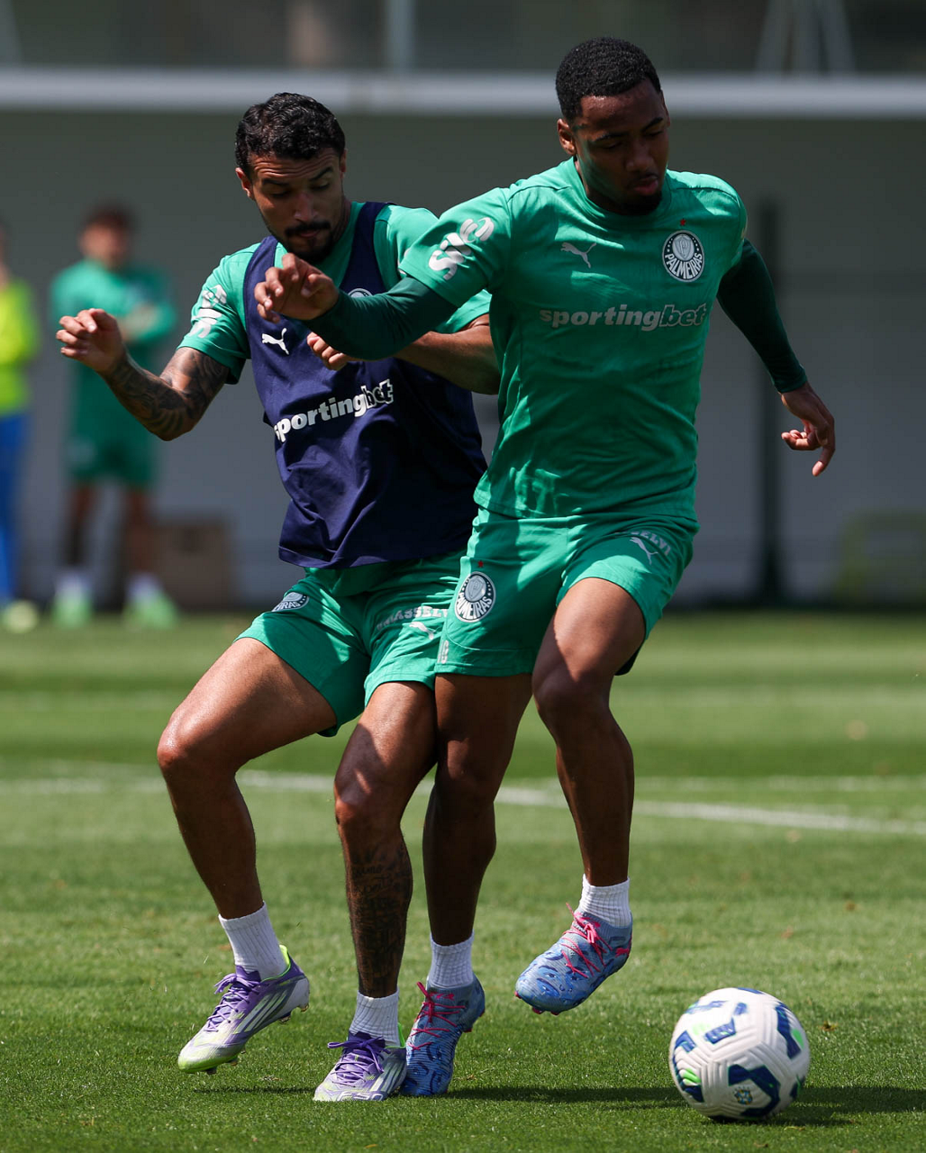 O jogador Vitor Roque e o goleiro Weverton (D), da SE Palmeiras, durante treinamento, na Academia de Futebol. (Foto: Cesar Greco/Palmeiras/by Canon)