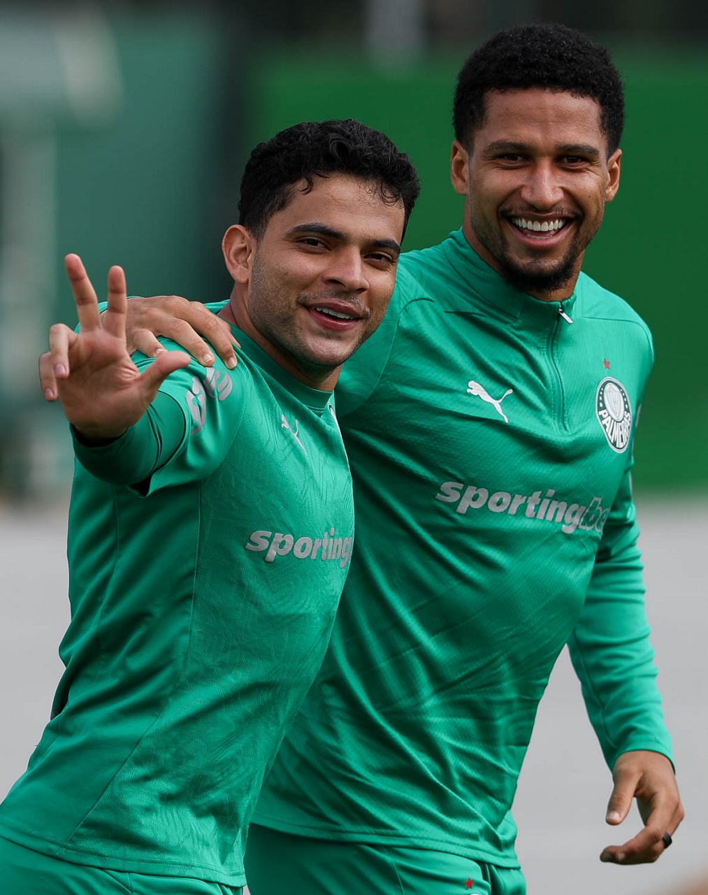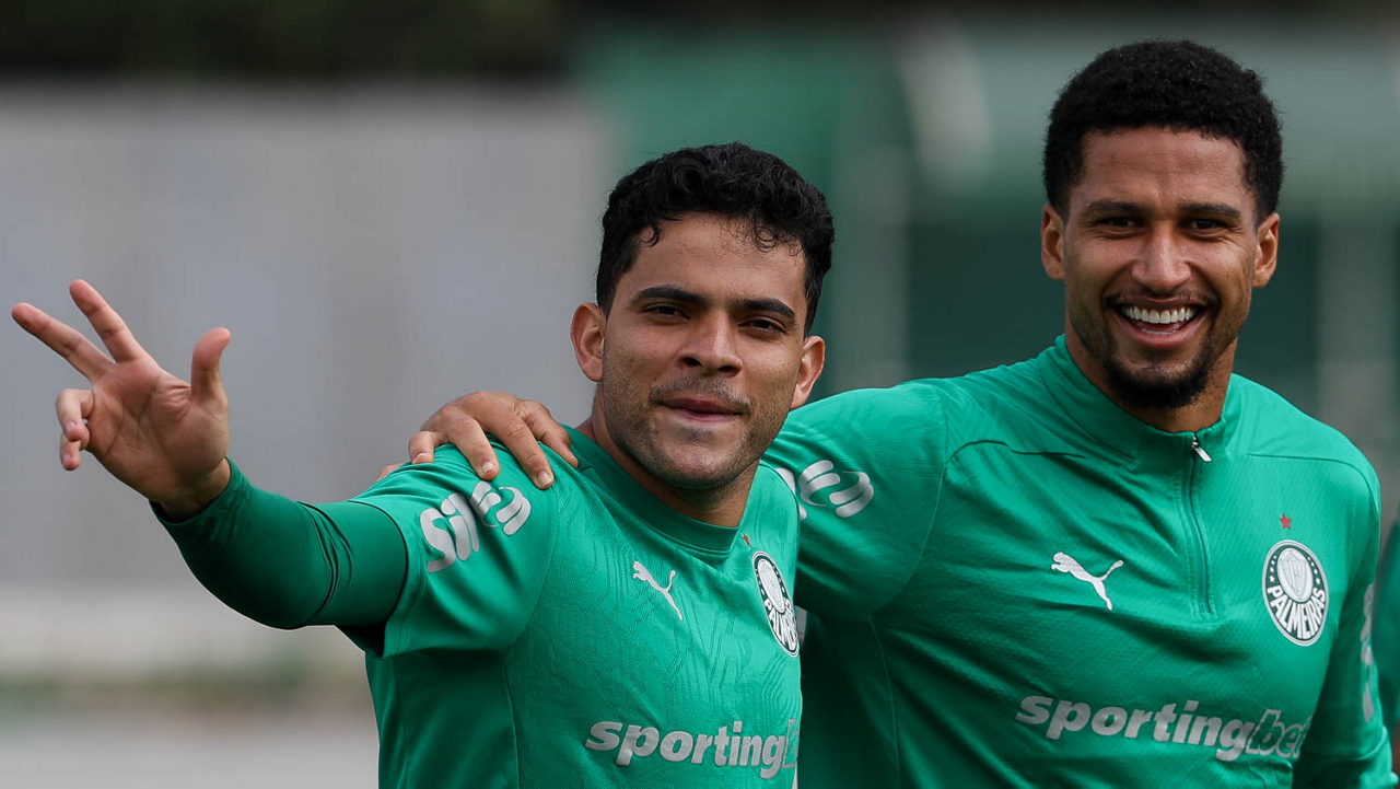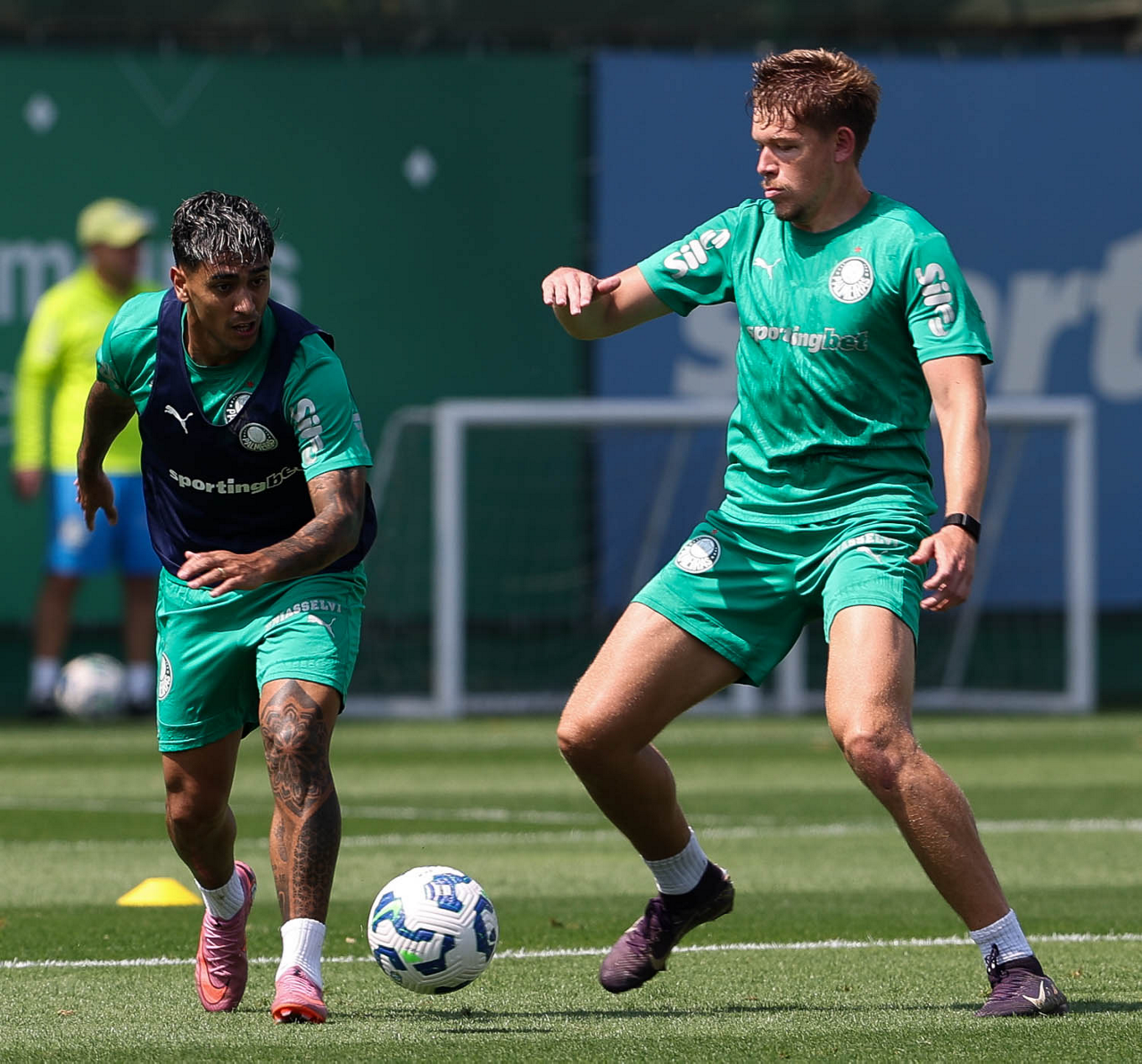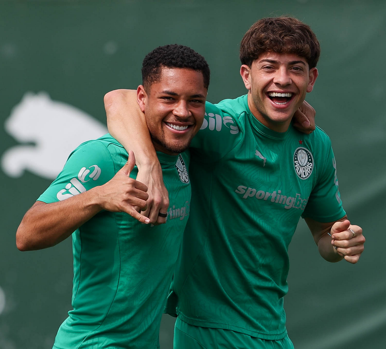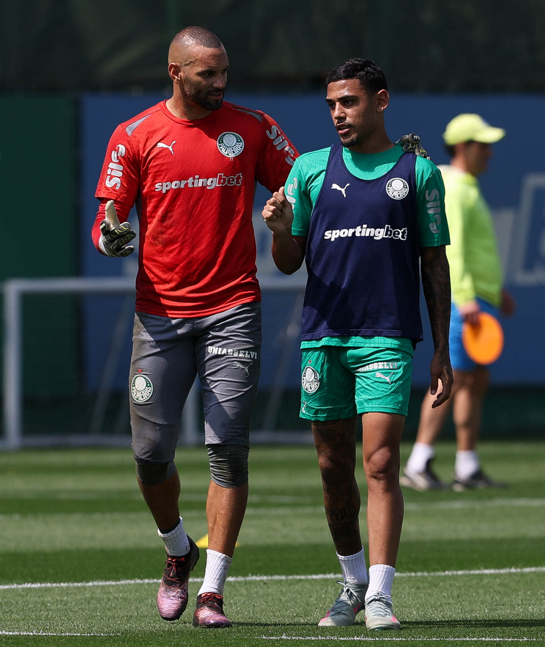 O jogador Vitor Roque e o goleiro Weverton (D), da SE Palmeiras, durante treinamento, na Academia de Futebol. (Foto: Cesar Greco/Palmeiras/by Canon)