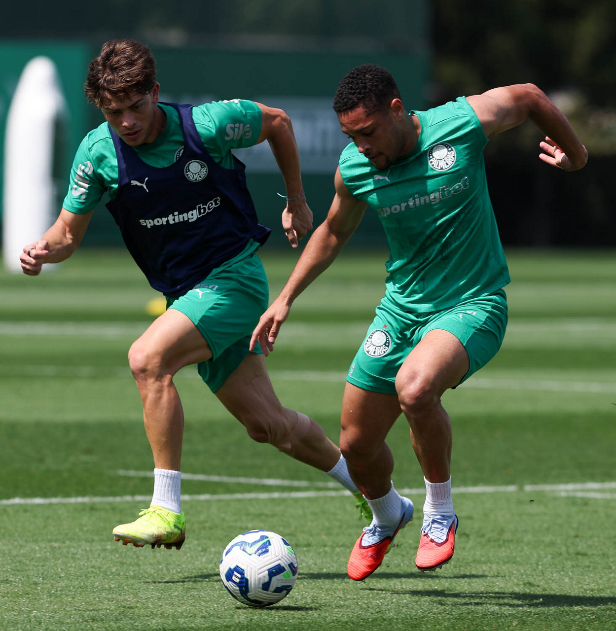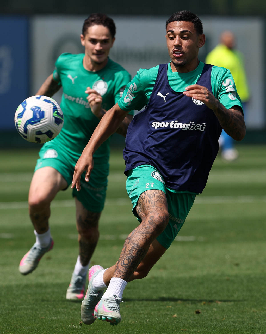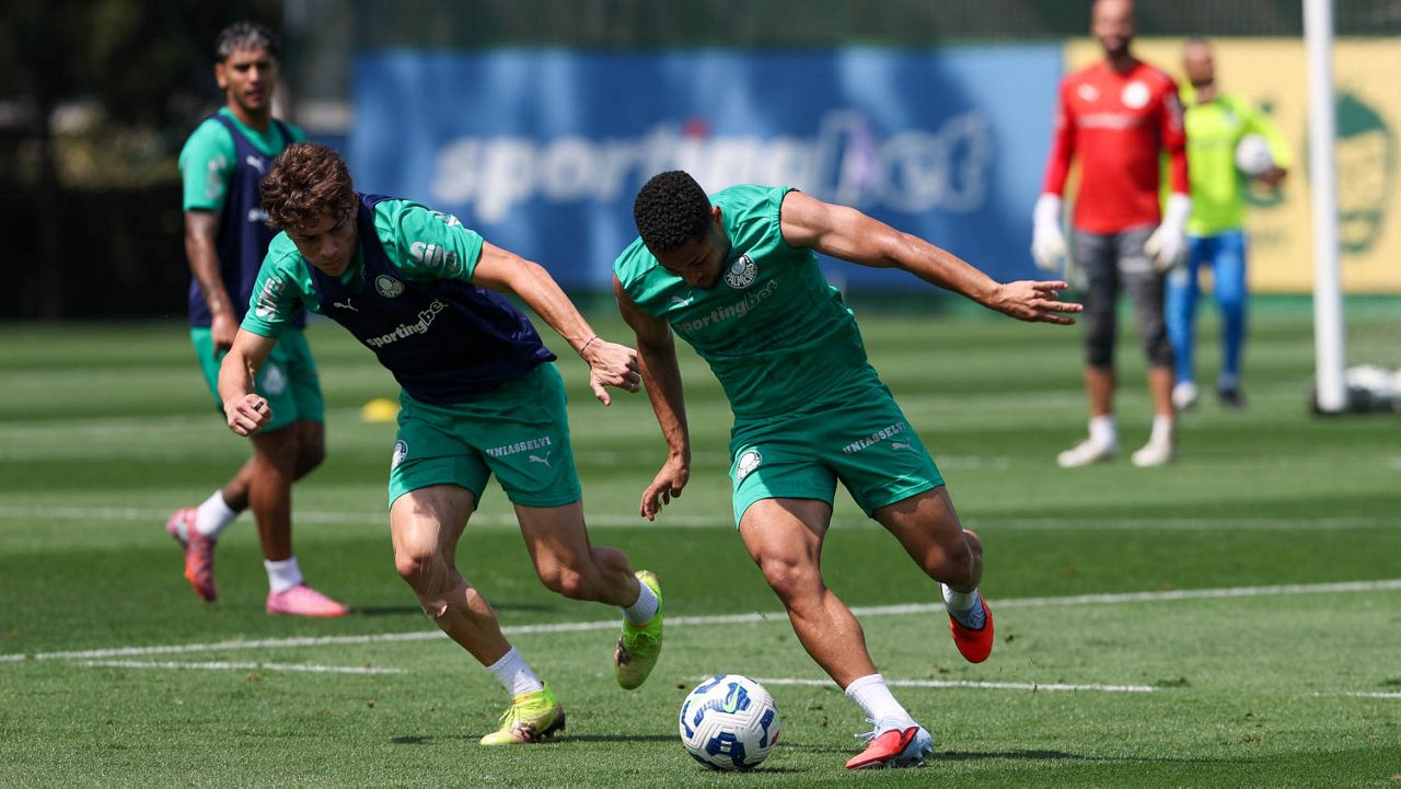 Os jogadores Vitor Roque e Lucas Evangelista (D), da SE Palmeiras, durante treinamento, na Academia de Futebol. (Foto: Cesar Greco/Palmeiras/by Canon)