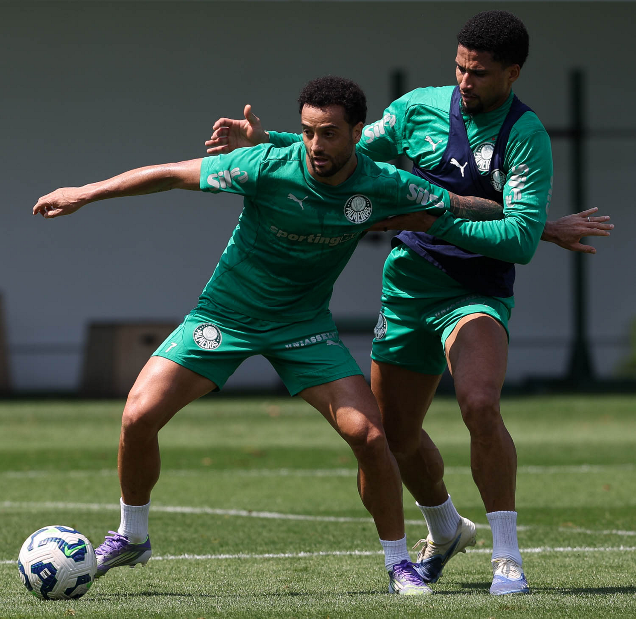 Os jogadores Bruno Rodrigues e Anibal Moreno (D), da SE Palmeiras, durante treinamento, na Academia de Futebol. (Foto: Cesar Greco/Palmeiras/by Canon)