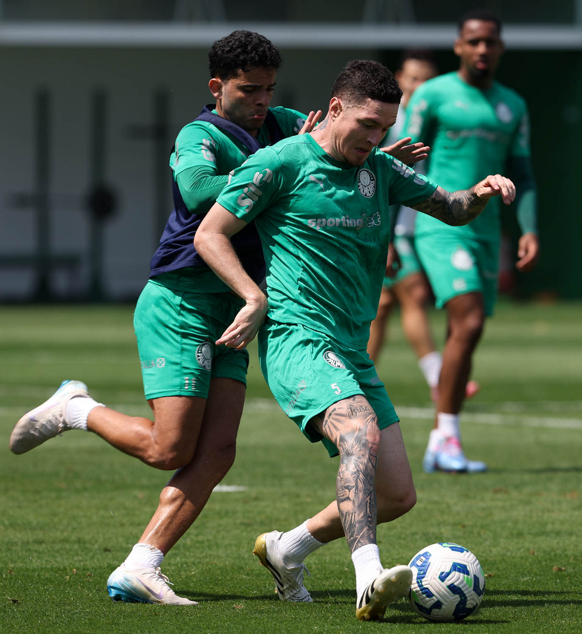 Os jogadores Agustín Giay e Vitor Roque (D), da SE Palmeiras, durante treinamento, na Academia de Futebol. (Foto: Cesar Greco/Palmeiras/by Canon)