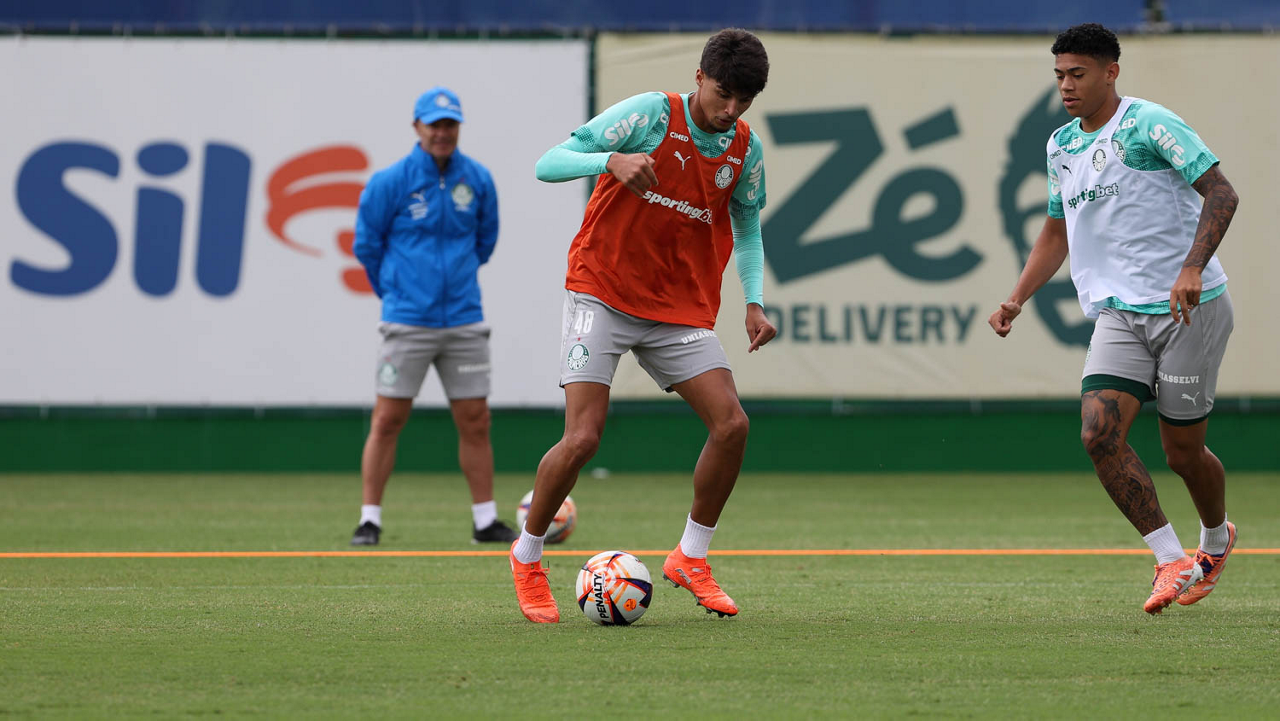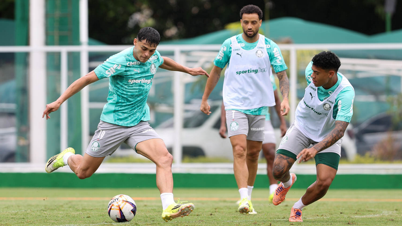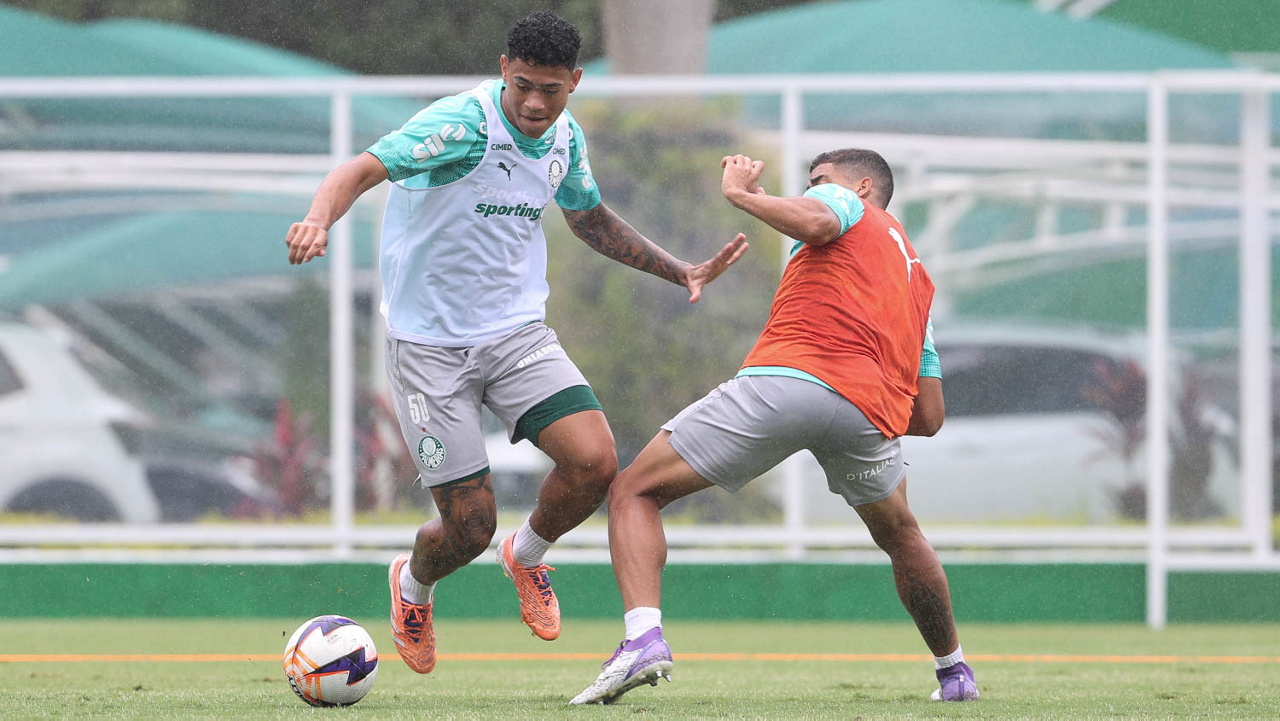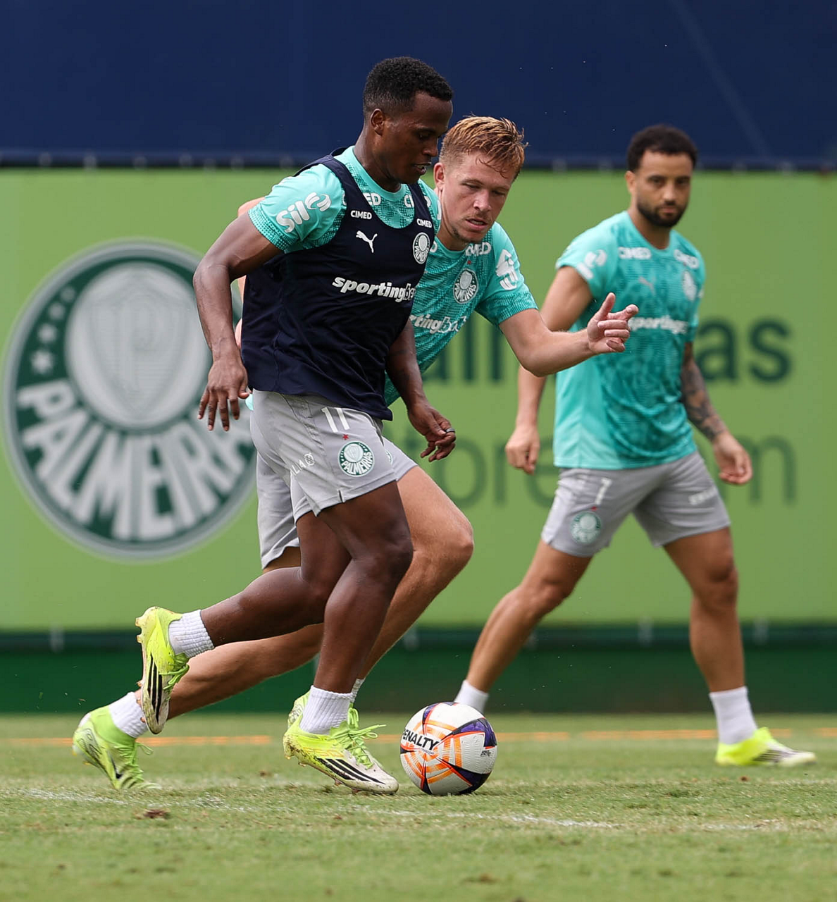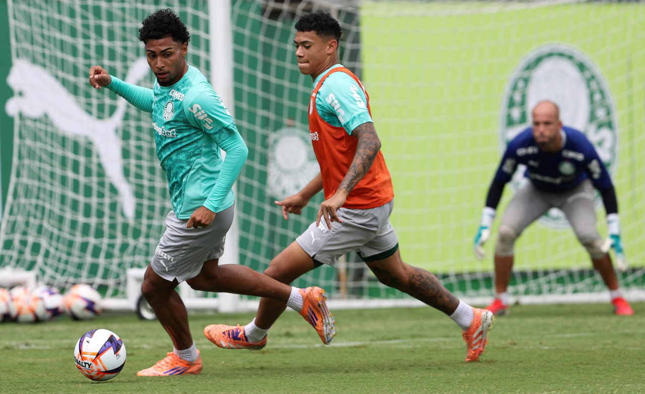 Os jogadores Jhon Arias e Bruno Fuchs (D), da SE Palmeiras, durante treinamento, na Academia de Futebol. (Foto: Cesar Greco/Palmeiras/by Canon)
