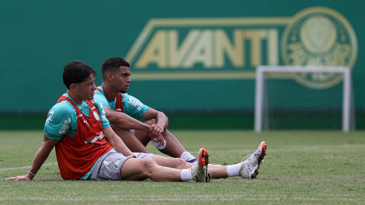 Os jogadores Bruno Fuchs e Lucas Evangelista (D), da SE Palmeiras, durante treinamento, na Academia de Futebol. (Foto: Cesar Greco/Palmeiras/by Canon)