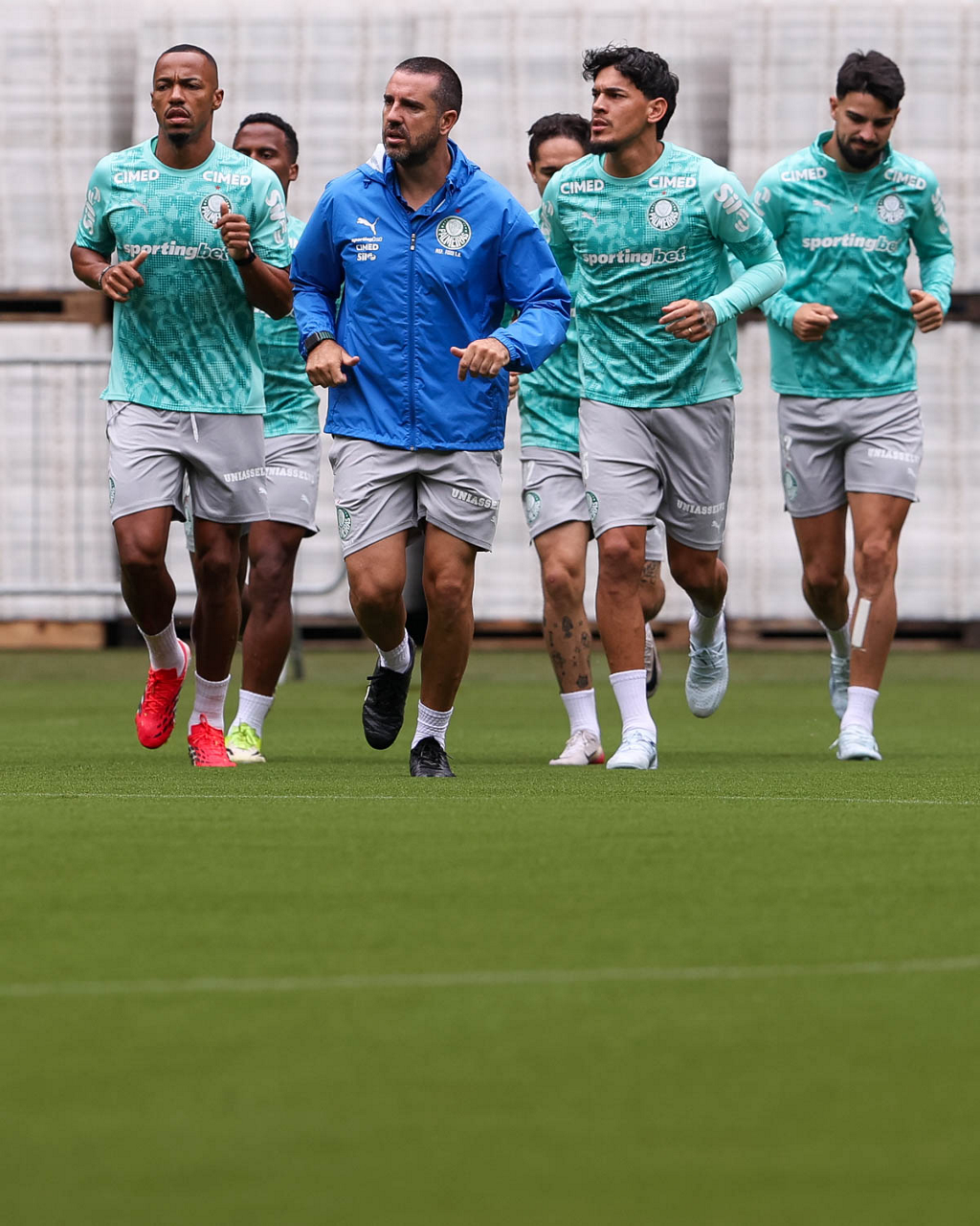 O preparador físico João Martins e os jogadores, da SE Palmeiras, durante treinamento, na arena Allianz Parque. (Foto: Cesar Greco/Palmeiras/by Canon)
