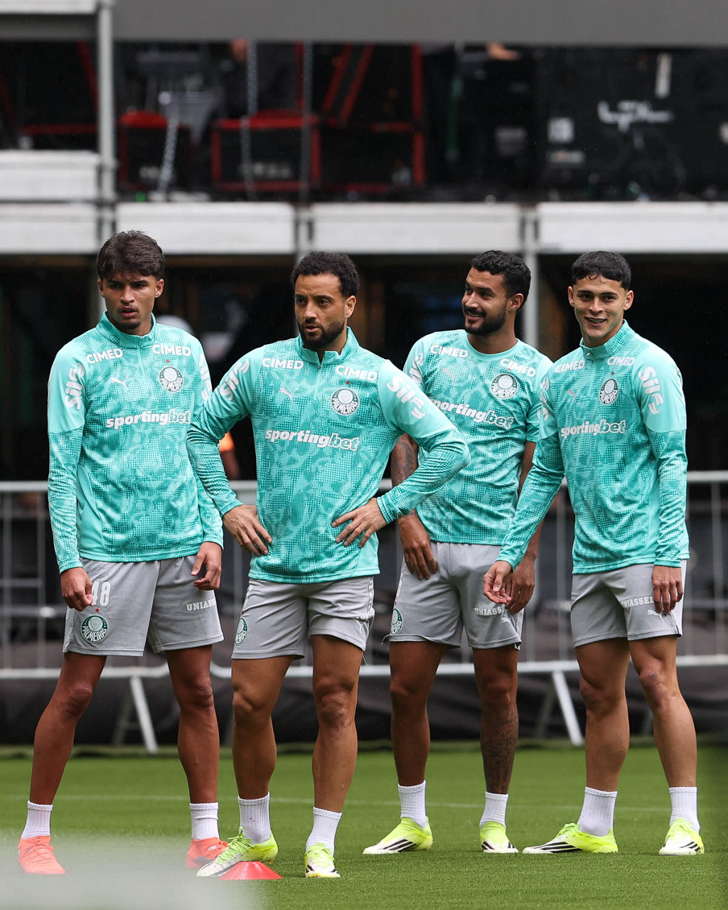Os jogadores Larson, Felipe Anderson, Jefté e Ramón Sosa (E/D), da SE Palmeiras, durante treinamento, na arena Allianz Parque. (Foto: Cesar Greco/Palmeiras/by Canon)