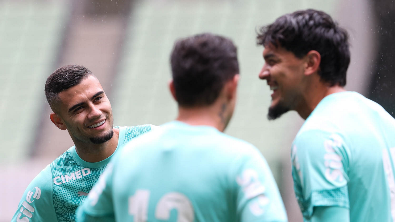 O preparador físico João Martins e os jogadores Gustavo Gómez, Andreas Pereira, Flaco López, Khellven, Marlon Freitas e Jhon Arias (D/E), da SE Palmeiras, durante treinamento, na arena Allianz Parque. (Foto: Cesar Greco/Palmeiras/by Canon)