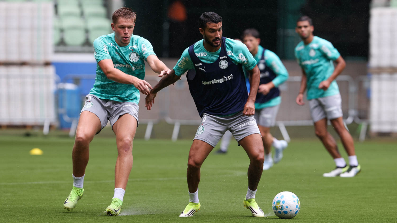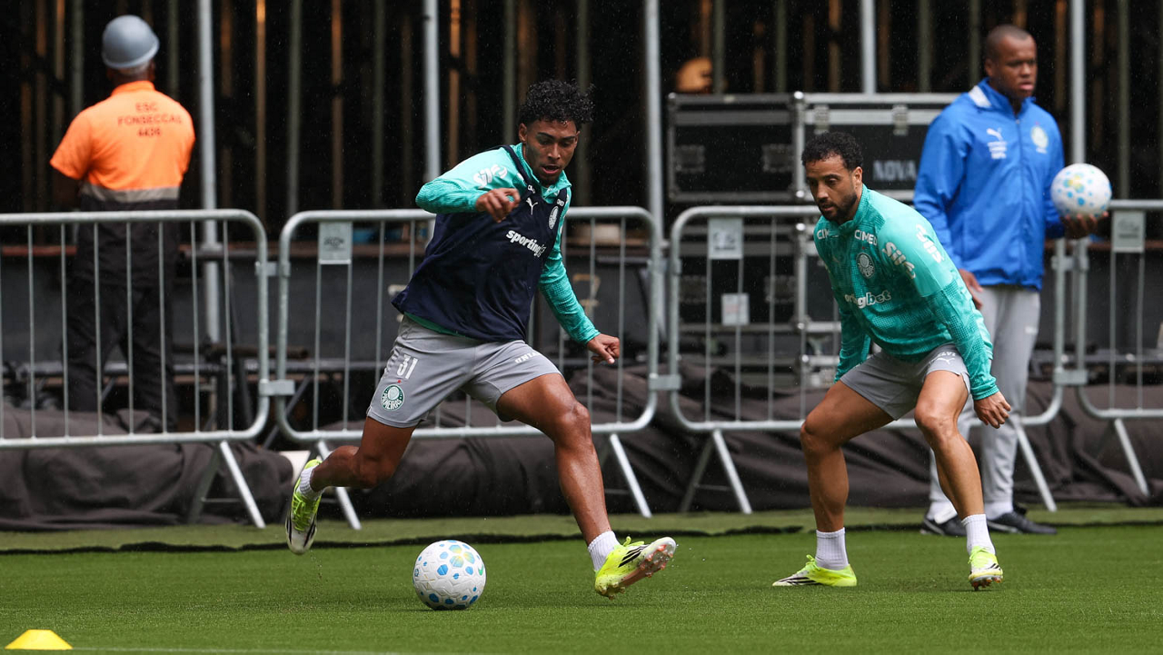 Os jogadores Bruno Fuchs e Jefté (D), da SE Palmeiras, durante treinamento, na arena Allianz Parque. (Foto: Cesar Greco/Palmeiras/by Canon)