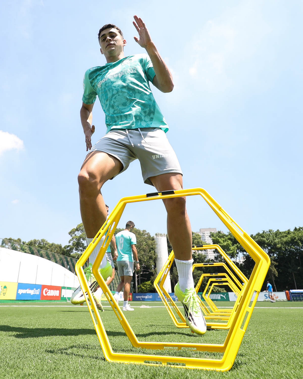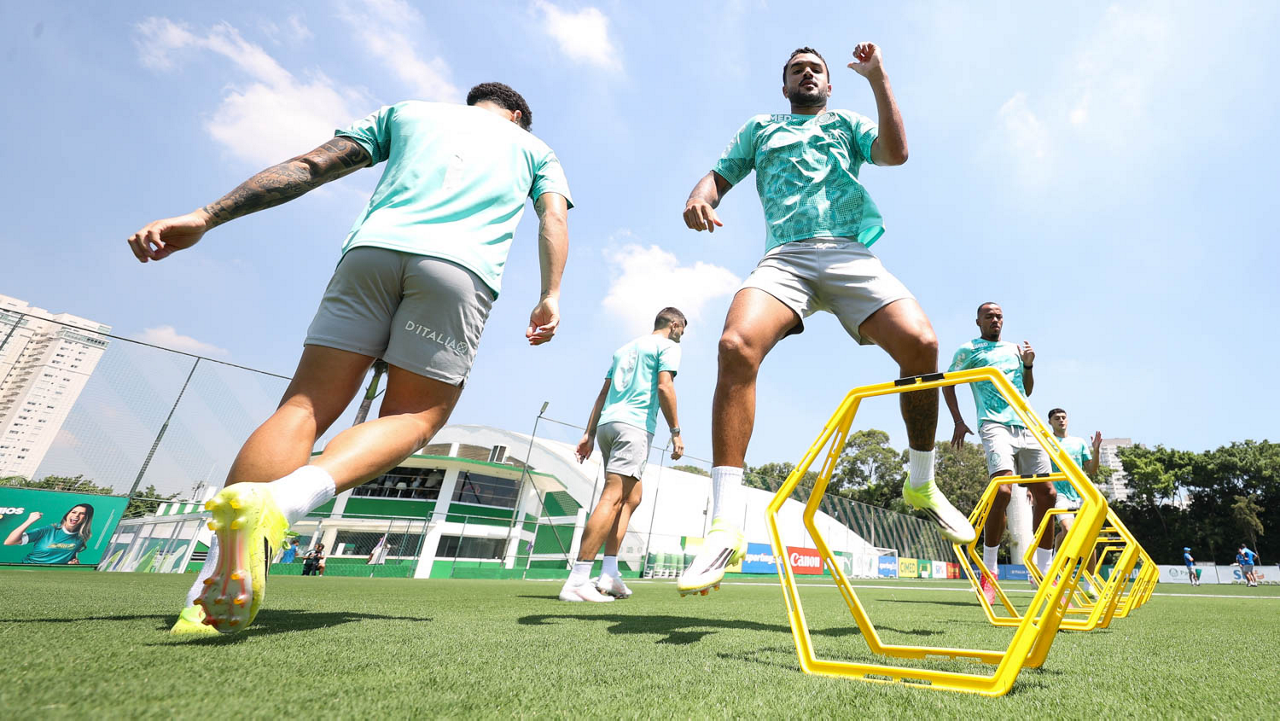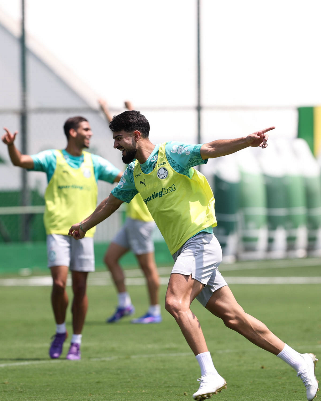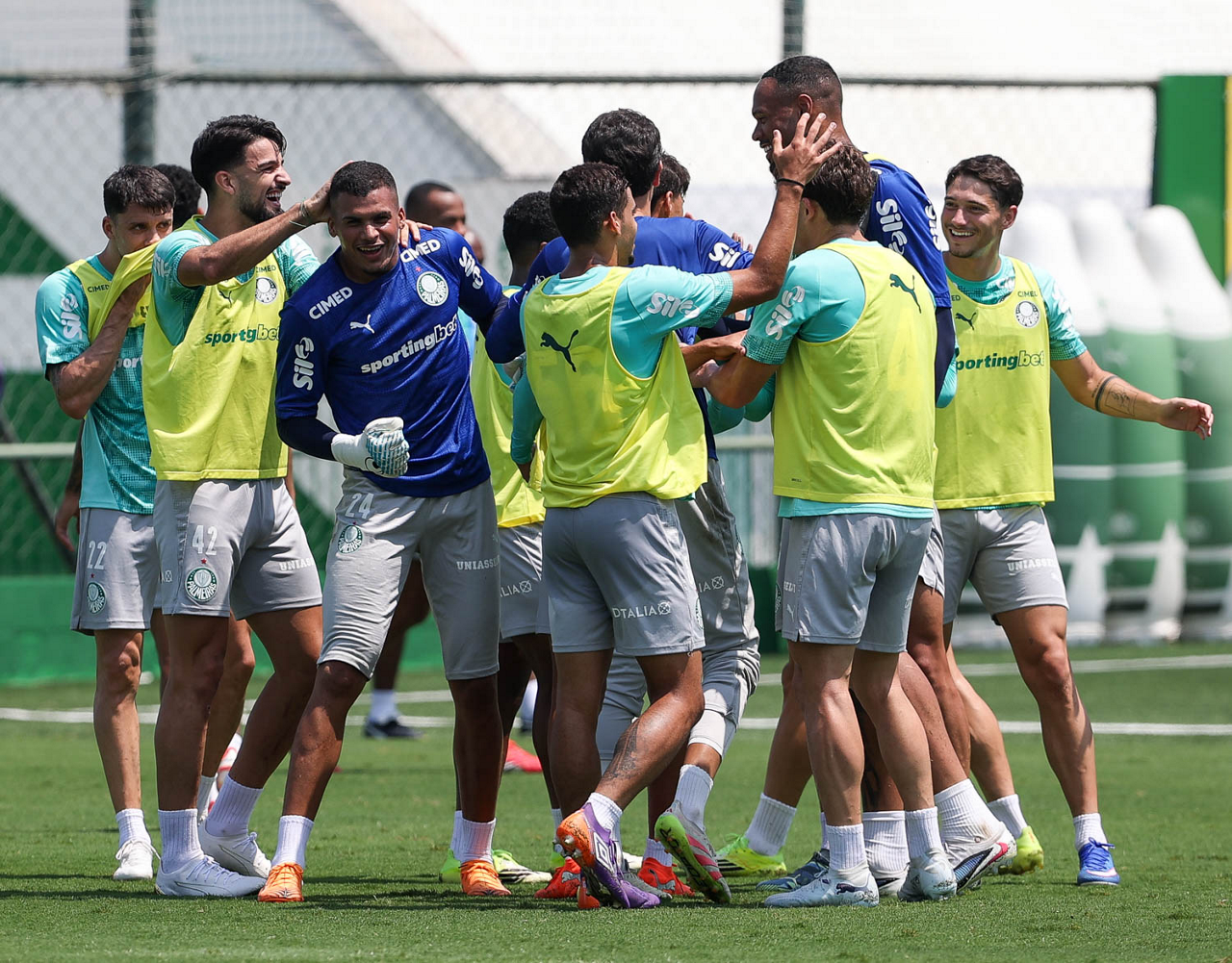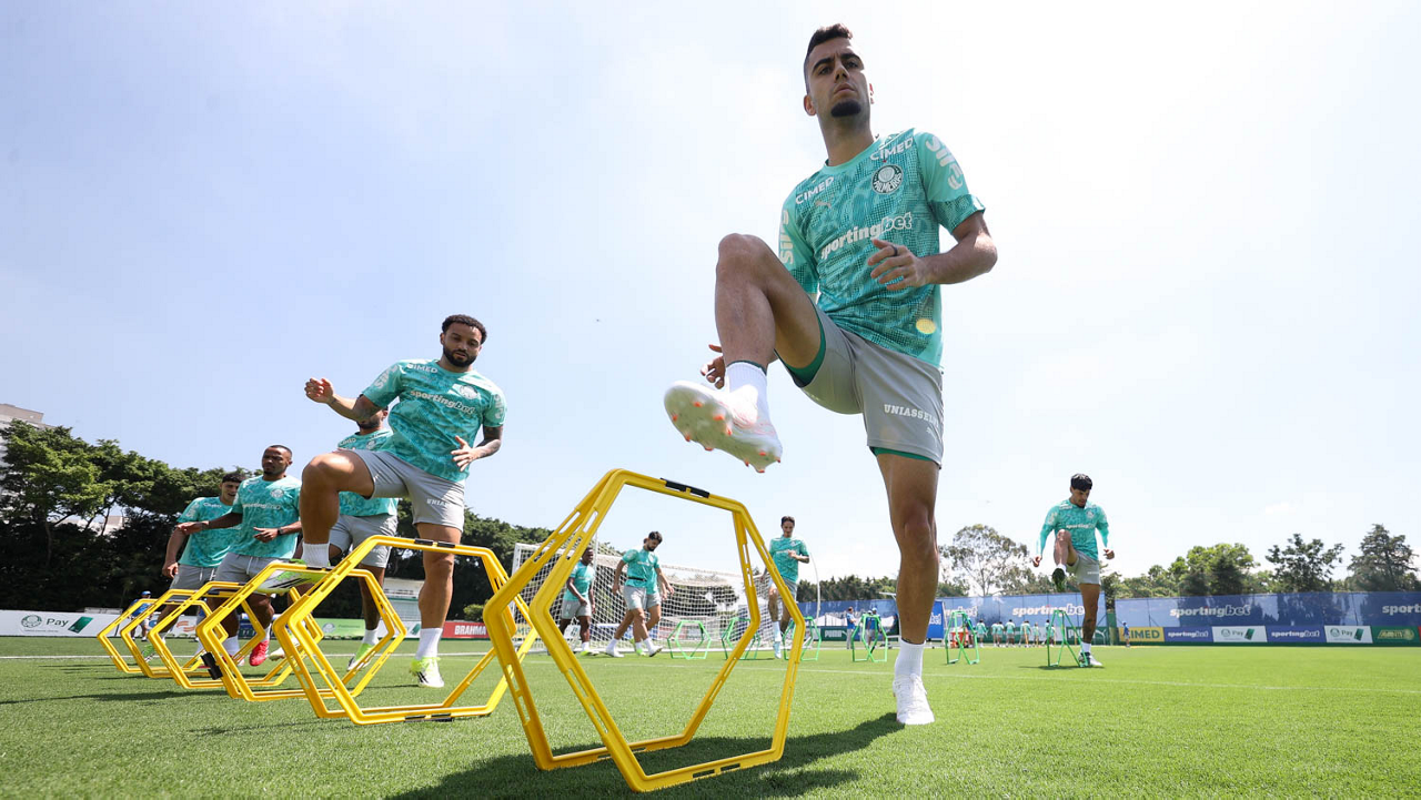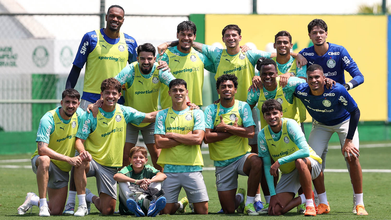 Os jogadores Carlos Miguel, Flaco López, Gustavo Gómez, Emiliano Martínez, Jhon Arias, Arthur, Aranha e Sá (E/D em pé) e Joaquín Piquerez, Agustín Giay, Ramón Sosa, Luighi e Larson (E/D agachados), da SE Palmeiras, durante treinamento, na Academia de Futebol. (Foto: Cesar Greco/Palmeiras/by Canon)
