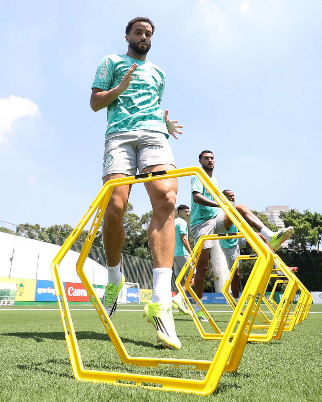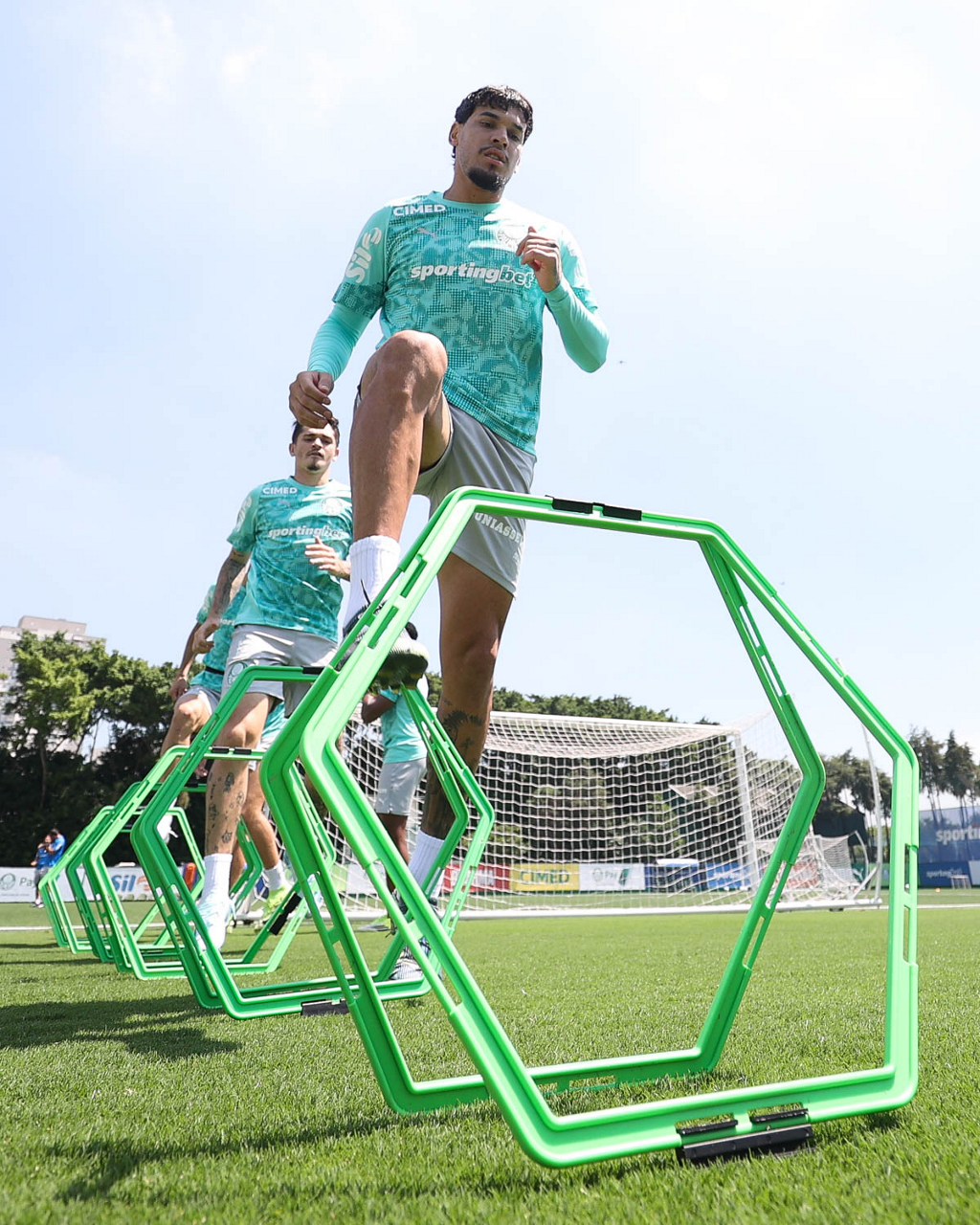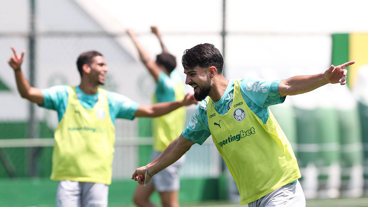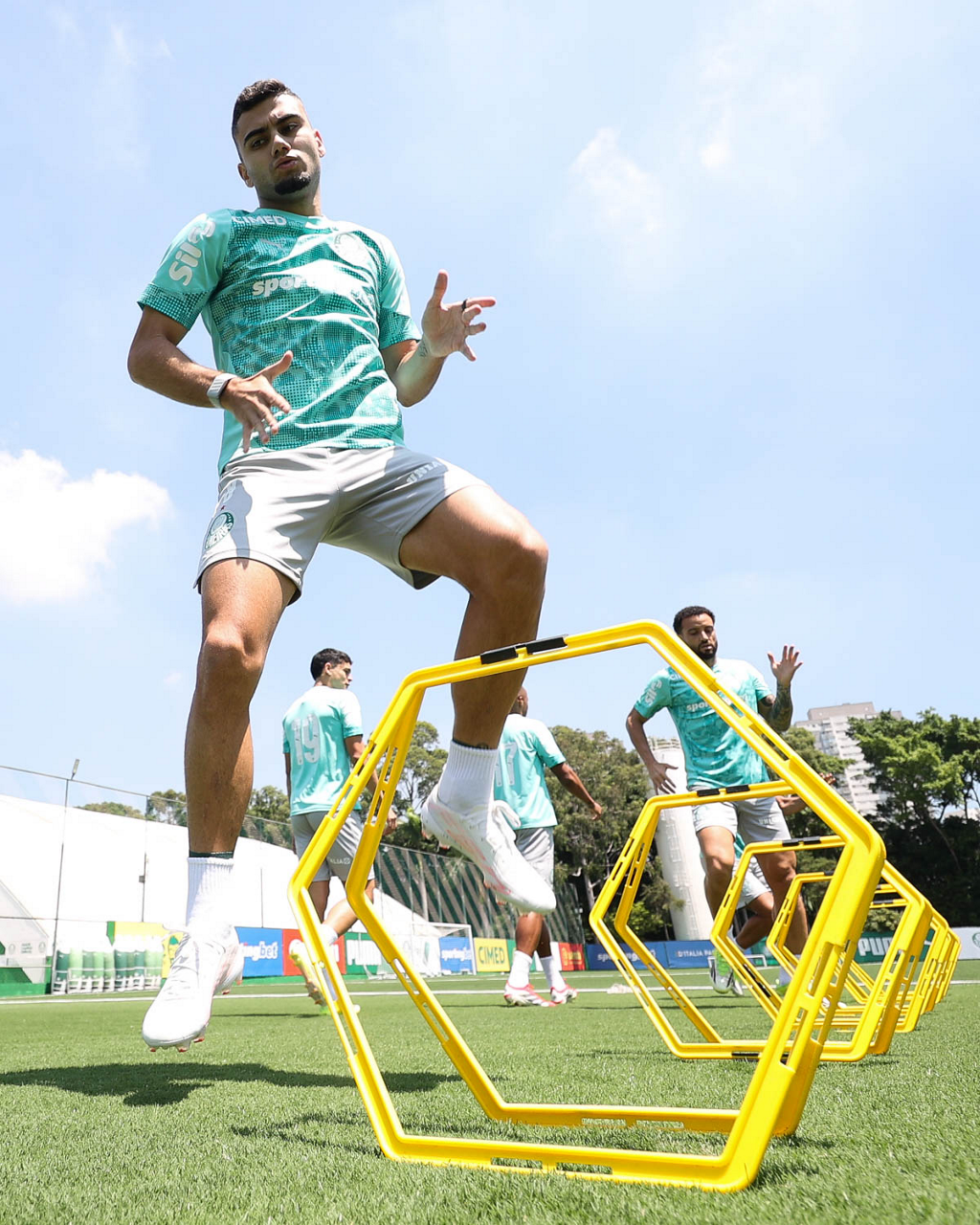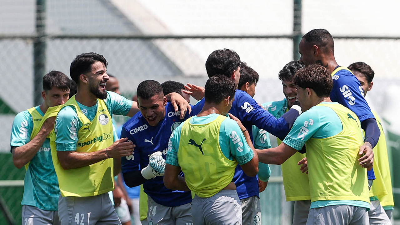 Os jogadores Carlos Miguel, Flaco López, Gustavo Gómez, Emiliano Martínez, Jhon Arias, Arthur, Aranha e Sá (E/D em pé) e Joaquín Piquerez, Agustín Giay, Ramón Sosa, Luighi e Larson (E/D agachados), da SE Palmeiras, durante treinamento, na Academia de Futebol. (Foto: Cesar Greco/Palmeiras/by Canon)