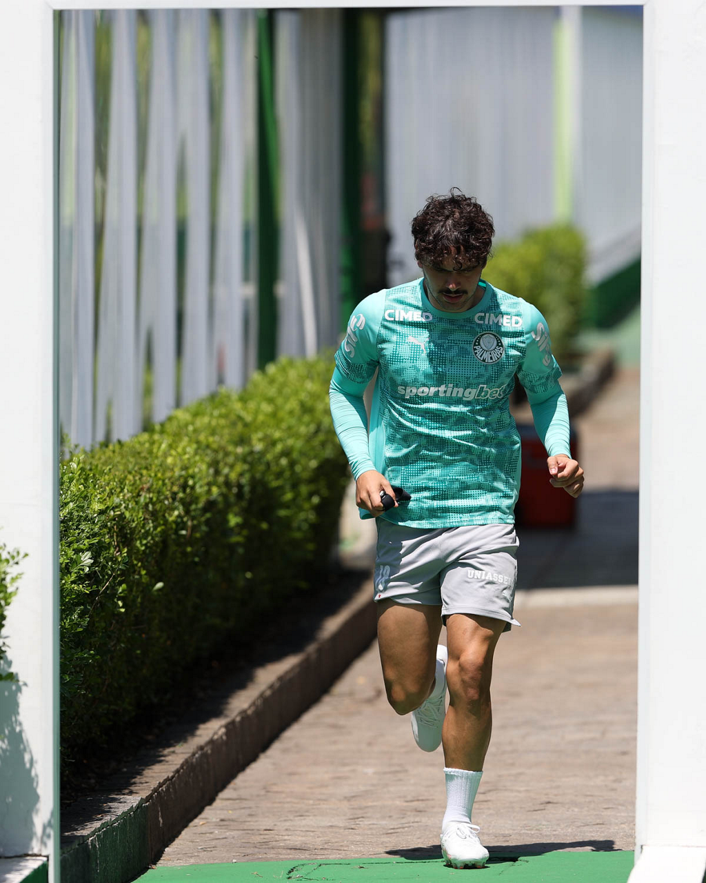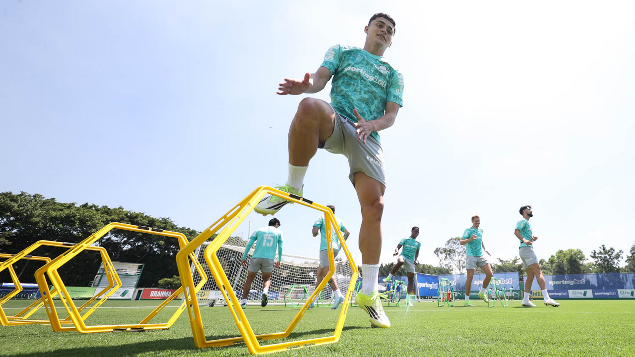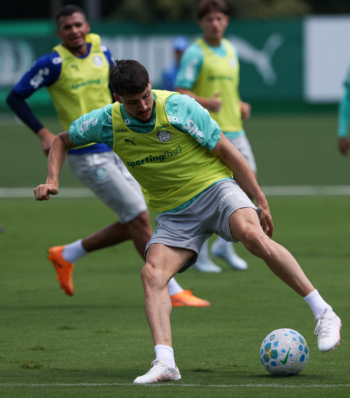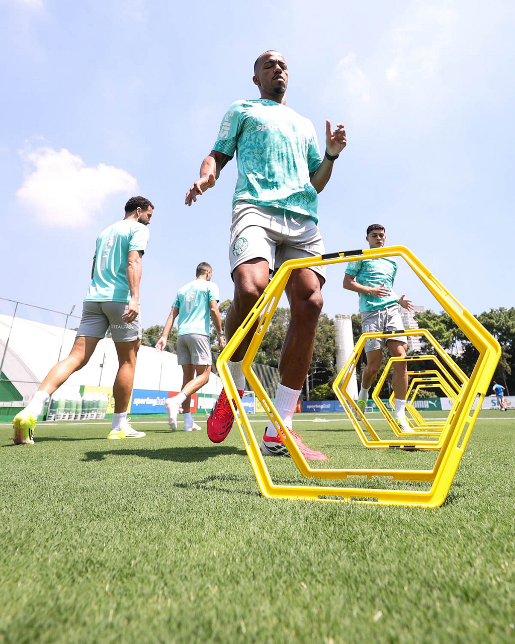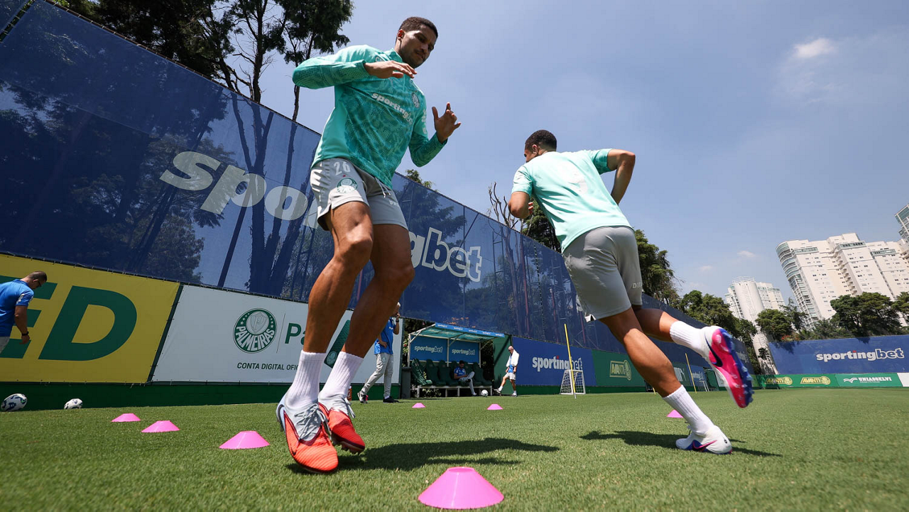 Os jogadores Carlos Miguel, Flaco López, Gustavo Gómez, Emiliano Martínez, Jhon Arias, Arthur, Aranha e Sá (E/D em pé) e Joaquín Piquerez, Agustín Giay, Ramón Sosa, Luighi e Larson (E/D agachados), da SE Palmeiras, durante treinamento, na Academia de Futebol. (Foto: Cesar Greco/Palmeiras/by Canon)
