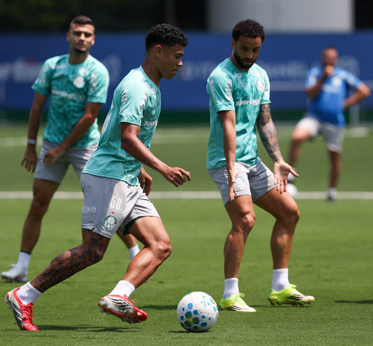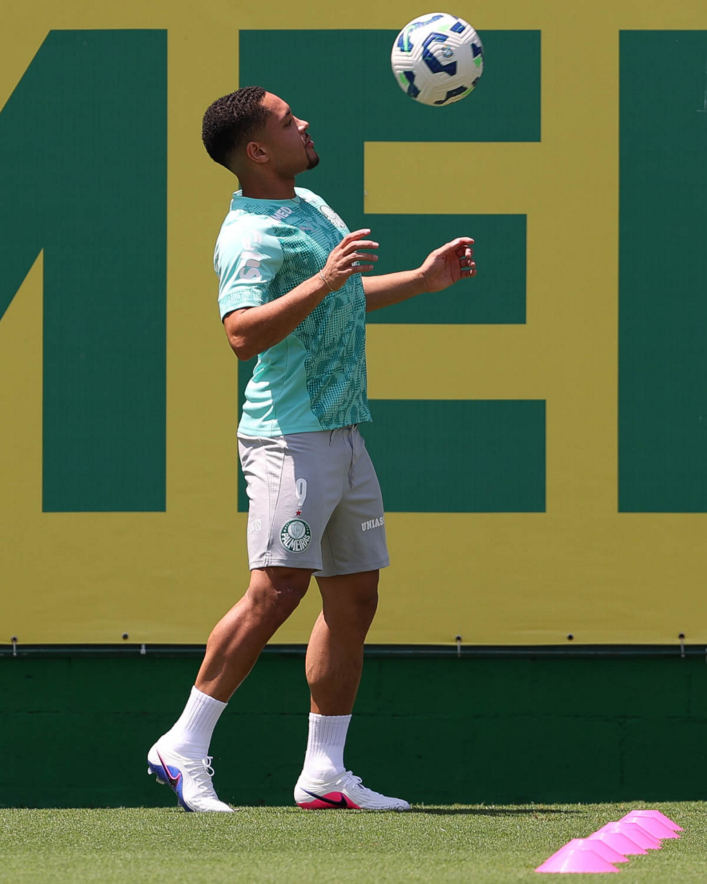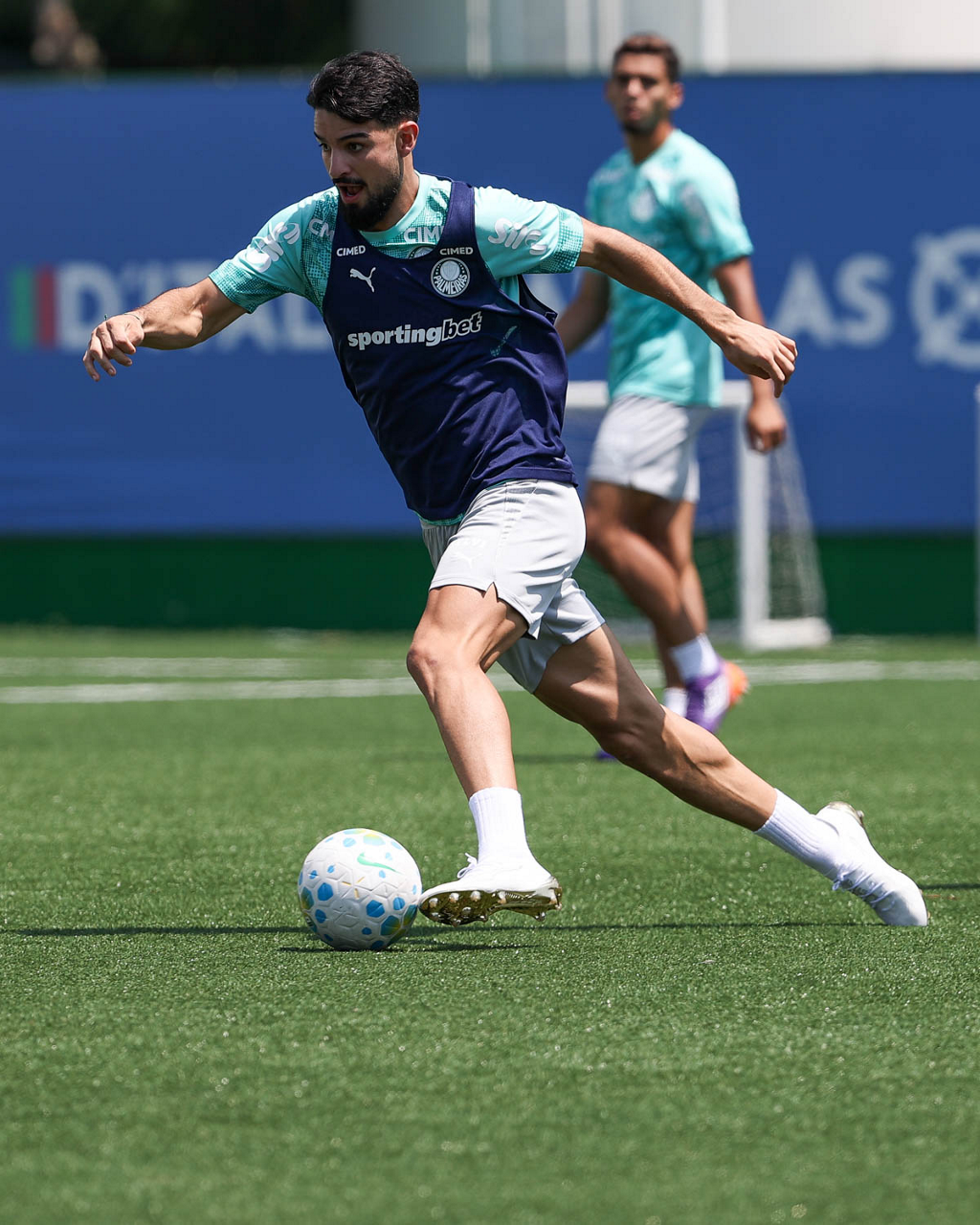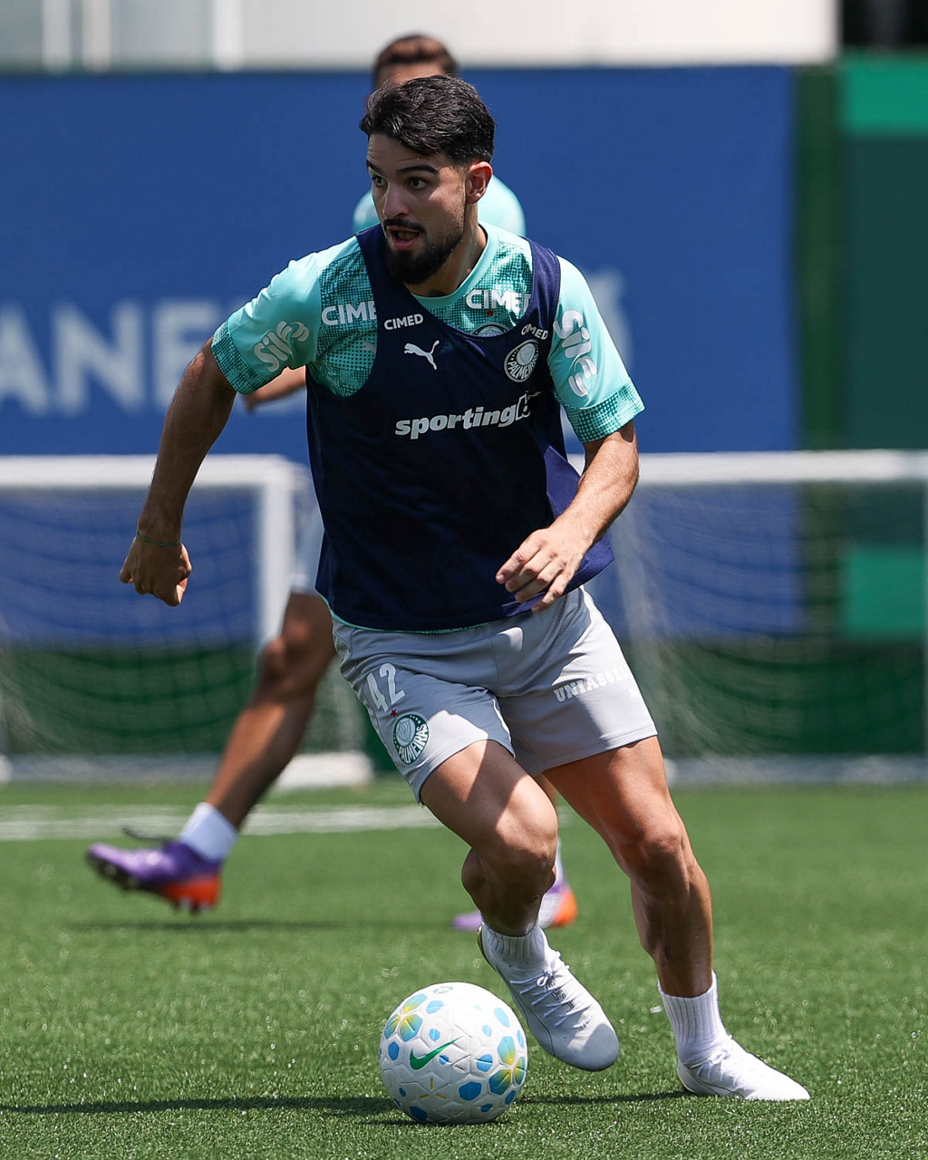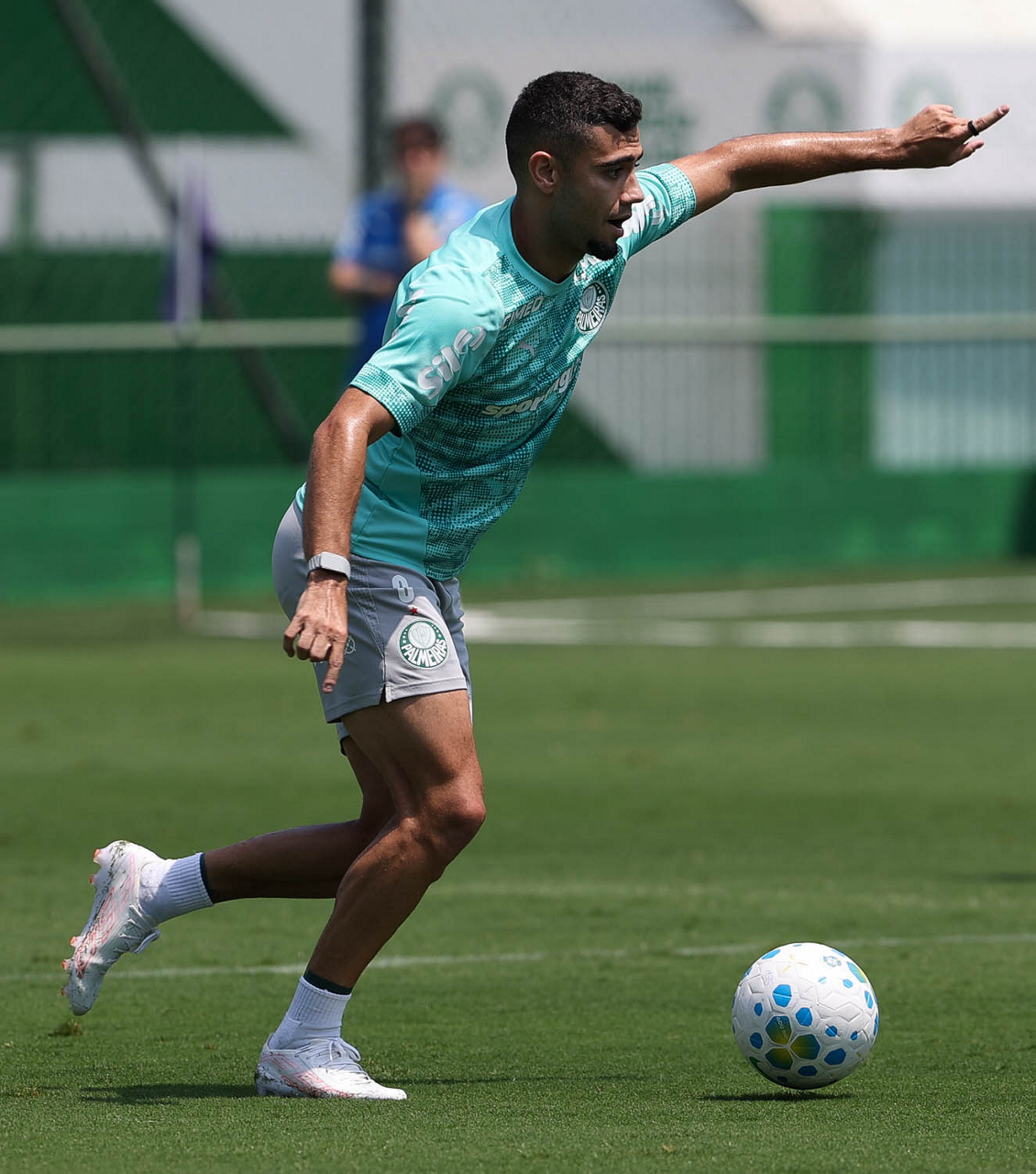Os jogadores Carlos Miguel, Flaco López, Gustavo Gómez, Emiliano Martínez, Jhon Arias, Arthur, Aranha e Sá (E/D em pé) e Joaquín Piquerez, Agustín Giay, Ramón Sosa, Luighi e Larson (E/D agachados), da SE Palmeiras, durante treinamento, na Academia de Futebol. (Foto: Cesar Greco/Palmeiras/by Canon)