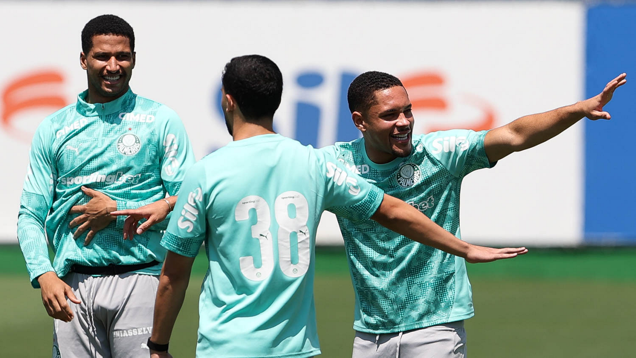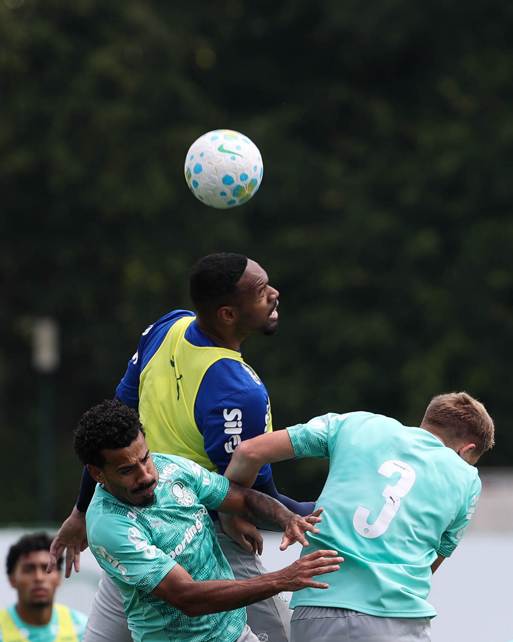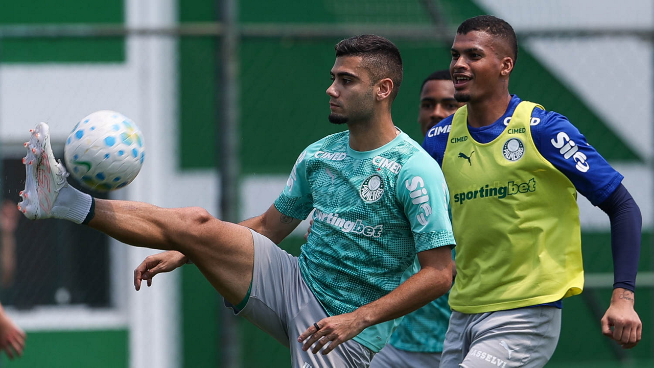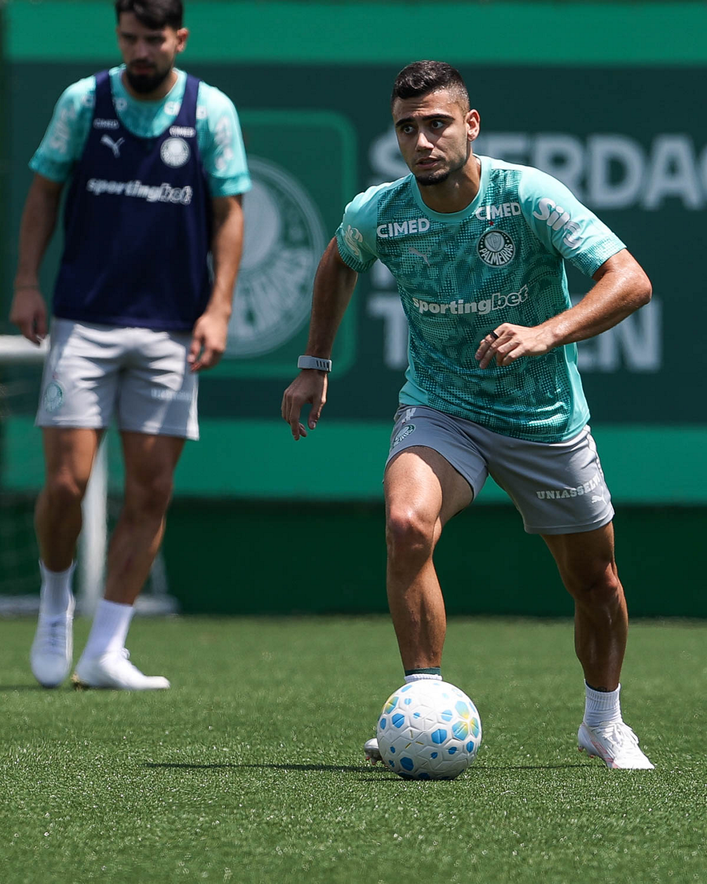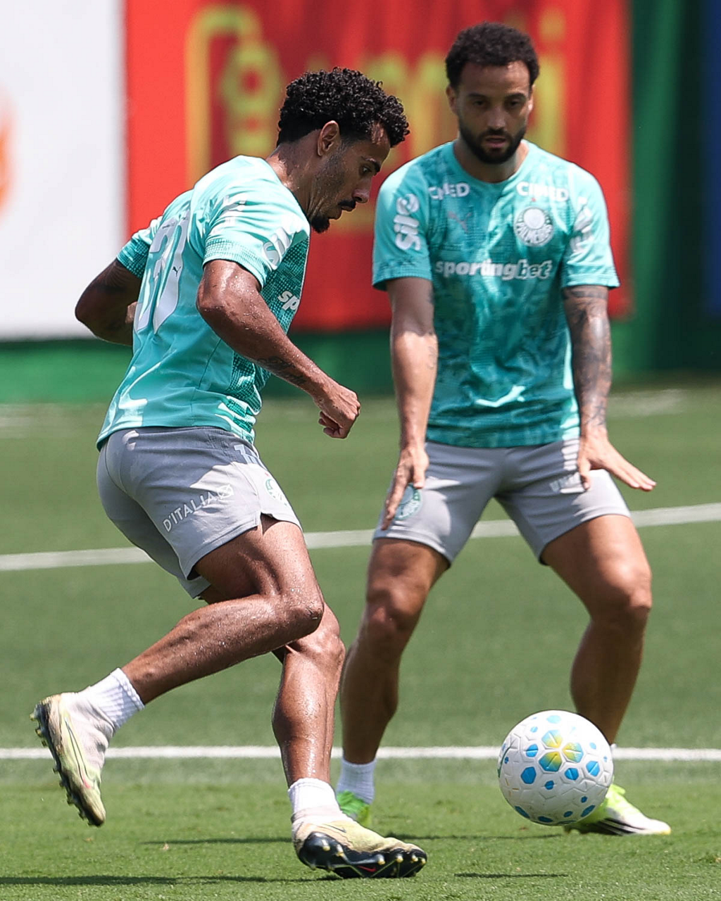 Os jogadores Carlos Miguel, Flaco López, Gustavo Gómez, Emiliano Martínez, Jhon Arias, Arthur, Aranha e Sá (E/D em pé) e Joaquín Piquerez, Agustín Giay, Ramón Sosa, Luighi e Larson (E/D agachados), da SE Palmeiras, durante treinamento, na Academia de Futebol. (Foto: Cesar Greco/Palmeiras/by Canon)