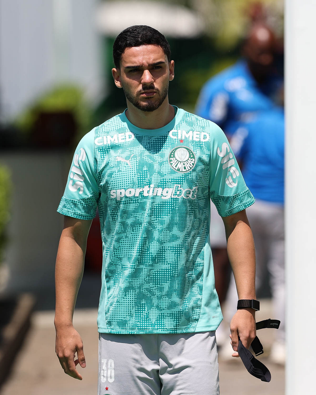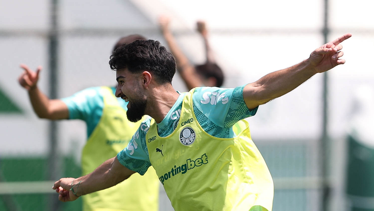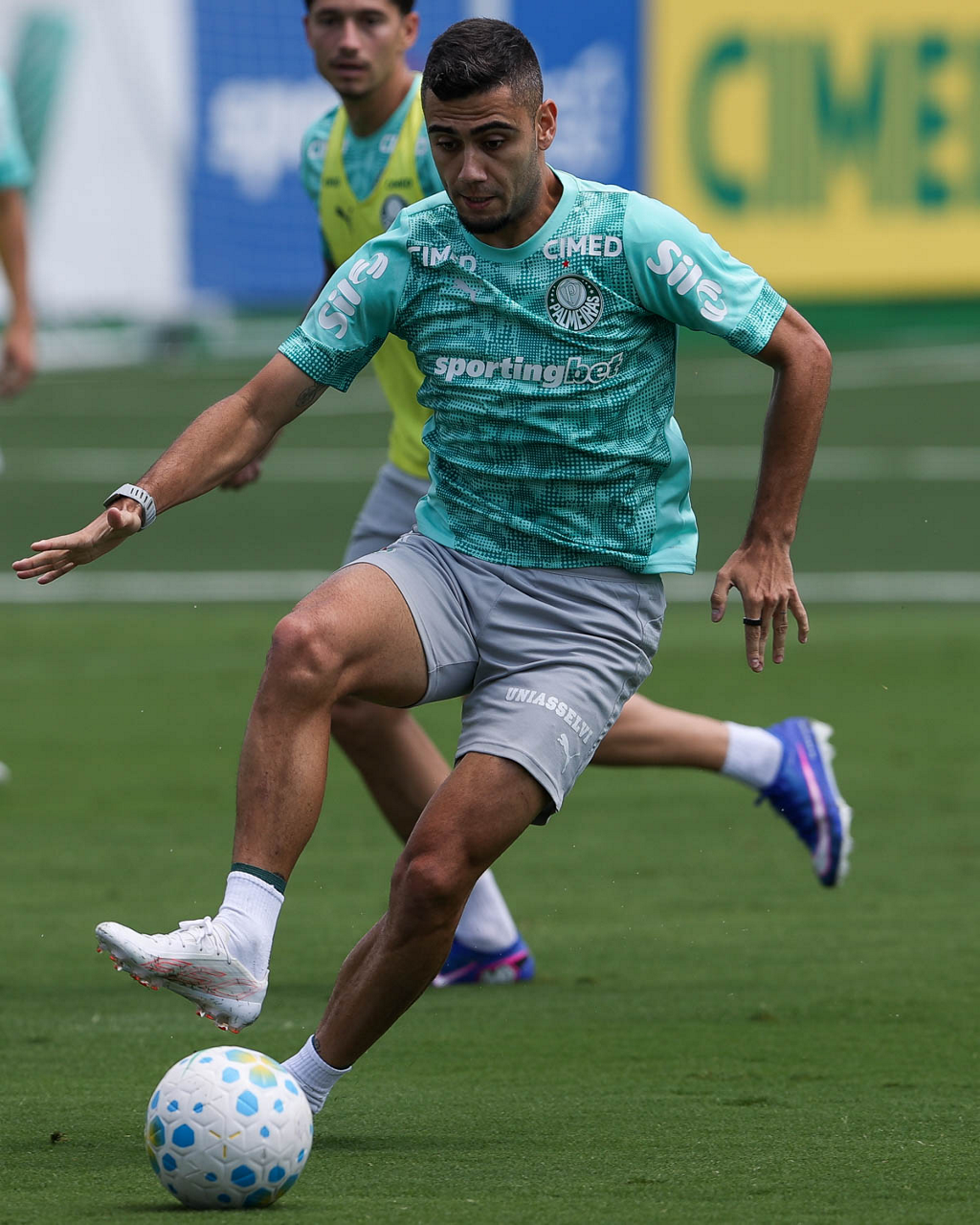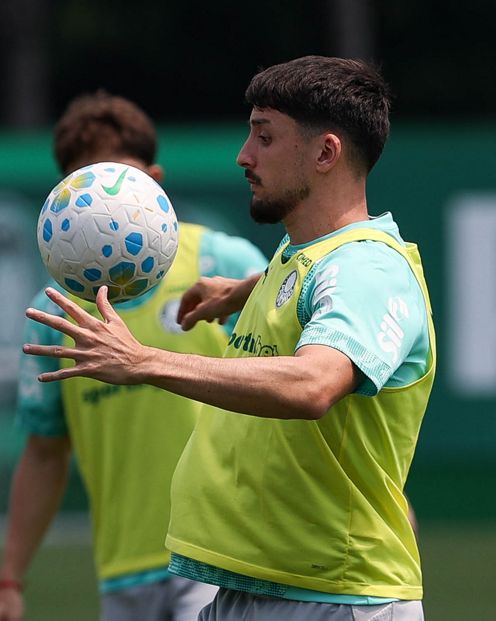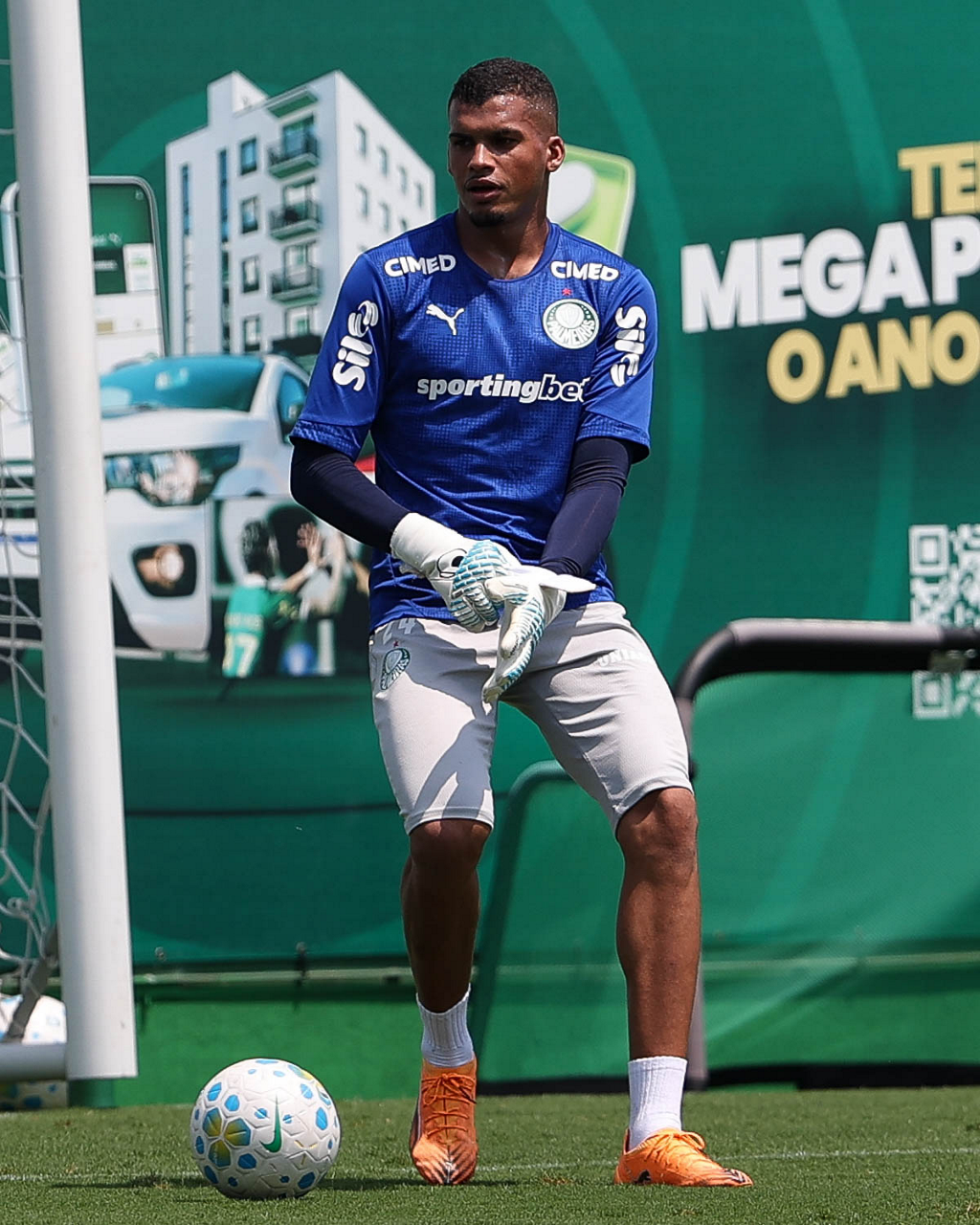 Os jogadores Carlos Miguel, Flaco López, Gustavo Gómez, Emiliano Martínez, Jhon Arias, Arthur, Aranha e Sá (E/D em pé) e Joaquín Piquerez, Agustín Giay, Ramón Sosa, Luighi e Larson (E/D agachados), da SE Palmeiras, durante treinamento, na Academia de Futebol. (Foto: Cesar Greco/Palmeiras/by Canon)