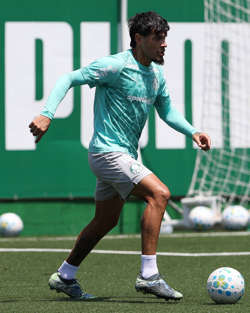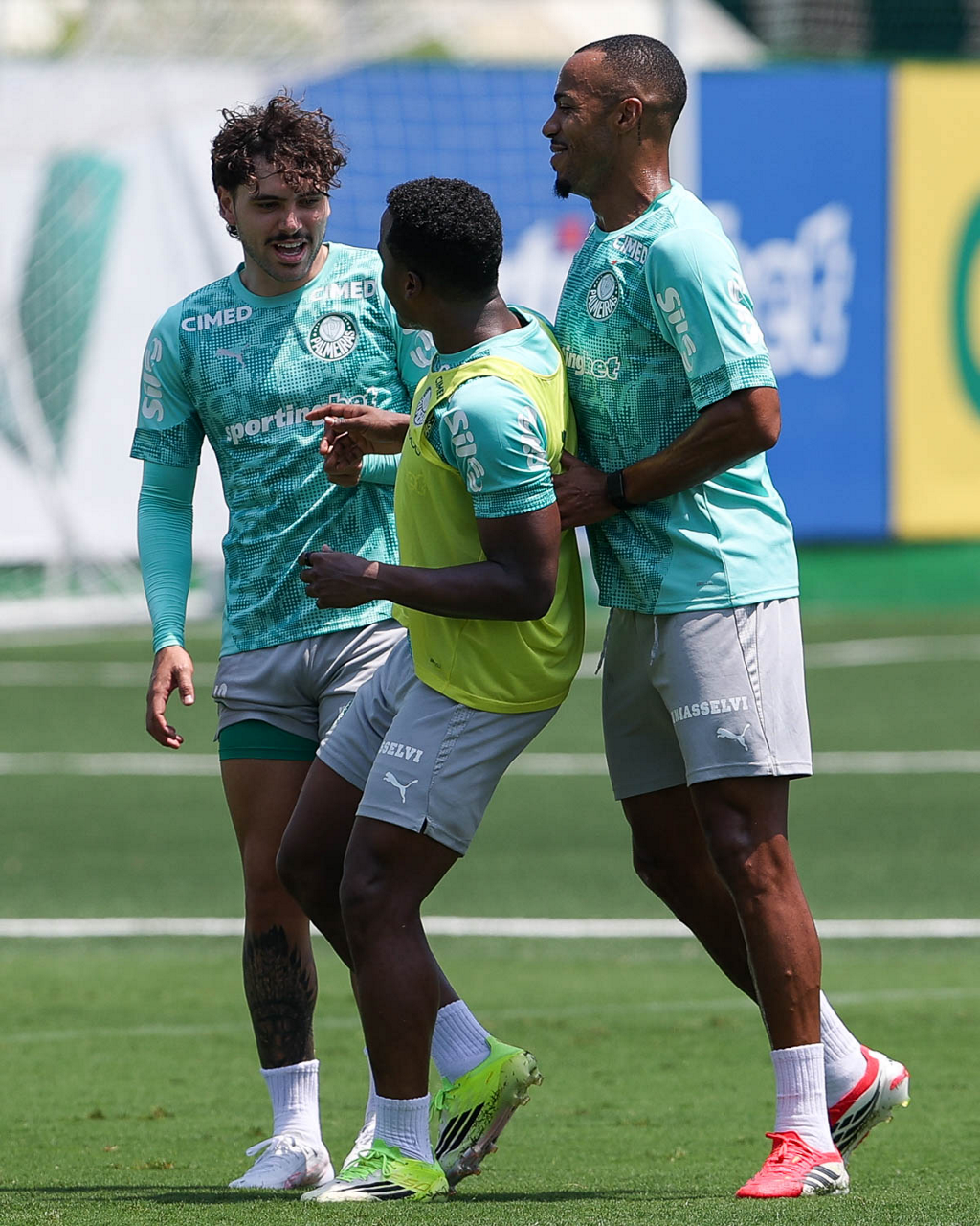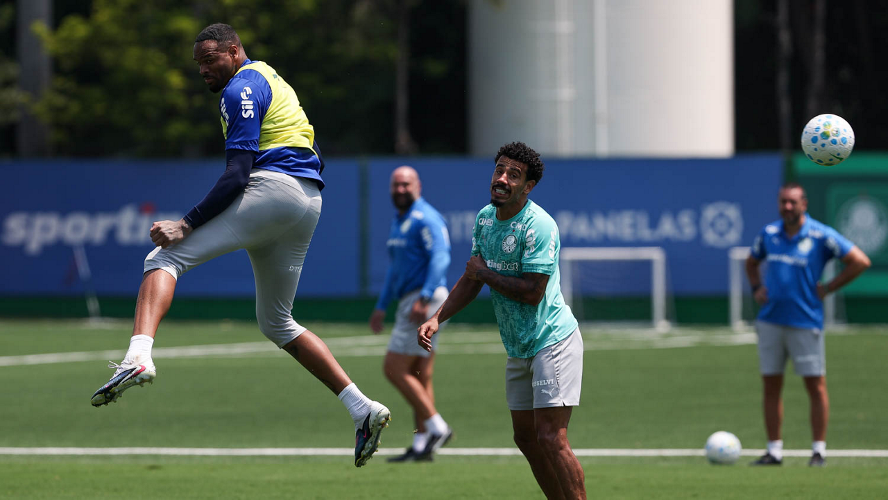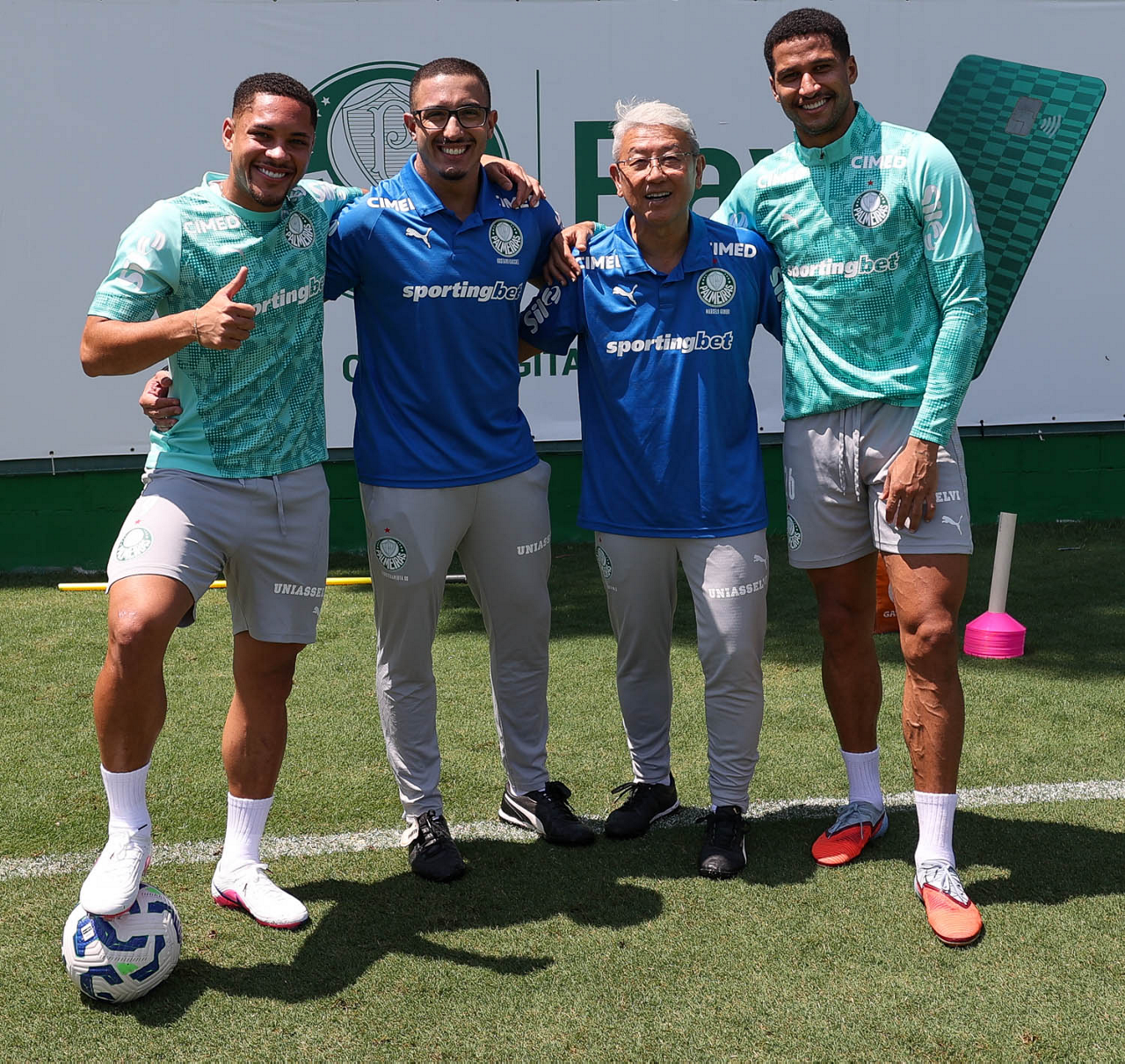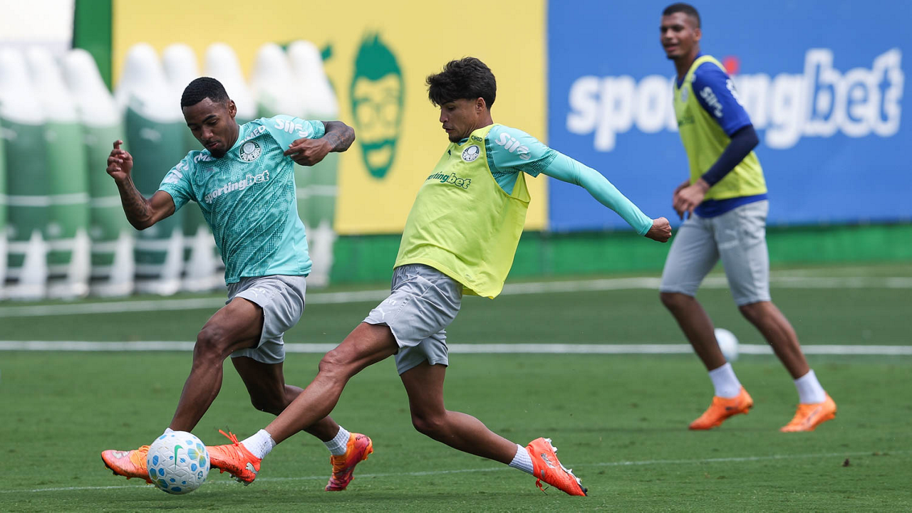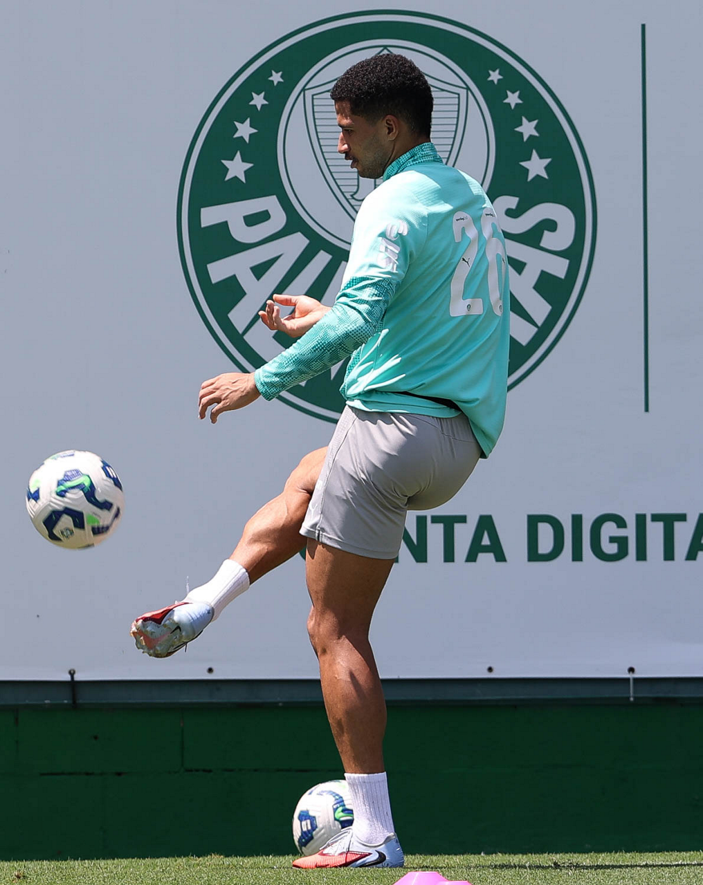 Os jogadores Carlos Miguel, Flaco López, Gustavo Gómez, Emiliano Martínez, Jhon Arias, Arthur, Aranha e Sá (E/D em pé) e Joaquín Piquerez, Agustín Giay, Ramón Sosa, Luighi e Larson (E/D agachados), da SE Palmeiras, durante treinamento, na Academia de Futebol. (Foto: Cesar Greco/Palmeiras/by Canon)