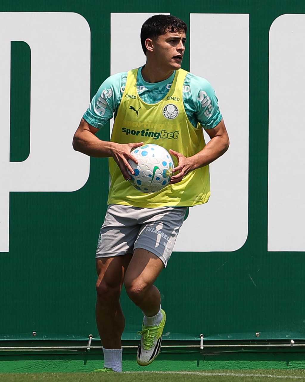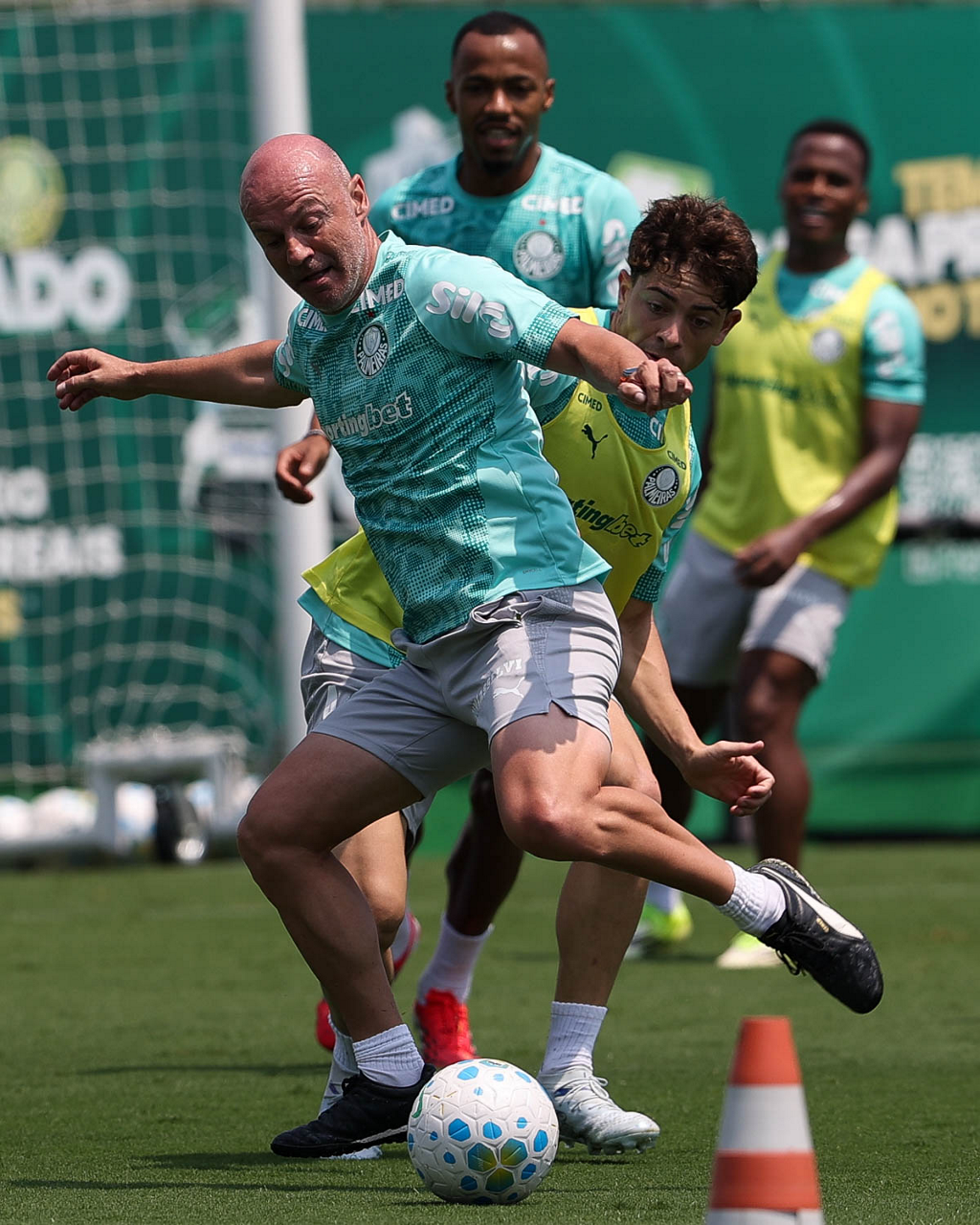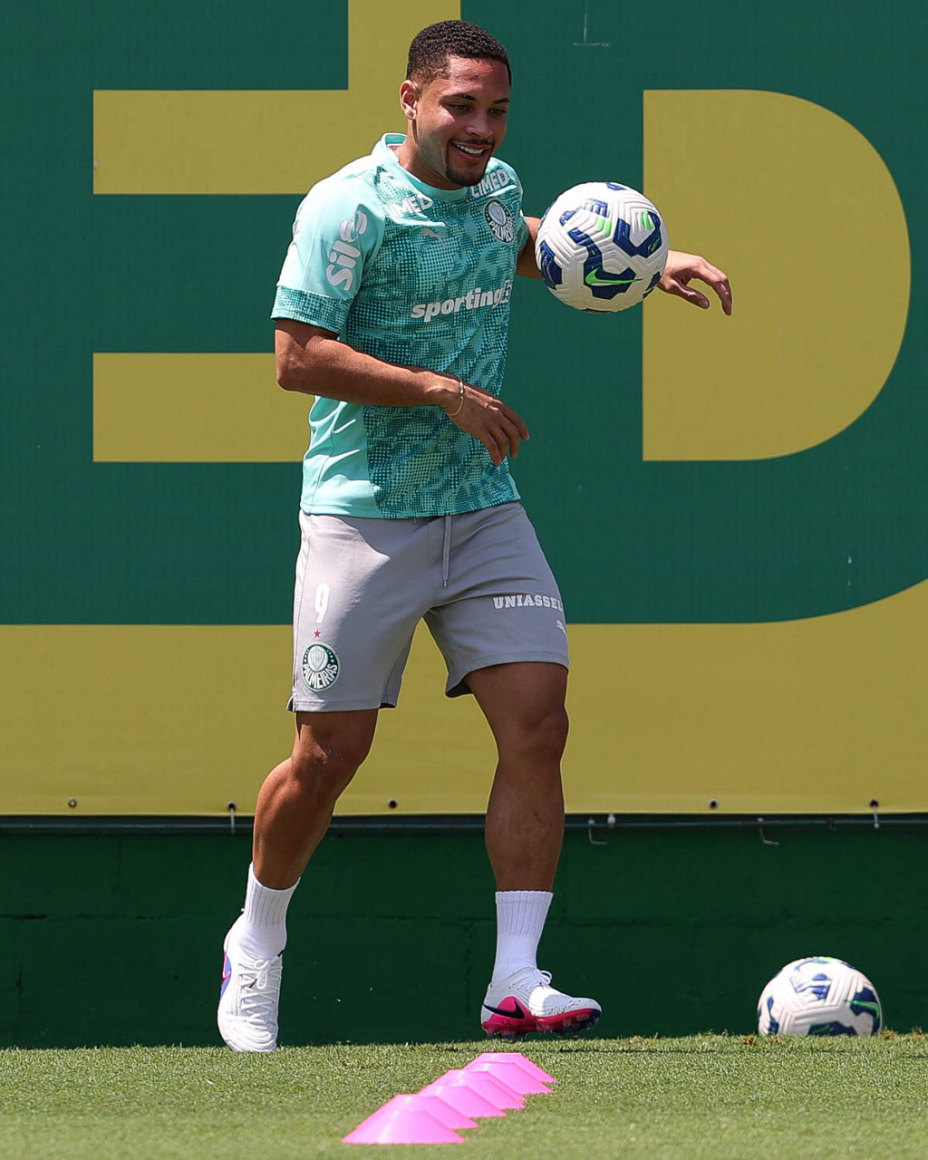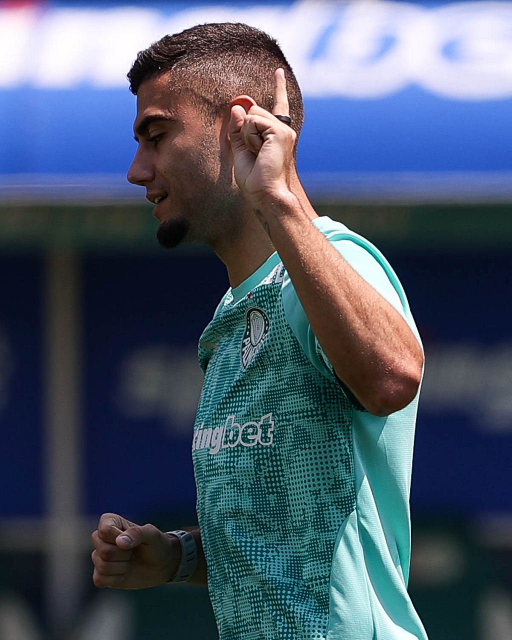 Os jogadores Carlos Miguel, Flaco López, Gustavo Gómez, Emiliano Martínez, Jhon Arias, Arthur, Aranha e Sá (E/D em pé) e Joaquín Piquerez, Agustín Giay, Ramón Sosa, Luighi e Larson (E/D agachados), da SE Palmeiras, durante treinamento, na Academia de Futebol. (Foto: Cesar Greco/Palmeiras/by Canon)
