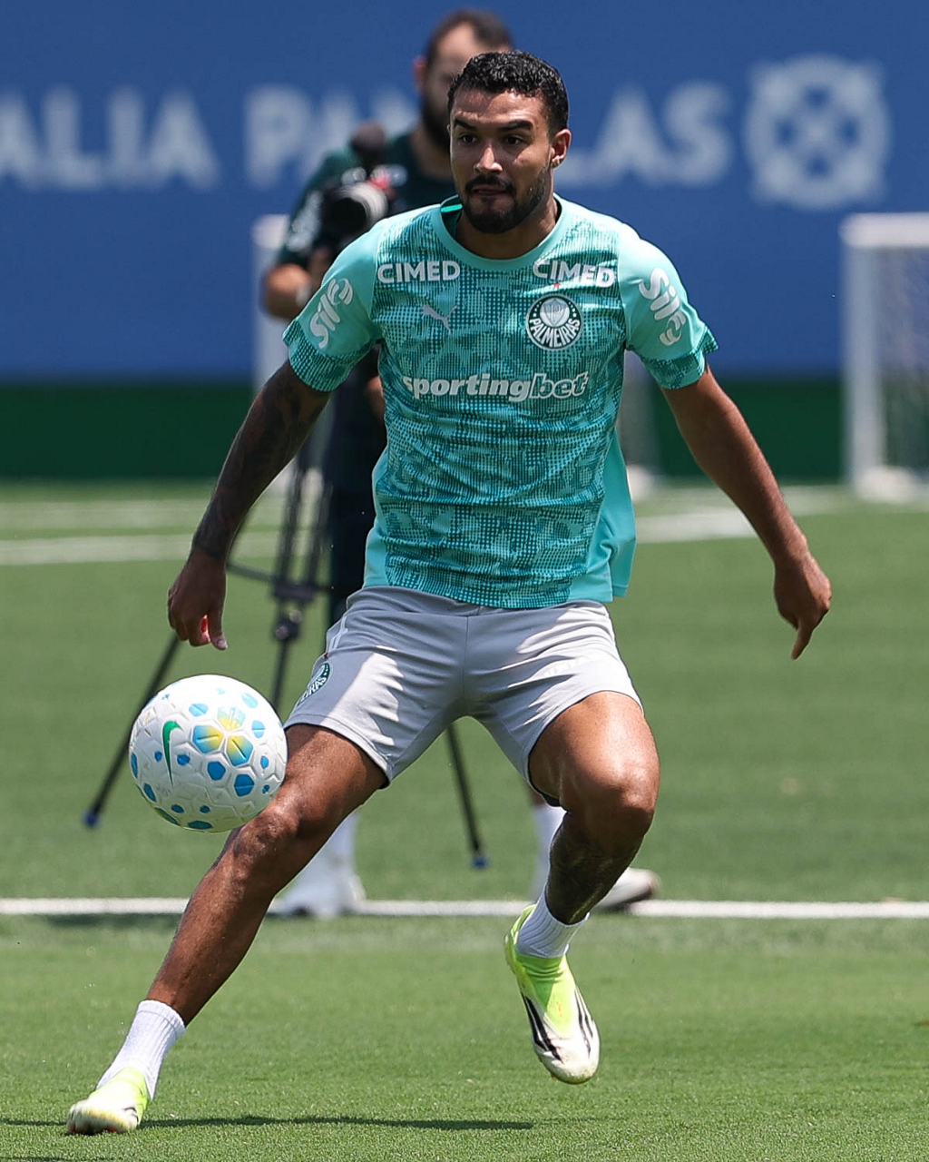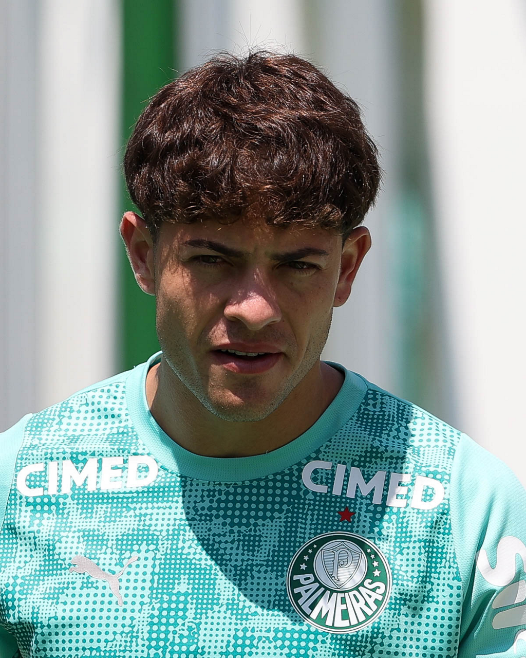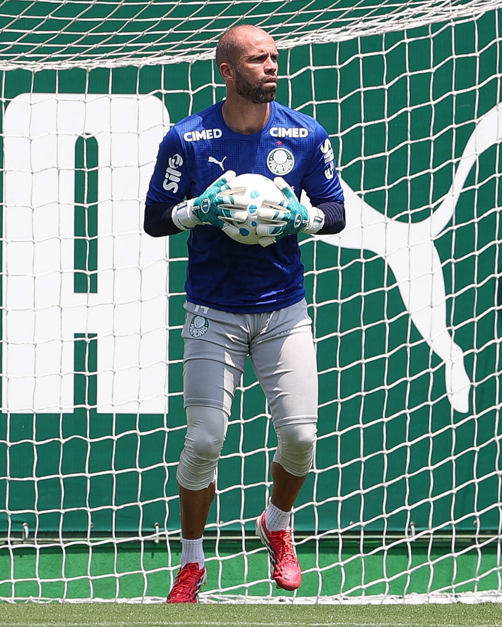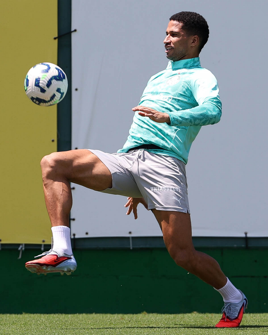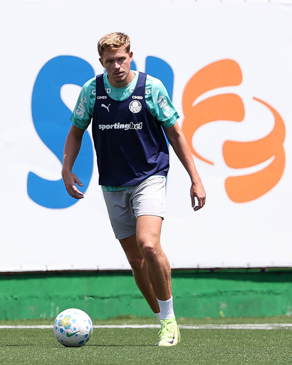 Os jogadores Carlos Miguel, Flaco López, Gustavo Gómez, Emiliano Martínez, Jhon Arias, Arthur, Aranha e Sá (E/D em pé) e Joaquín Piquerez, Agustín Giay, Ramón Sosa, Luighi e Larson (E/D agachados), da SE Palmeiras, durante treinamento, na Academia de Futebol. (Foto: Cesar Greco/Palmeiras/by Canon)