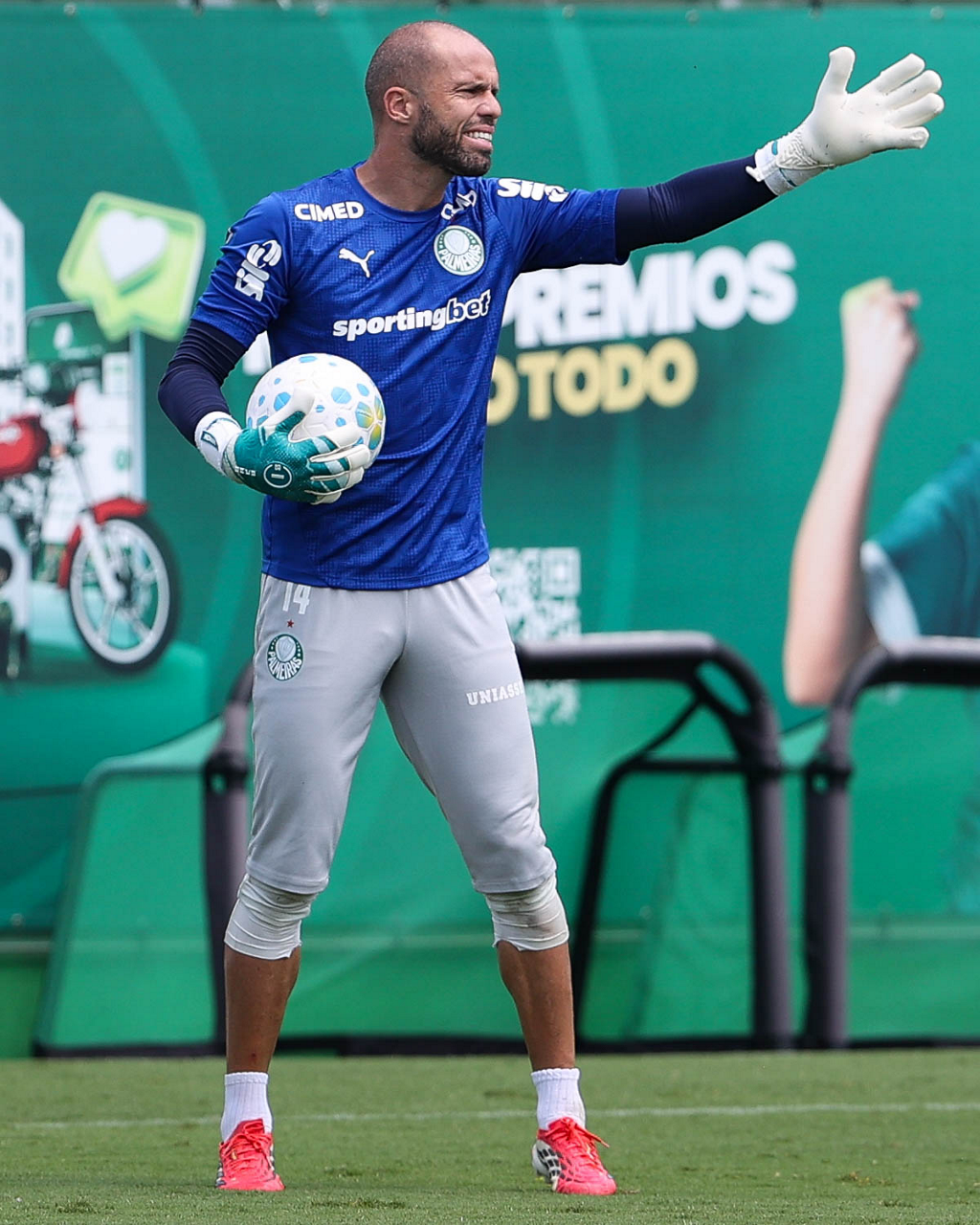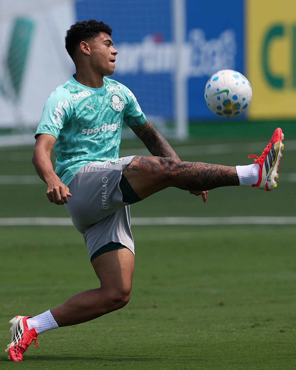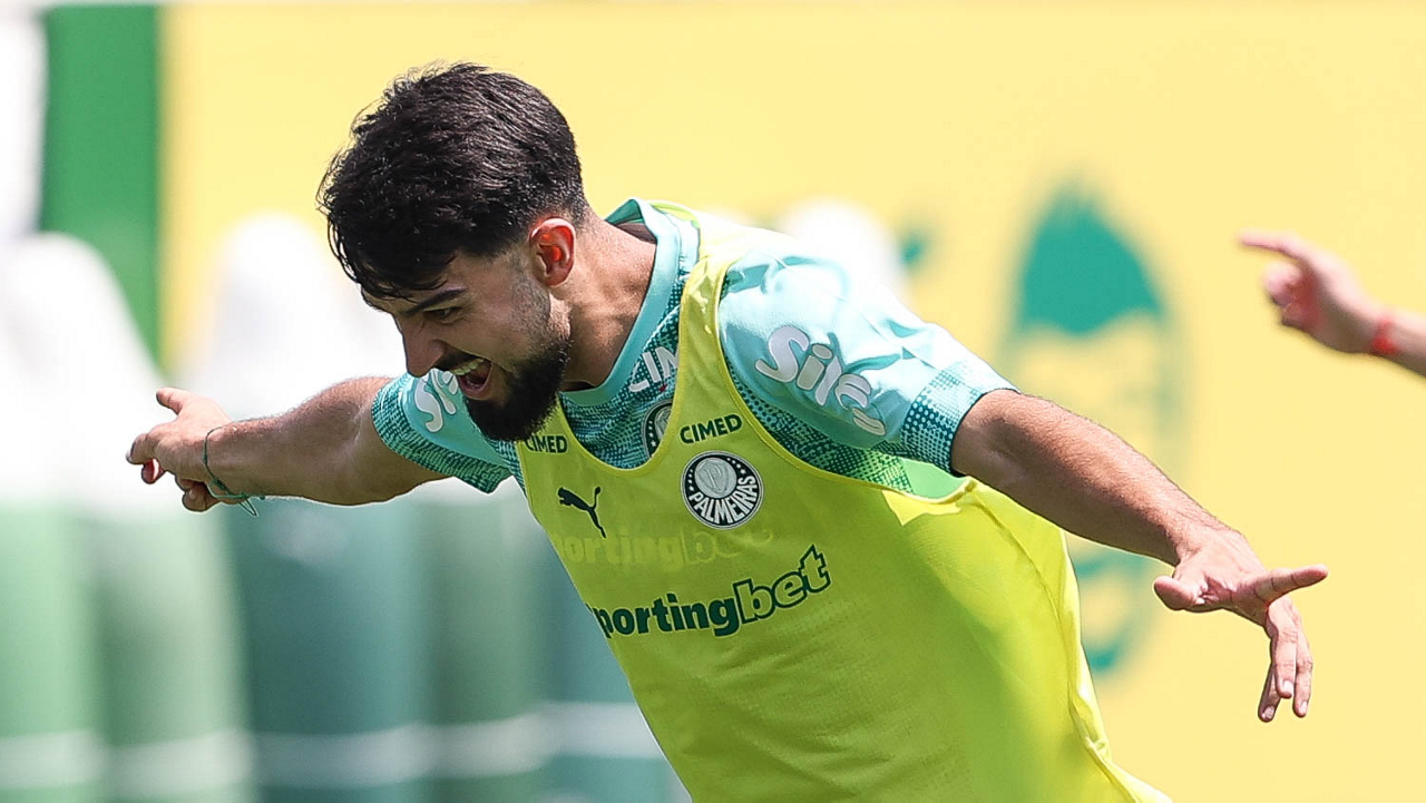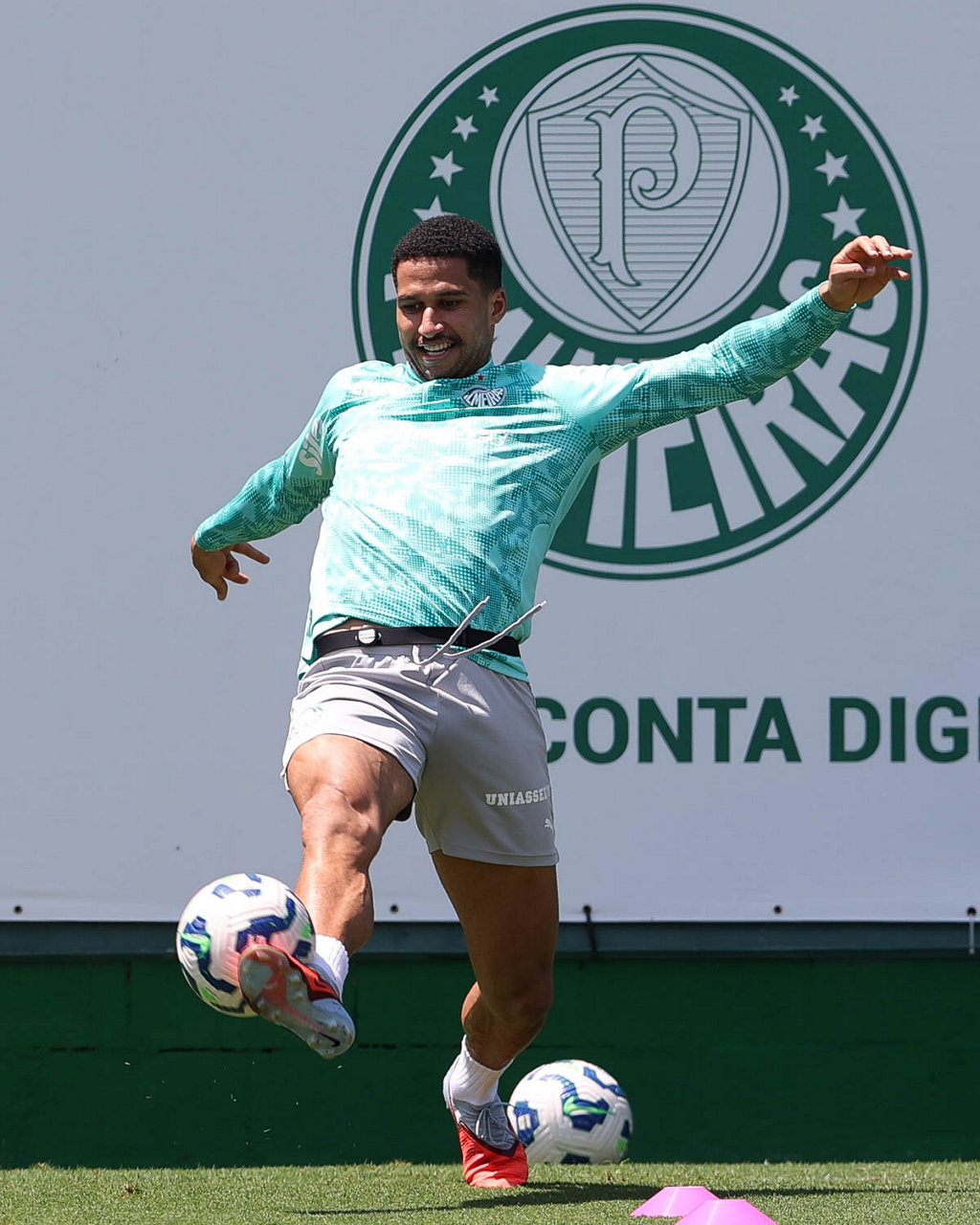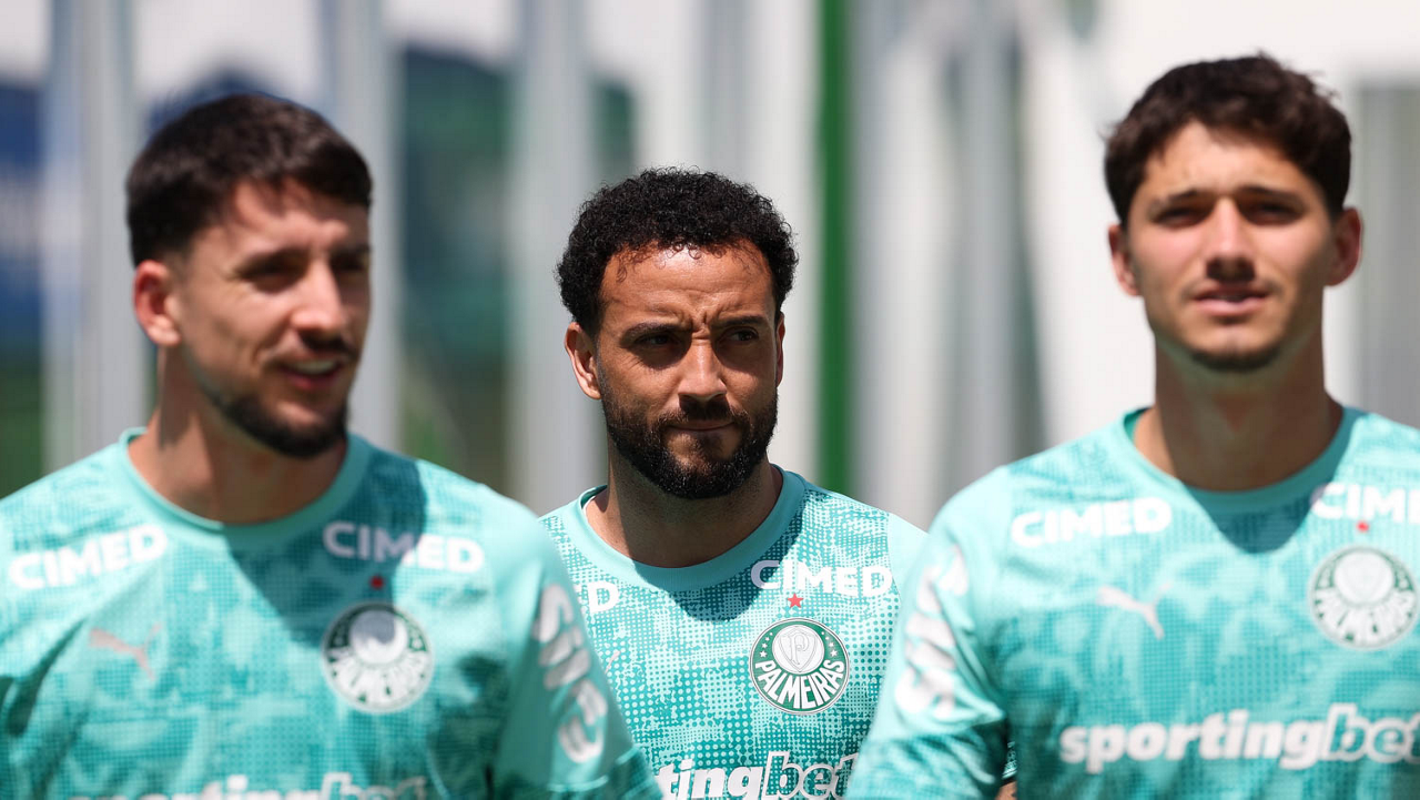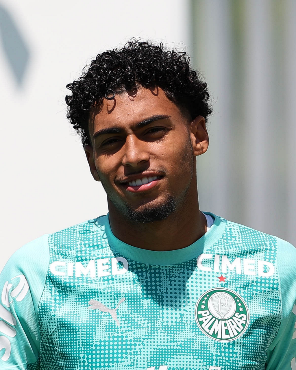 Os jogadores Carlos Miguel, Flaco López, Gustavo Gómez, Emiliano Martínez, Jhon Arias, Arthur, Aranha e Sá (E/D em pé) e Joaquín Piquerez, Agustín Giay, Ramón Sosa, Luighi e Larson (E/D agachados), da SE Palmeiras, durante treinamento, na Academia de Futebol. (Foto: Cesar Greco/Palmeiras/by Canon)