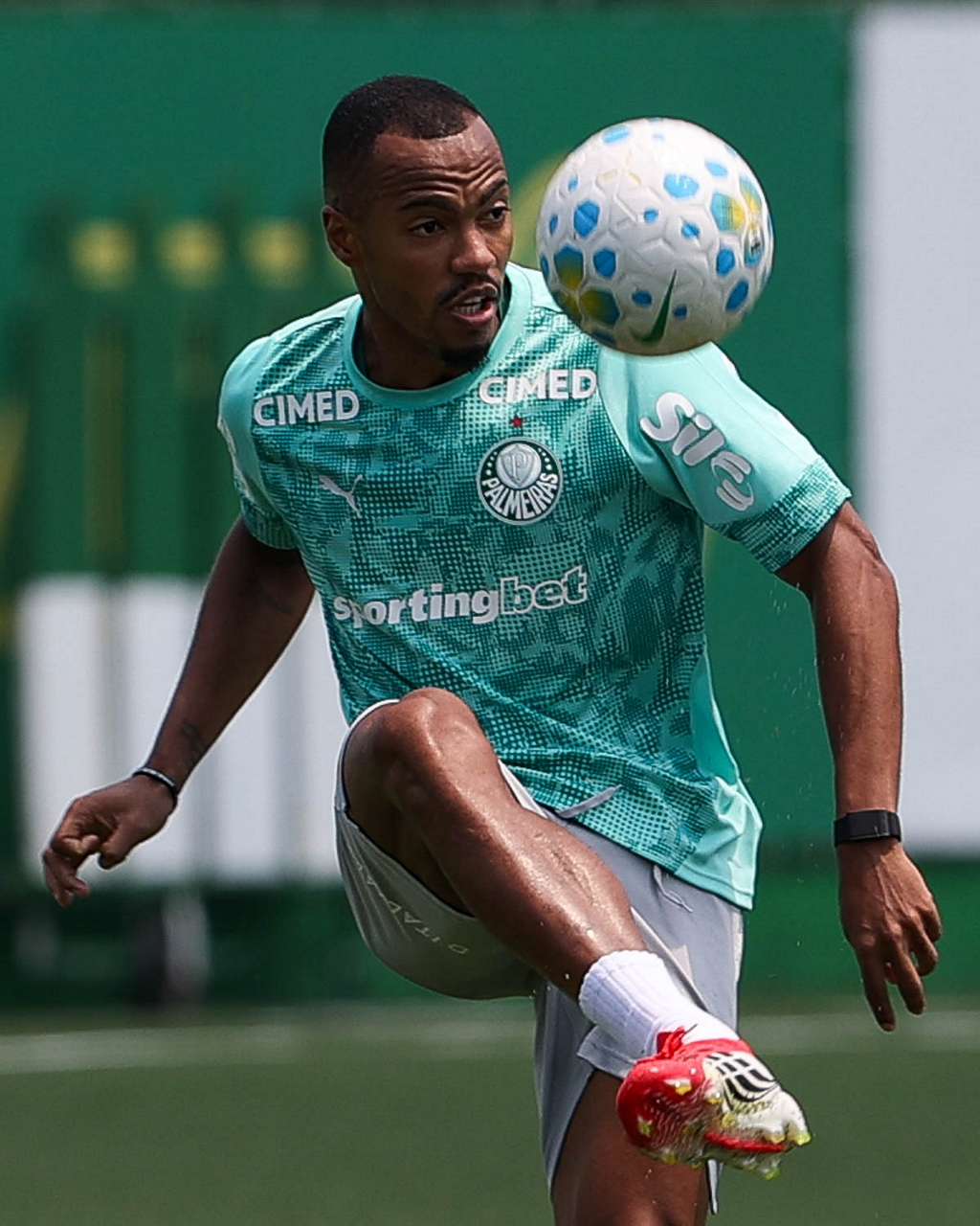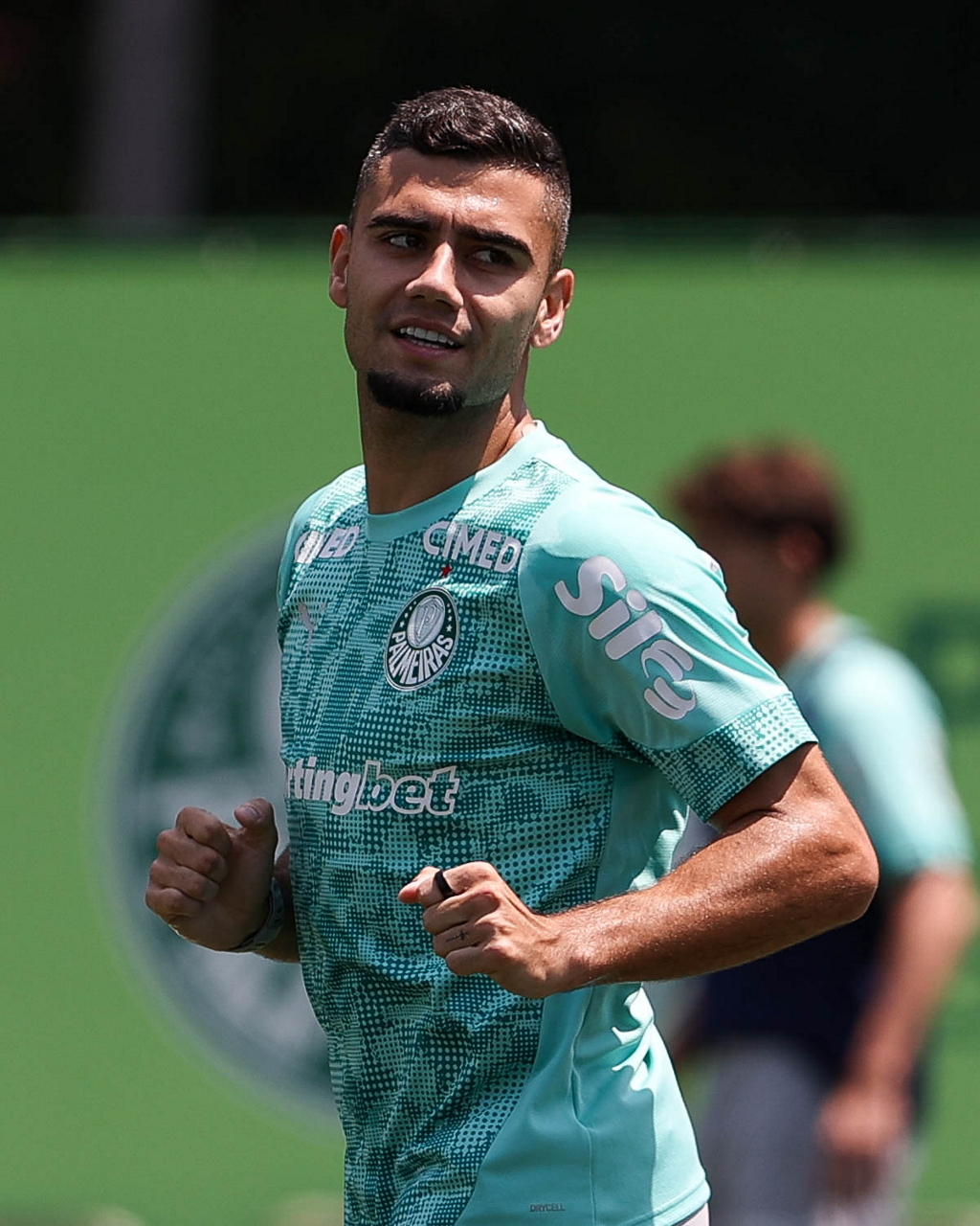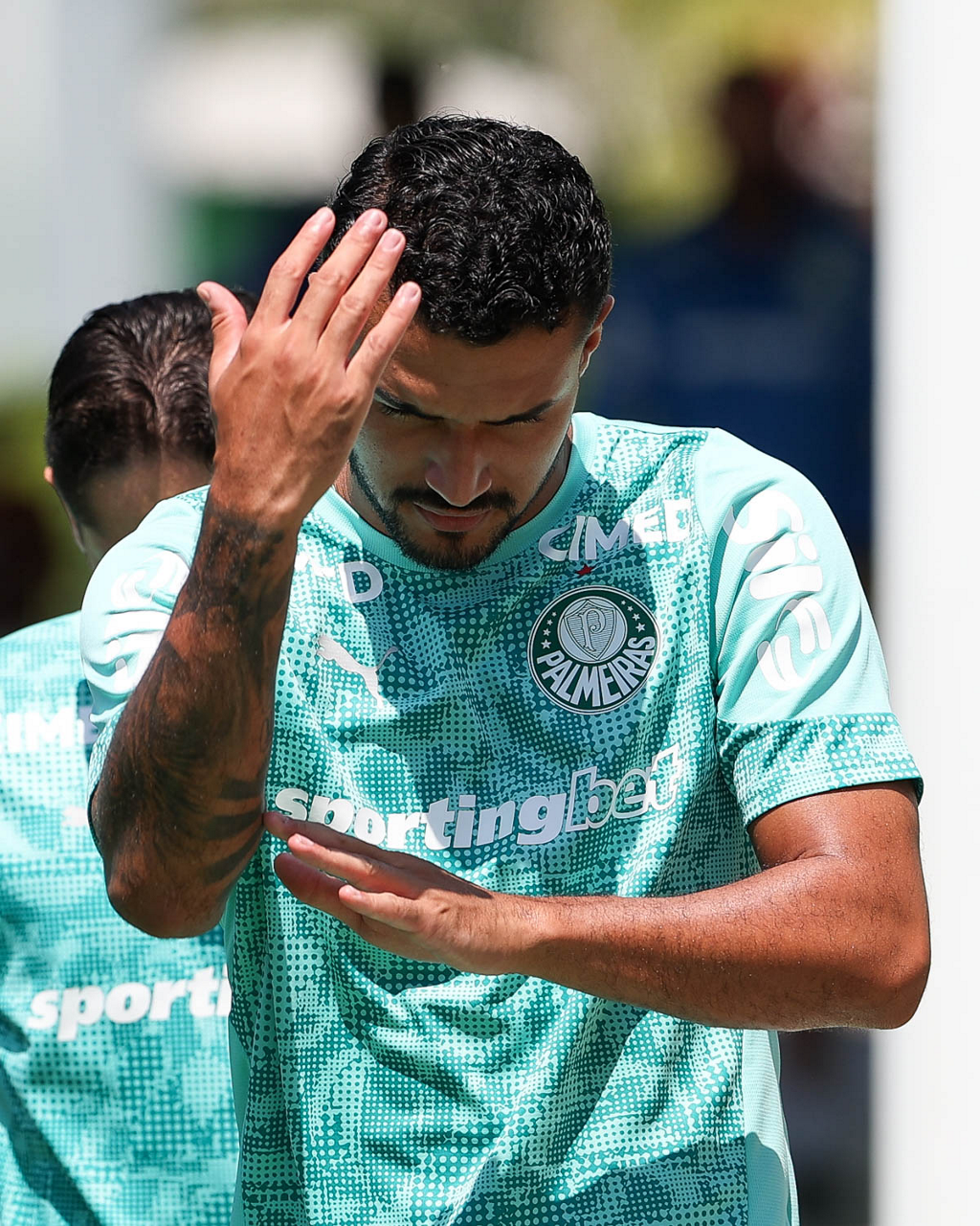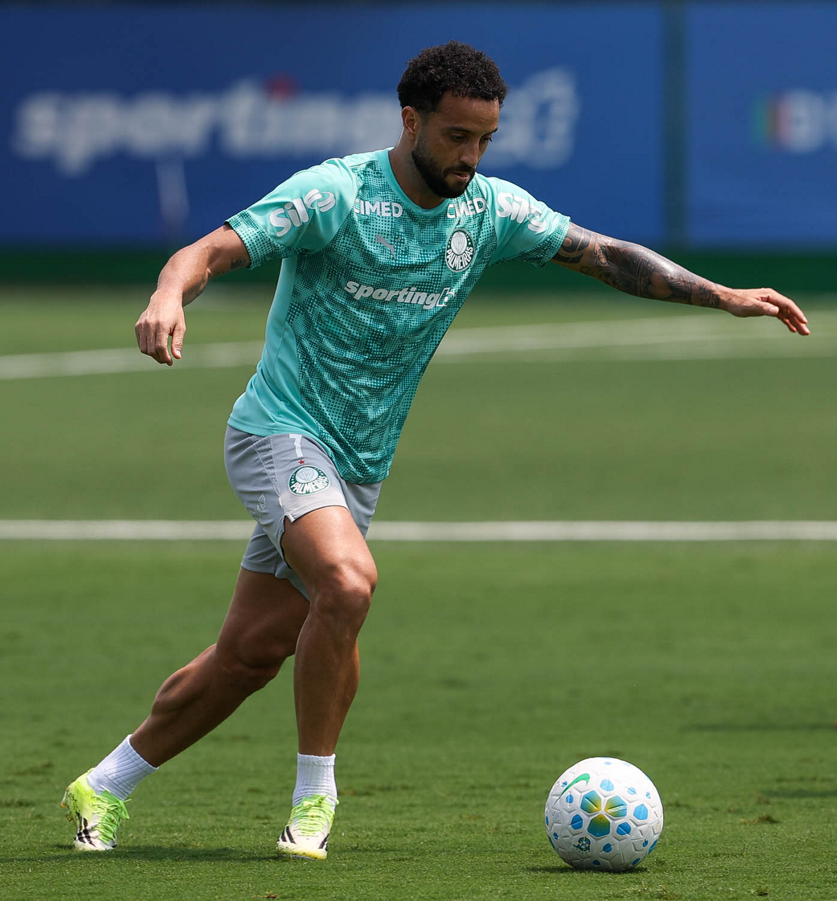 Os jogadores Carlos Miguel, Flaco López, Gustavo Gómez, Emiliano Martínez, Jhon Arias, Arthur, Aranha e Sá (E/D em pé) e Joaquín Piquerez, Agustín Giay, Ramón Sosa, Luighi e Larson (E/D agachados), da SE Palmeiras, durante treinamento, na Academia de Futebol. (Foto: Cesar Greco/Palmeiras/by Canon)