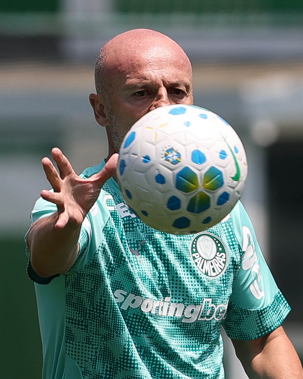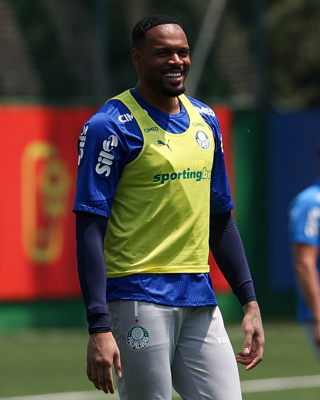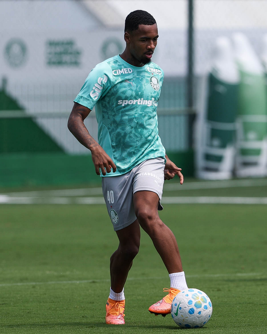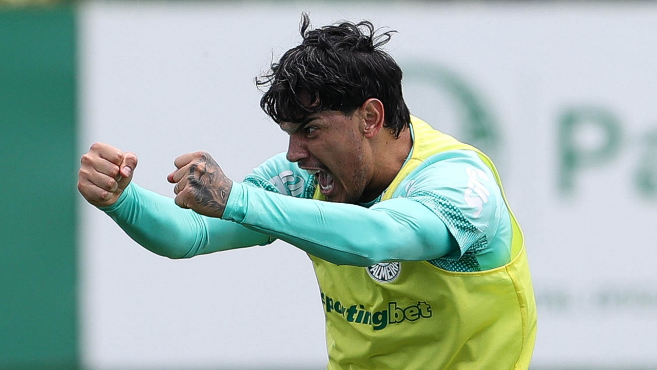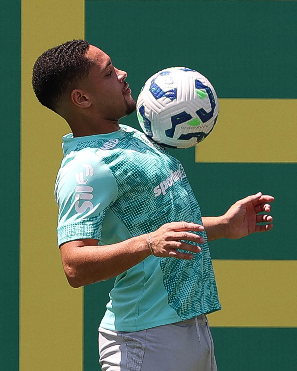 Os jogadores Carlos Miguel, Flaco López, Gustavo Gómez, Emiliano Martínez, Jhon Arias, Arthur, Aranha e Sá (E/D em pé) e Joaquín Piquerez, Agustín Giay, Ramón Sosa, Luighi e Larson (E/D agachados), da SE Palmeiras, durante treinamento, na Academia de Futebol. (Foto: Cesar Greco/Palmeiras/by Canon)