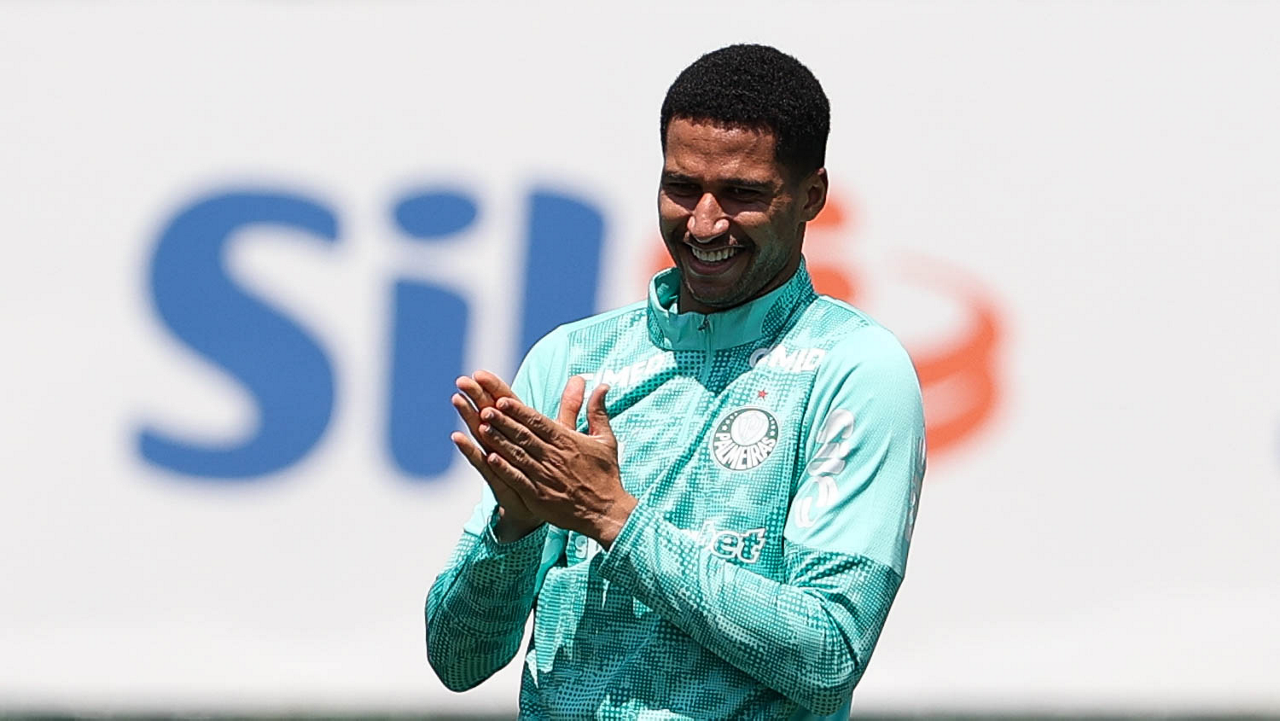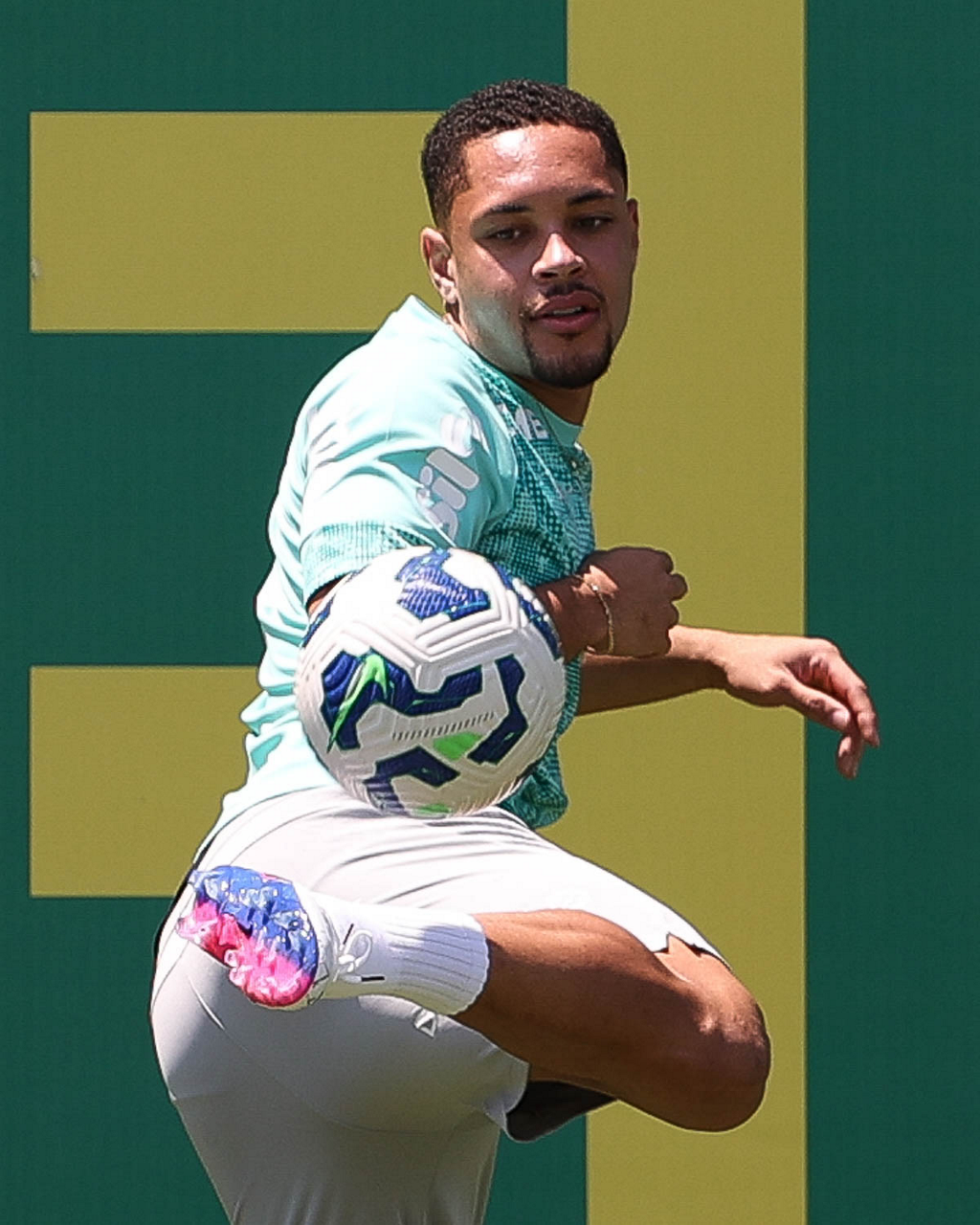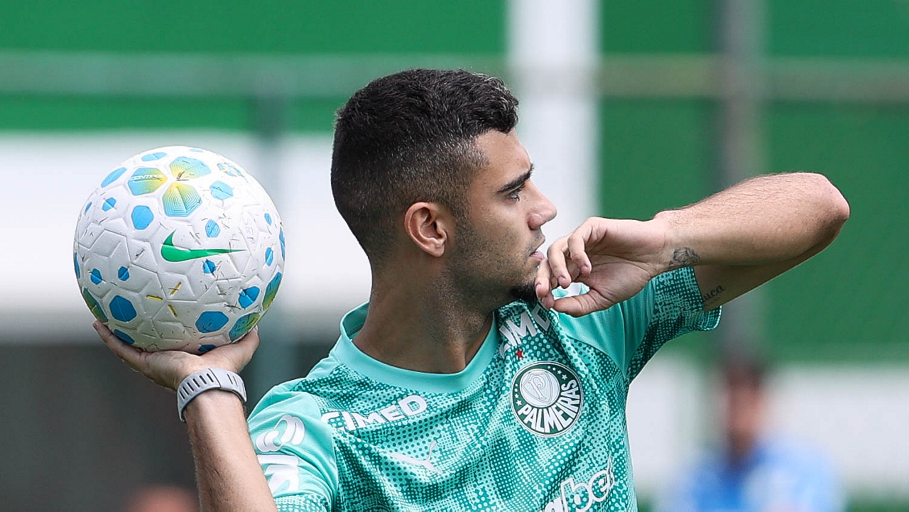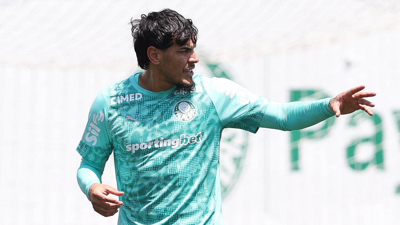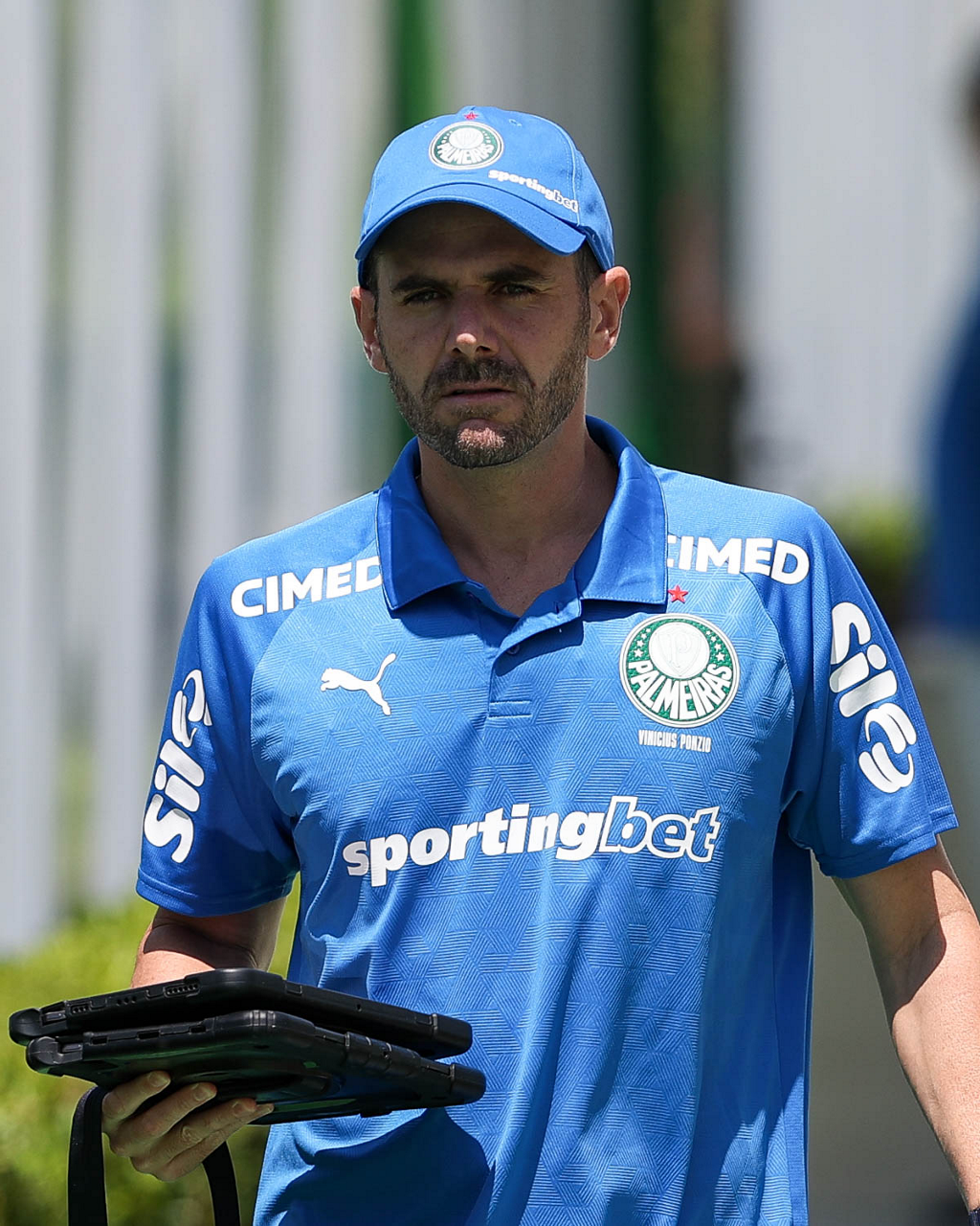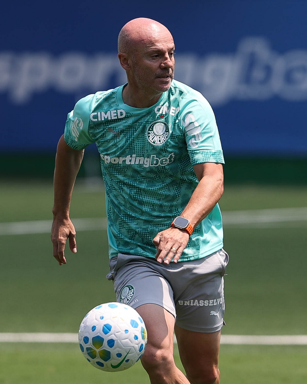 Os jogadores Carlos Miguel, Flaco López, Gustavo Gómez, Emiliano Martínez, Jhon Arias, Arthur, Aranha e Sá (E/D em pé) e Joaquín Piquerez, Agustín Giay, Ramón Sosa, Luighi e Larson (E/D agachados), da SE Palmeiras, durante treinamento, na Academia de Futebol. (Foto: Cesar Greco/Palmeiras/by Canon)