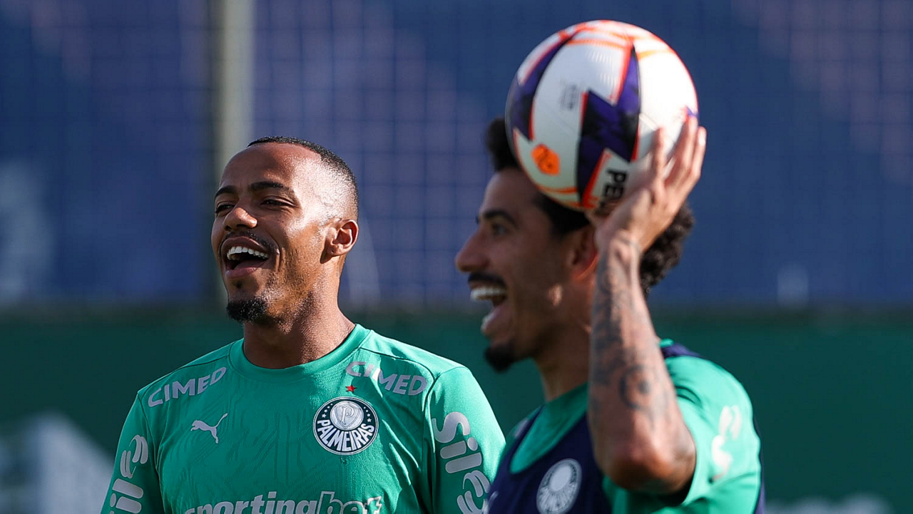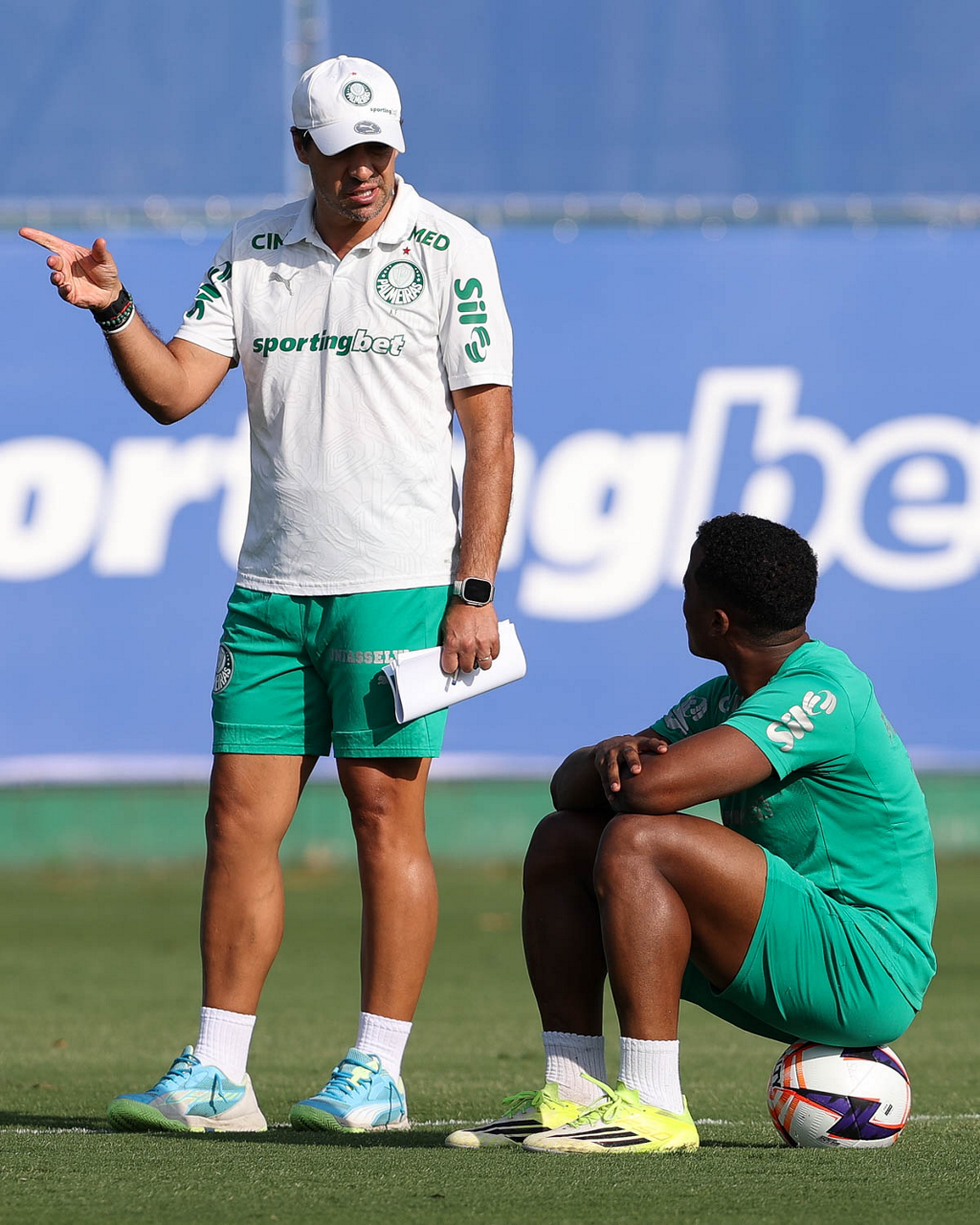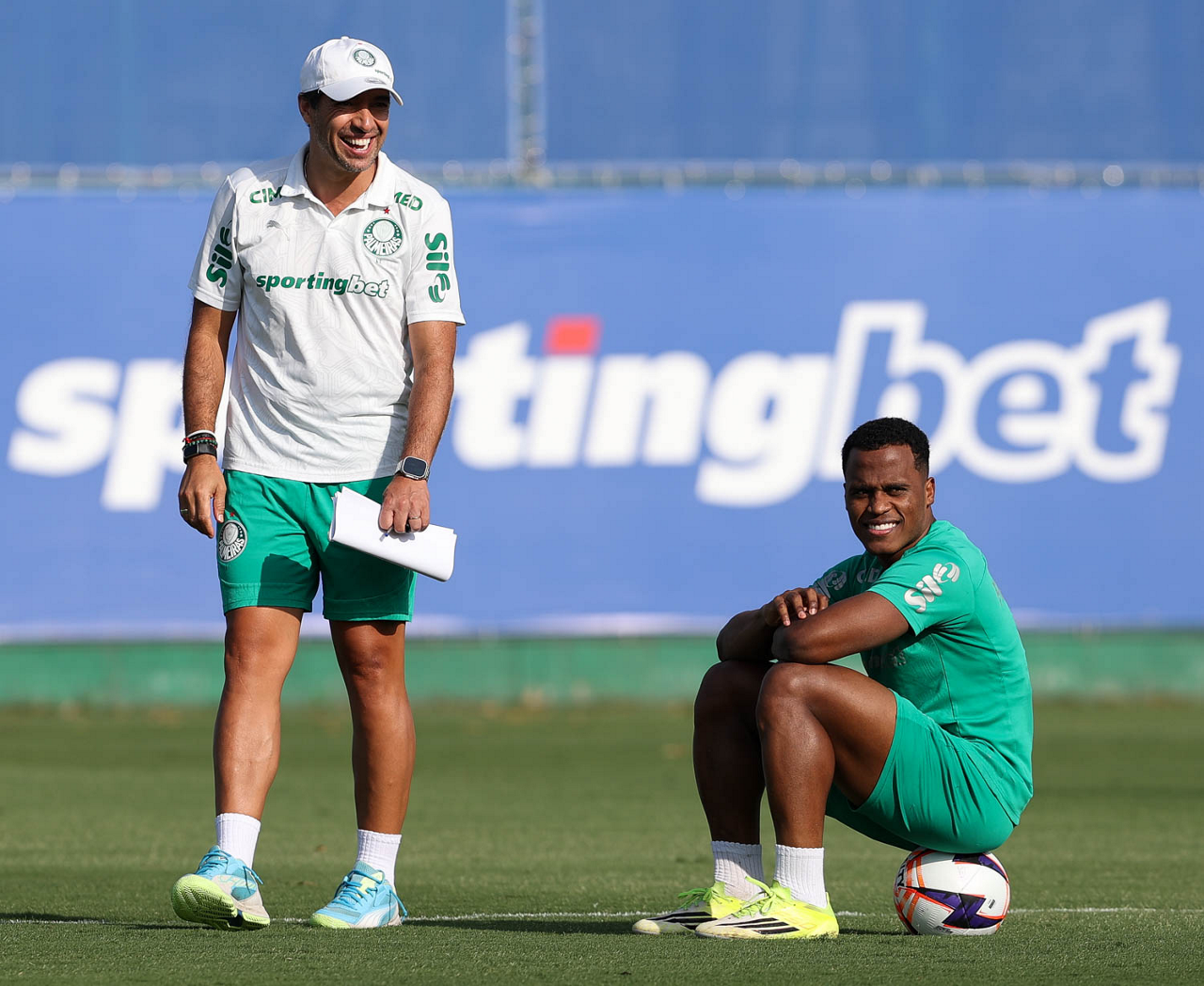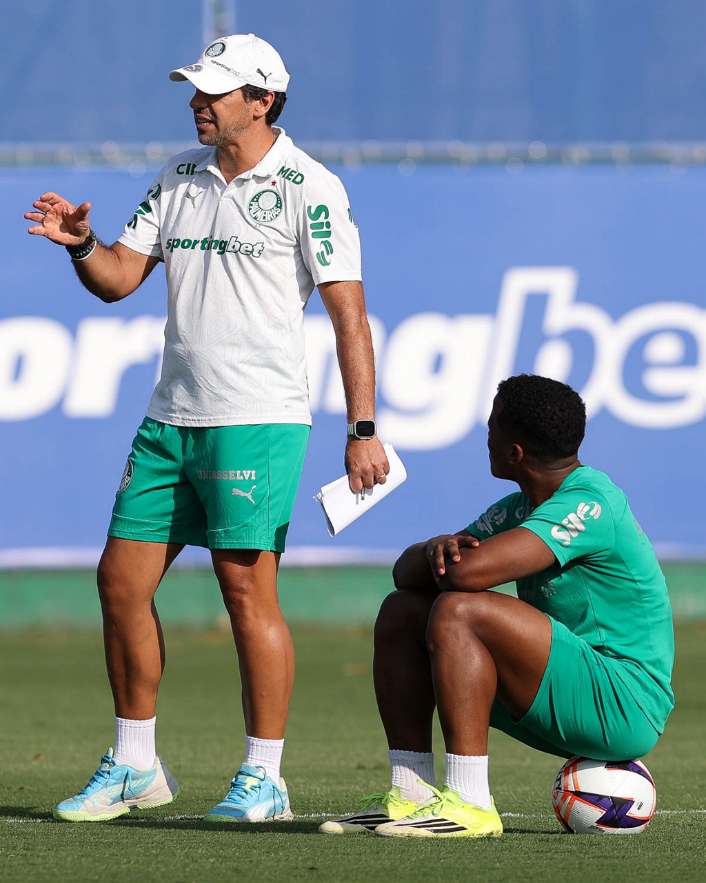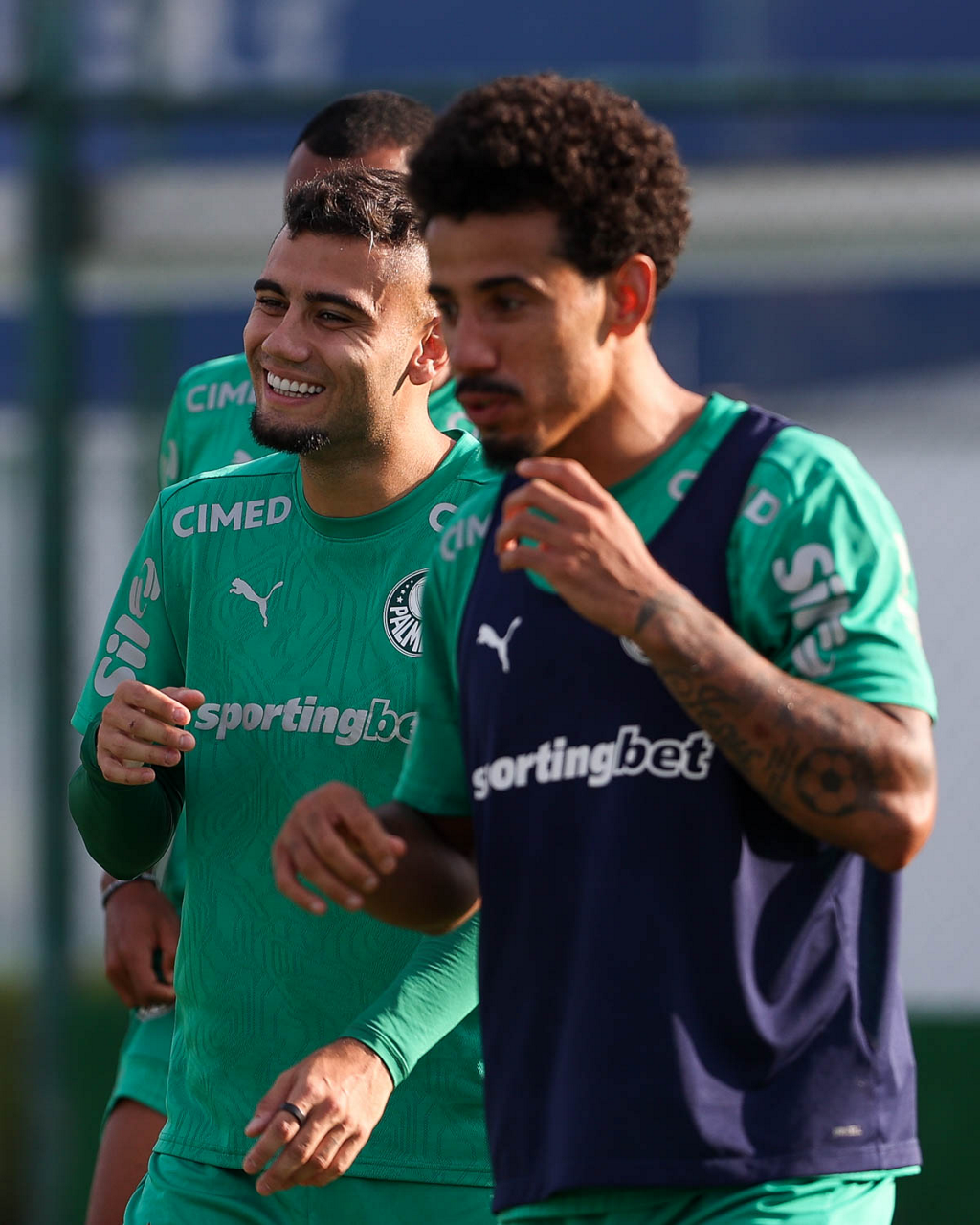 O técnico Abel Ferreira e o jogador Jhon Arias (D), da SE Palmeiras, durante treinamento, na Academia de Futebol. (Foto: Cesar Greco/Palmeiras/by Canon)
