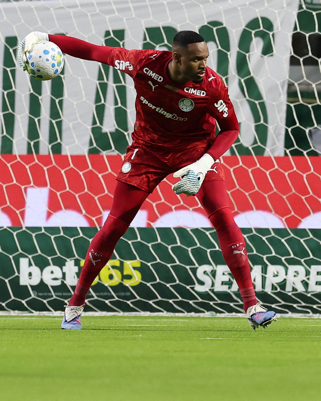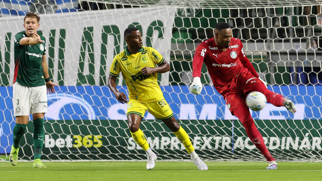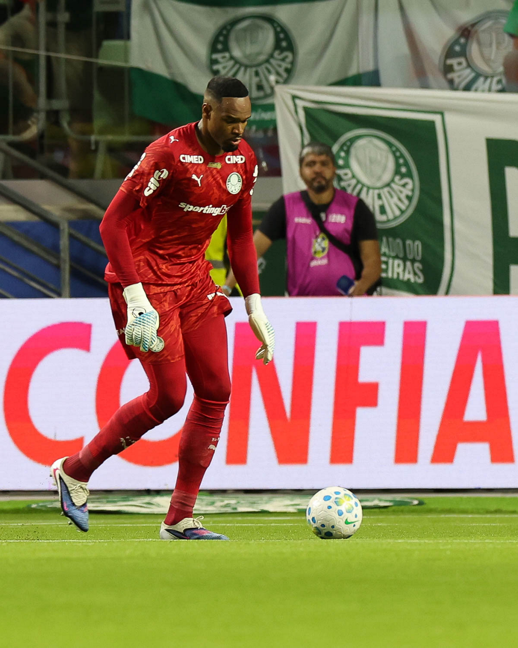 O jogador Emiliano Martínez, da SE Palmeiras, em jogo contra a equipe do Mirassol FC, durante partida válida pela sexta rodada, do Campeonato Brasileiro, Série A, na arena Allianz Parque. (Foto: Cesar Greco/Palmeiras/by Canon)