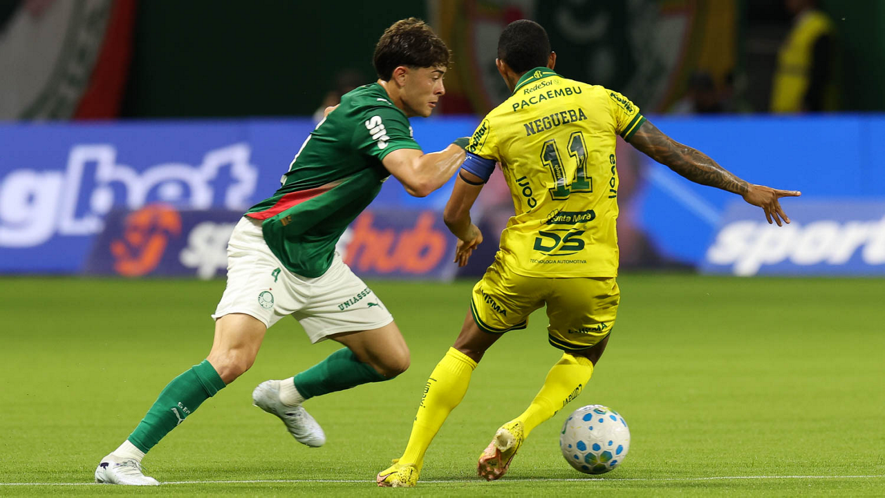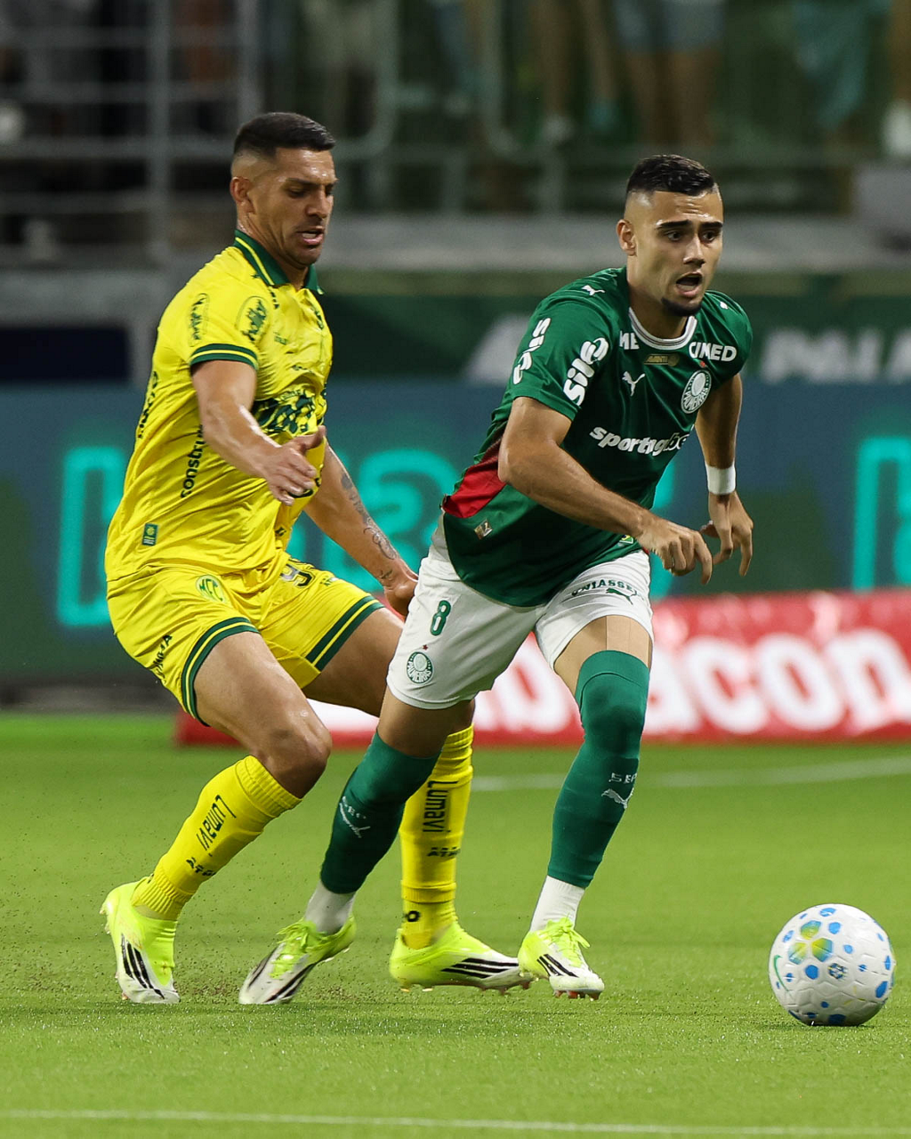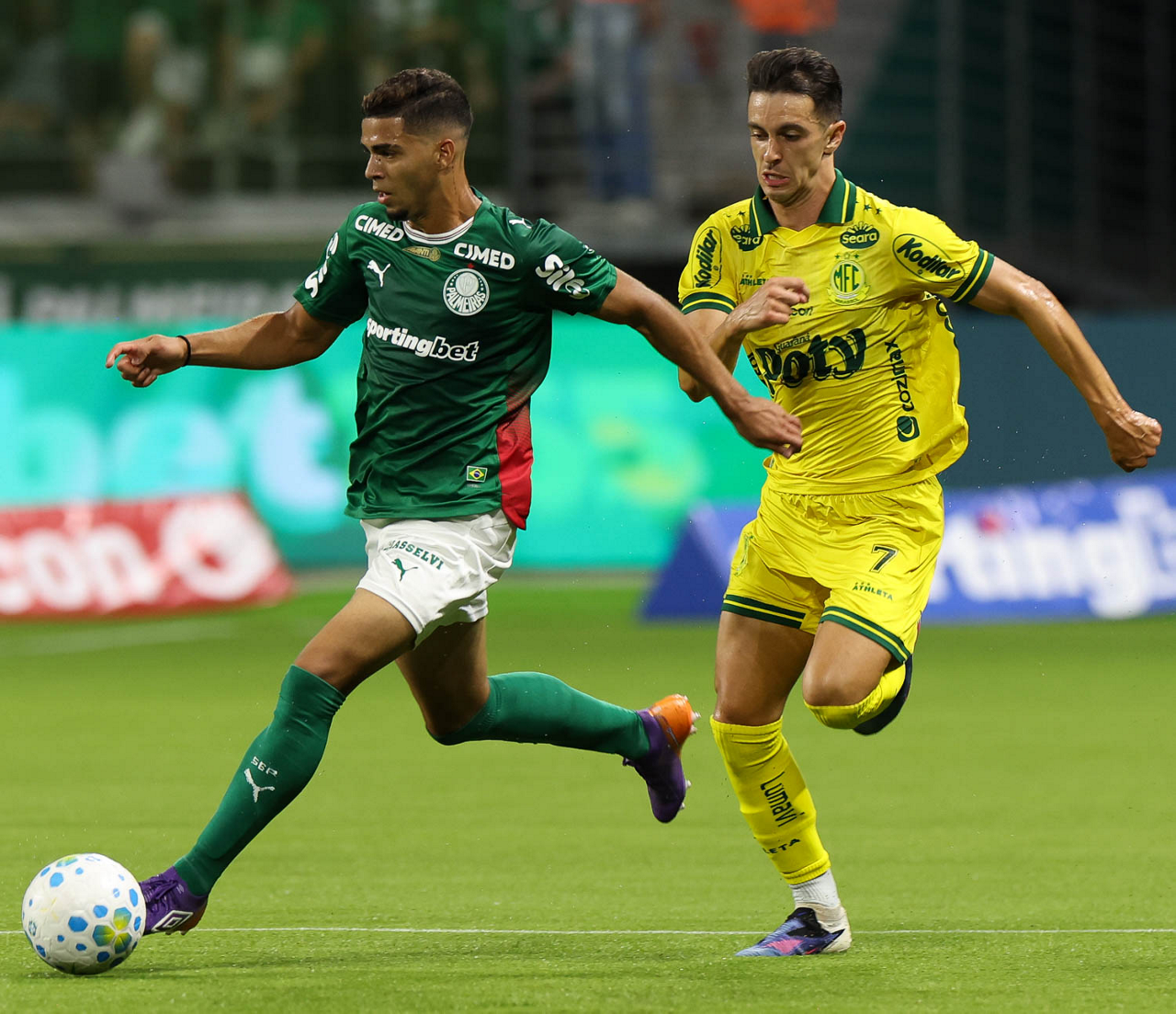 O jogador Bruno Fuchs, da SE Palmeiras, disputa bola com o jogador do Mirassol FC, durante partida válida pela sexta rodada, do Campeonato Brasileiro, Série A, na arena Allianz Parque. (Foto: Cesar Greco/Palmeiras/by Canon)