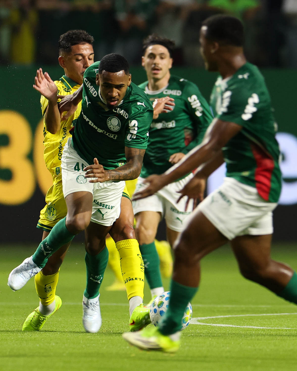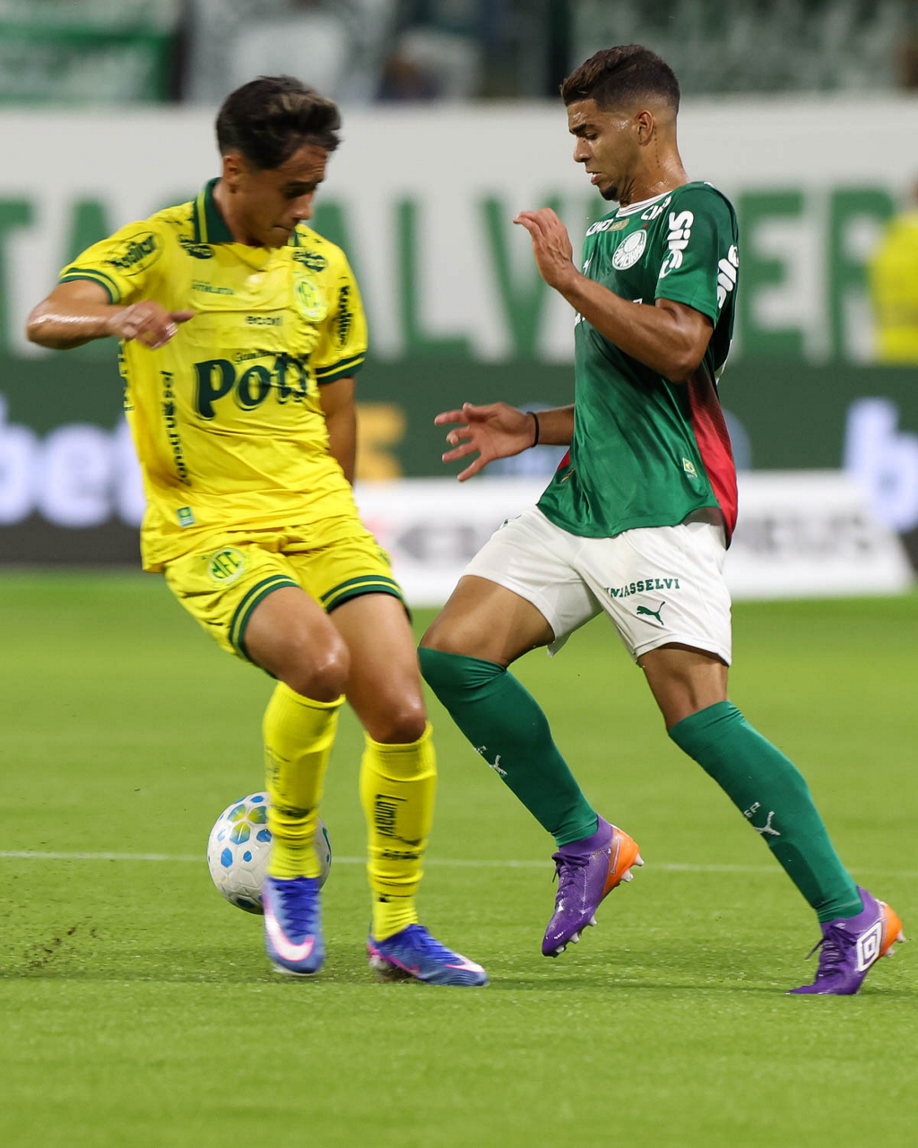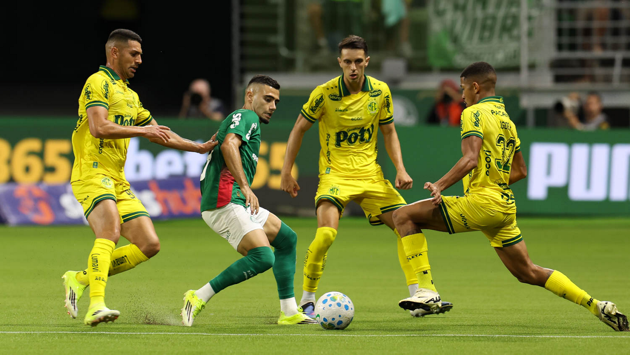 O jogador Bruno Fuchs, da SE Palmeiras, disputa bola com o jogador do Mirassol FC, durante partida válida pela sexta rodada, do Campeonato Brasileiro, Série A, na arena Allianz Parque. (Foto: Cesar Greco/Palmeiras/by Canon)