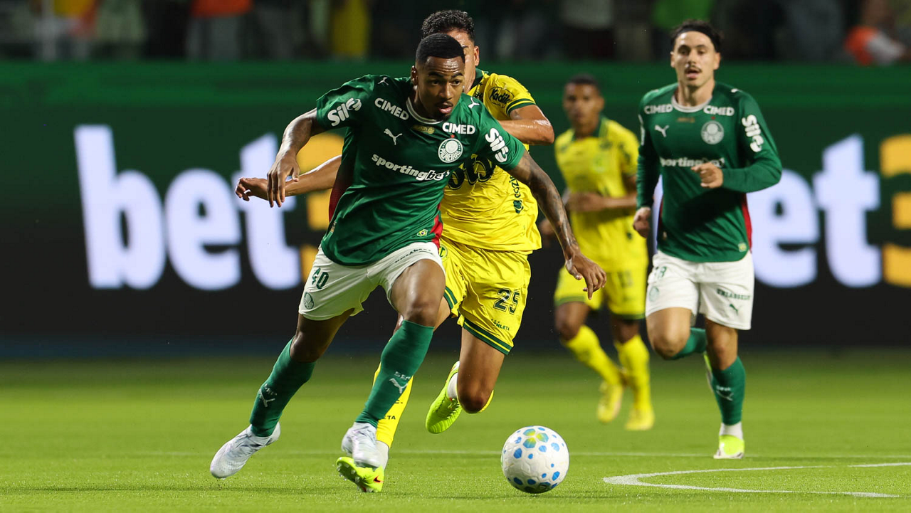 O jogador Jhon Arias, da SE Palmeiras, disputa bola com o jogador do Mirassol FC, durante partida válida pela sexta rodada, do Campeonato Brasileiro, Série A, na arena Allianz Parque. (Foto: Cesar Greco/Palmeiras/by Canon)