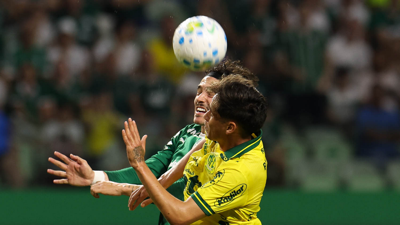 O jogador Agustín Giay, da SE Palmeiras, disputa bola com o jogador do Mirassol FC, durante partida válida pela sexta rodada, do Campeonato Brasileiro, Série A, na arena Allianz Parque. (Foto: Cesar Greco/Palmeiras/by Canon)
