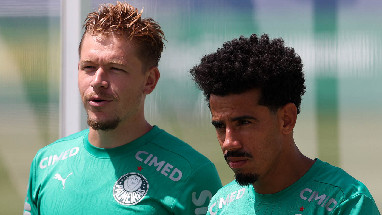 Os jogadores Joaquín Piquerez e Jhon Arias (D), da SE Palmeiras, durante treinamento, na Academia de Futebol. (Foto: Cesar Greco/Palmeiras/by Canon)