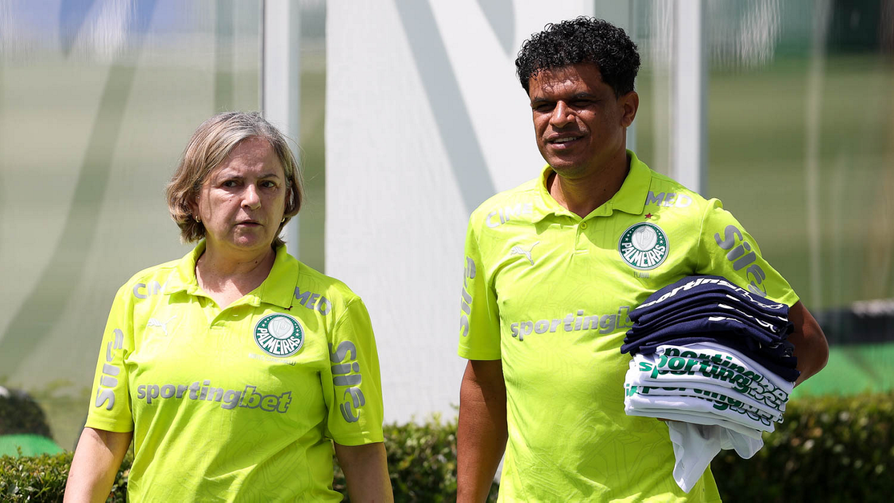 A nutricionista Mirtes Stancanelli e o roupeiro Flavio Carvalho (D), da SE Palmeiras, durante treinamento, na Academia de Futebol. (Foto: Cesar Greco/Palmeiras/by Canon)