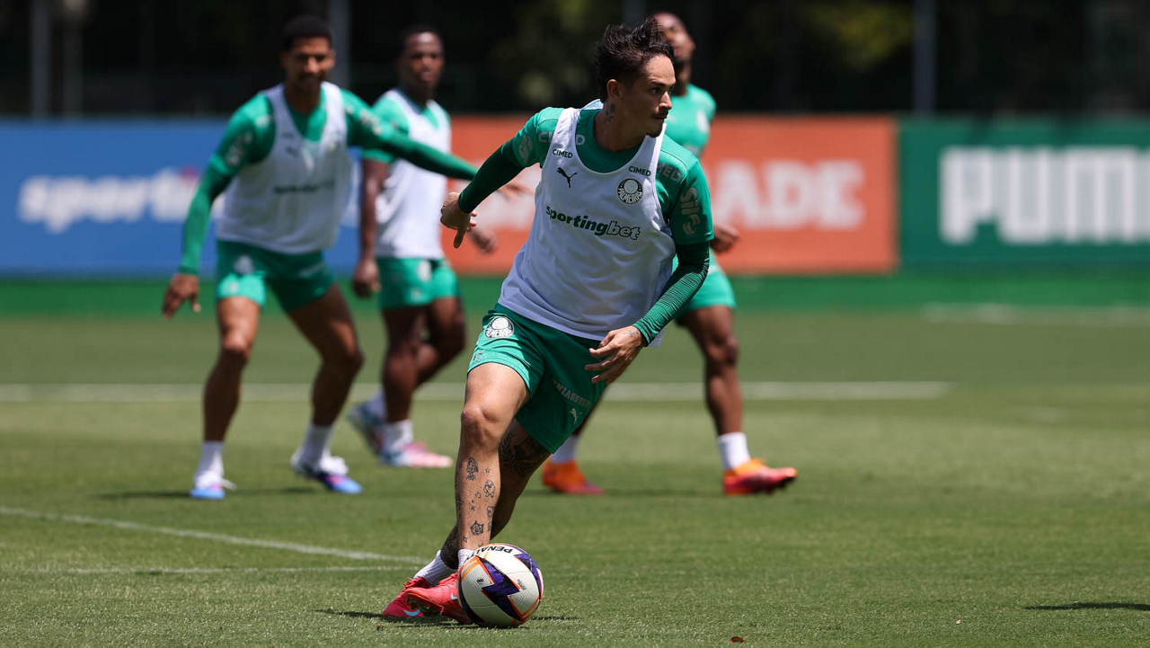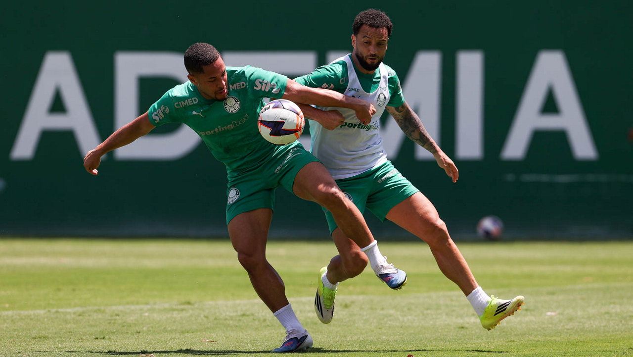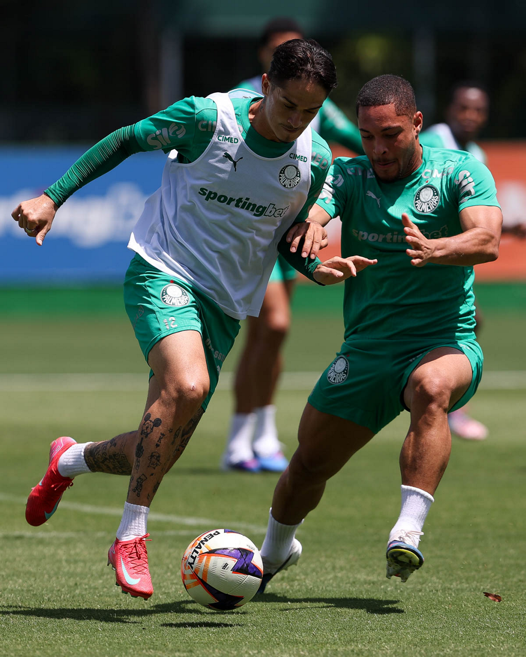 Os jogadores Vitor Roque e Felipe Anderson (D), da SE Palmeiras, durante treinamento, na Academia de Futebol. (Foto: Cesar Greco/Palmeiras/by Canon)