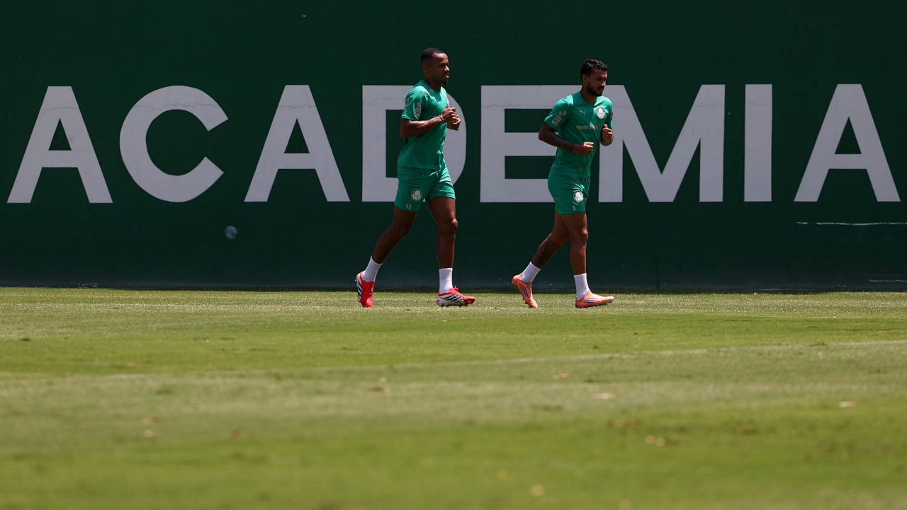 Os jogadores Gustavo Gómez e Vitor Roque (D), da SE Palmeiras, durante treinamento, na Academia de Futebol. (Foto: Cesar Greco/Palmeiras/by Canon)