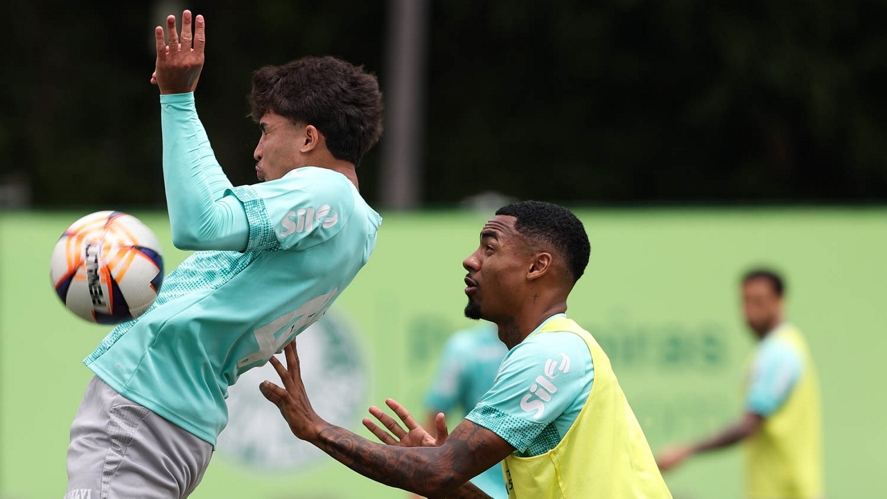 Os jogadores Jhon Arias e Allan (D), da SE Palmeiras, durante treinamento, na Academia de Futebol. (Foto: Cesar Greco/Palmeiras/by Canon)