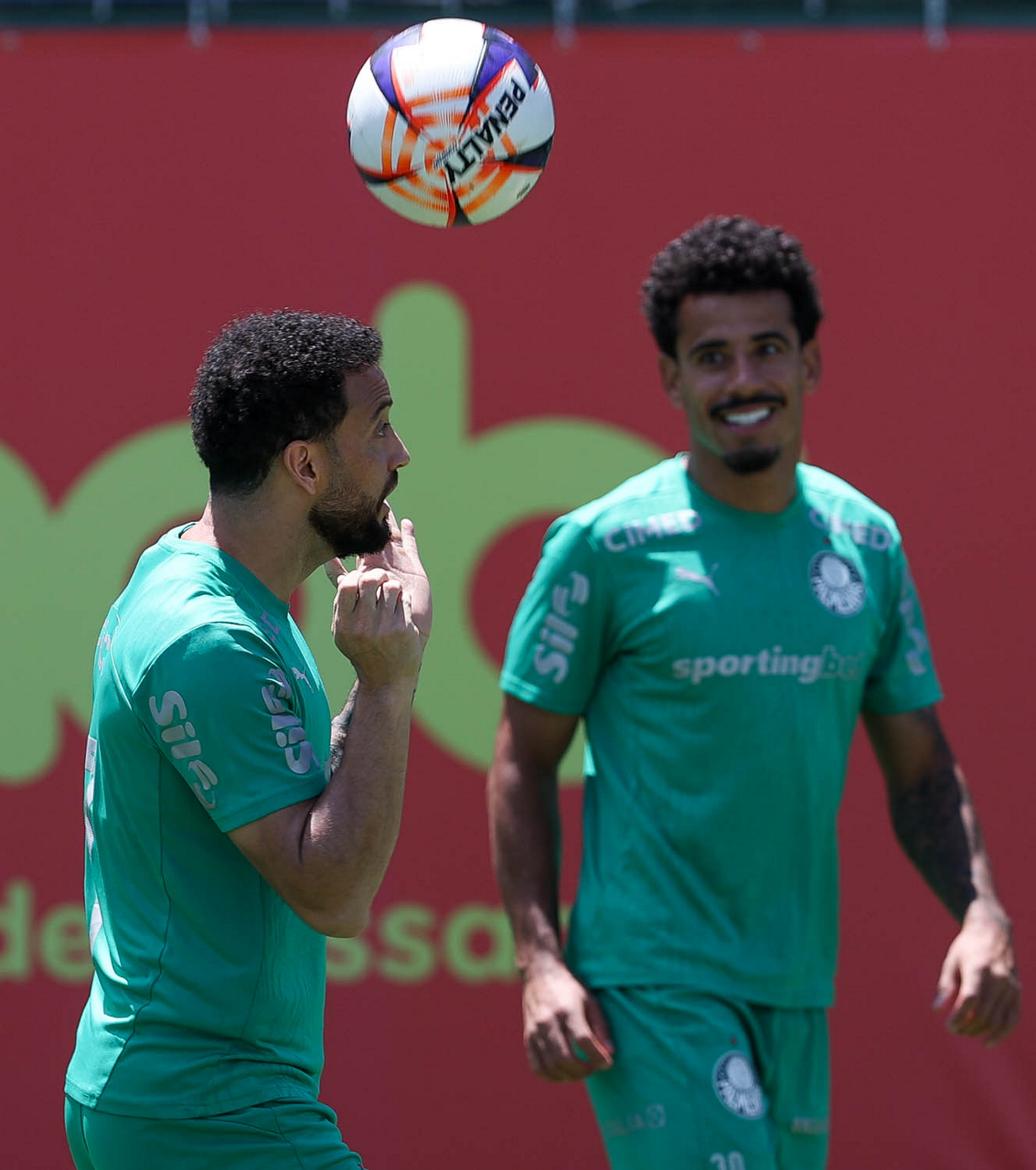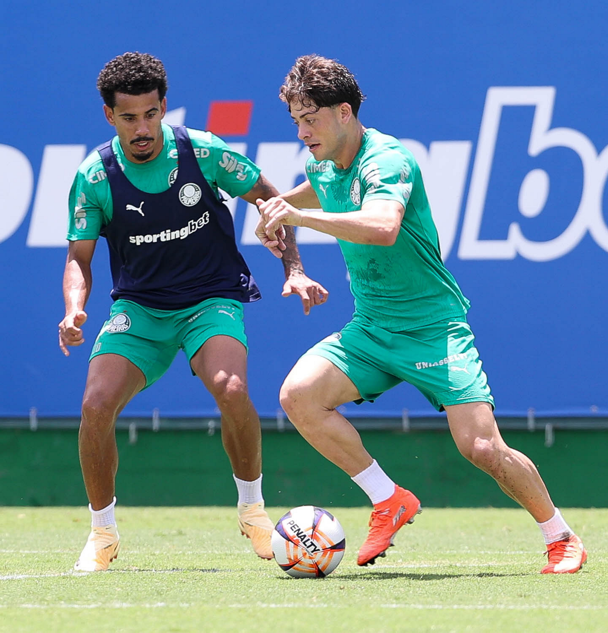 Os jogadores Lucas Evangelista e Emiliano Martínez (D), da SE Palmeiras, durante treinamento, na Academia de Futebol. (Foto: Cesar Greco/Palmeiras/by Canon)
