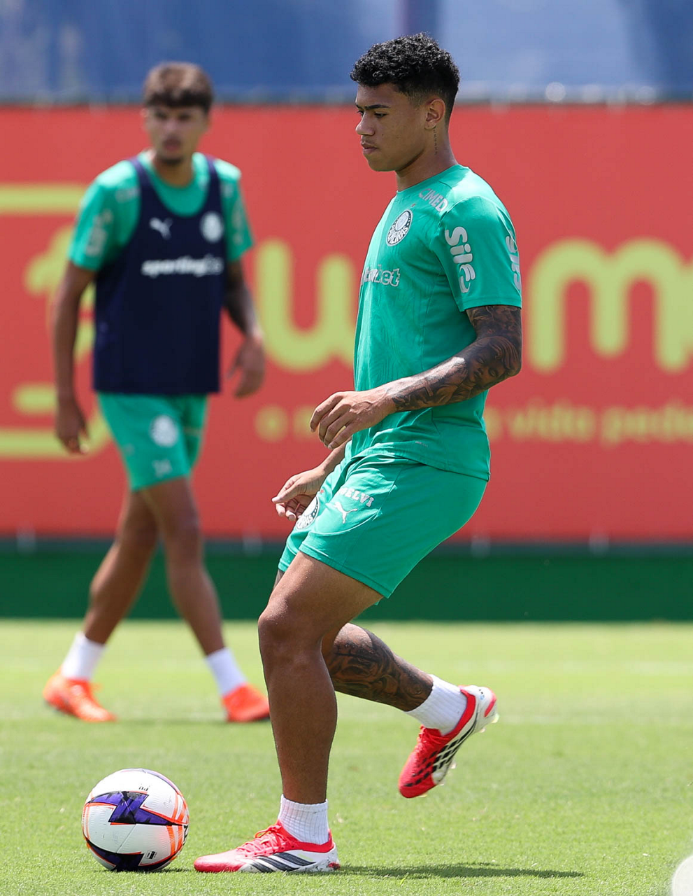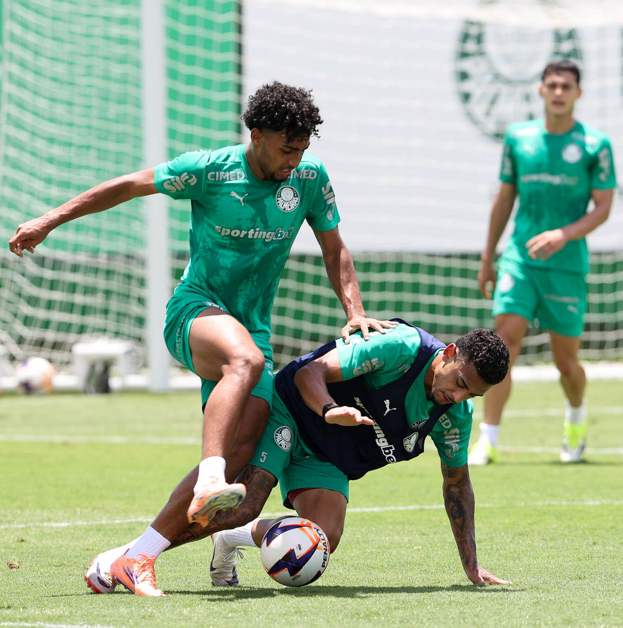 Os jogadores Luighi e Bruno Fuchs (D), da SE Palmeiras, durante treinamento, na Academia de Futebol. (Foto: Cesar Greco/Palmeiras/by Canon)