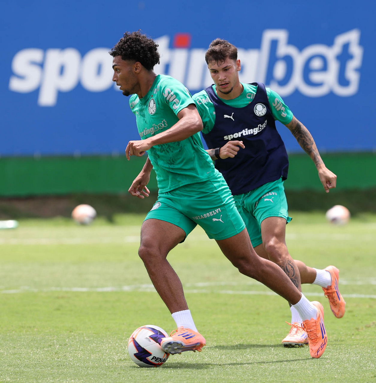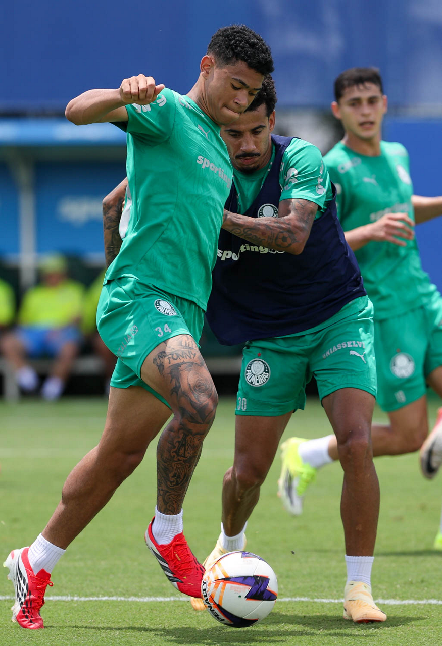 Os jogadores Ramón Sosa e Lucas Evangelista (D), da SE Palmeiras, durante treinamento, na Academia de Futebol. (Foto: Cesar Greco/Palmeiras/by Canon)