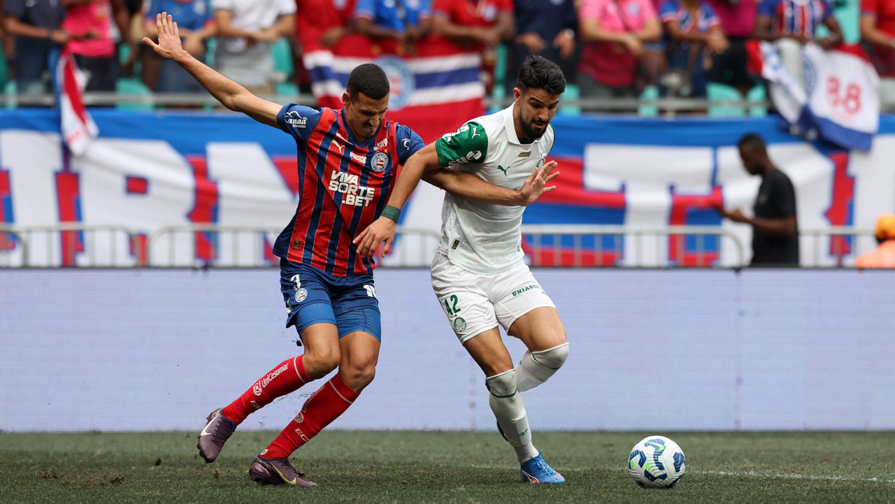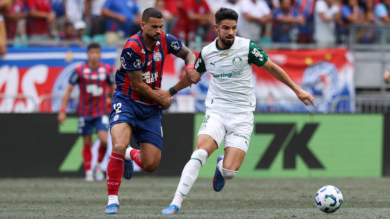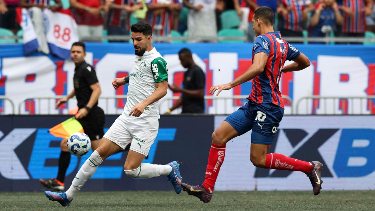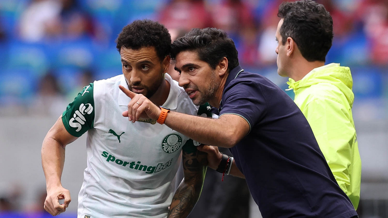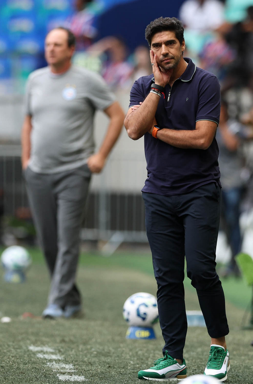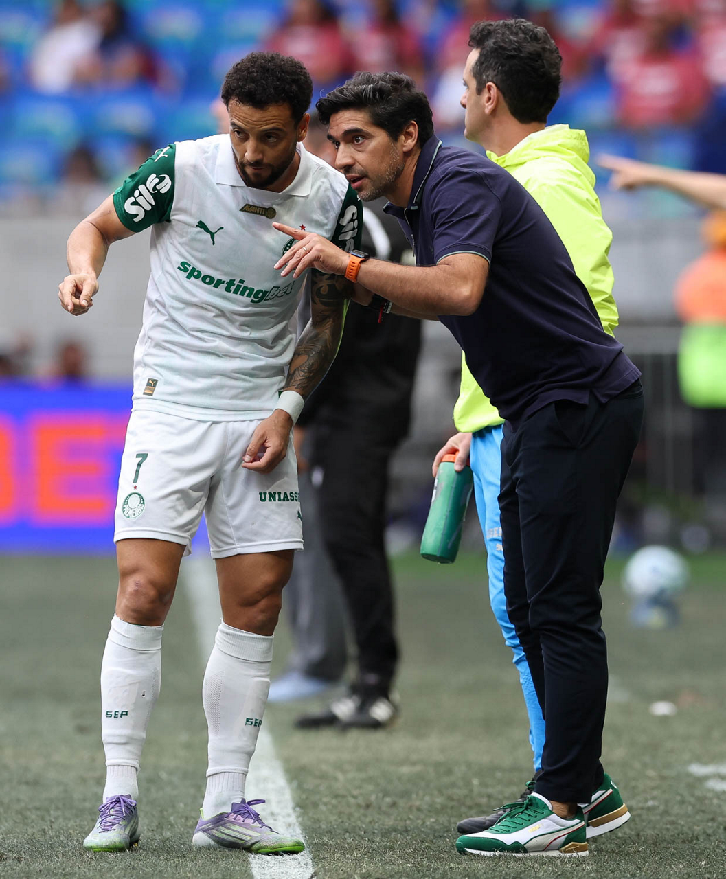 O técnico Abel Ferreira e o jogador Felipe Anderson (E), da SE Palmeiras, em jogo contra a equipe do EC Bahia, durante partida válida pela vigésima quinta rodada, do Campeonato Brasileiro, Série A, na Arena Fonte Nova. (Foto: Cesar Greco/Palmeiras/by Canon)