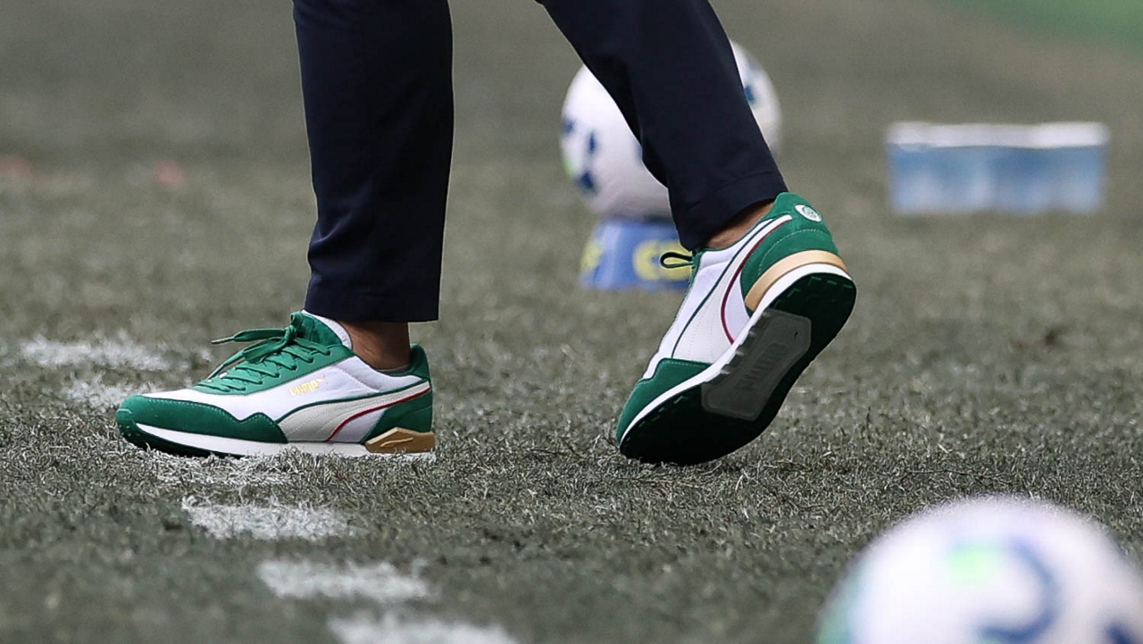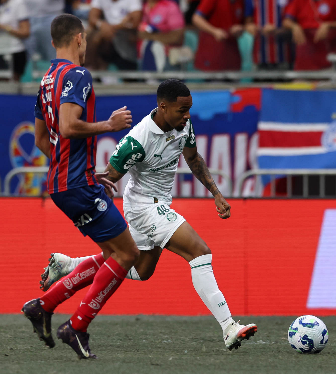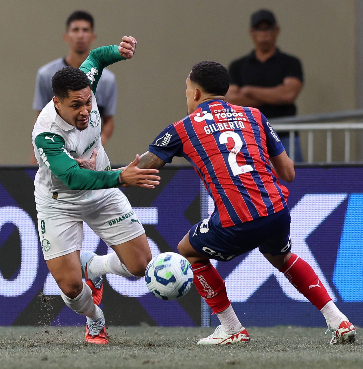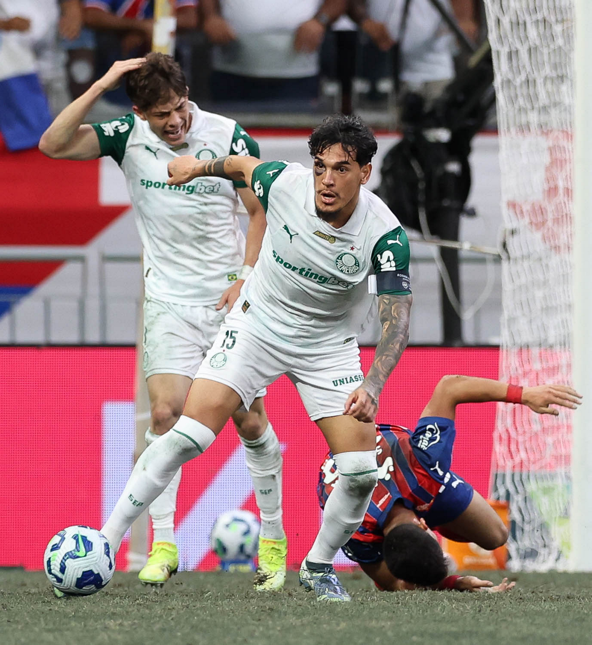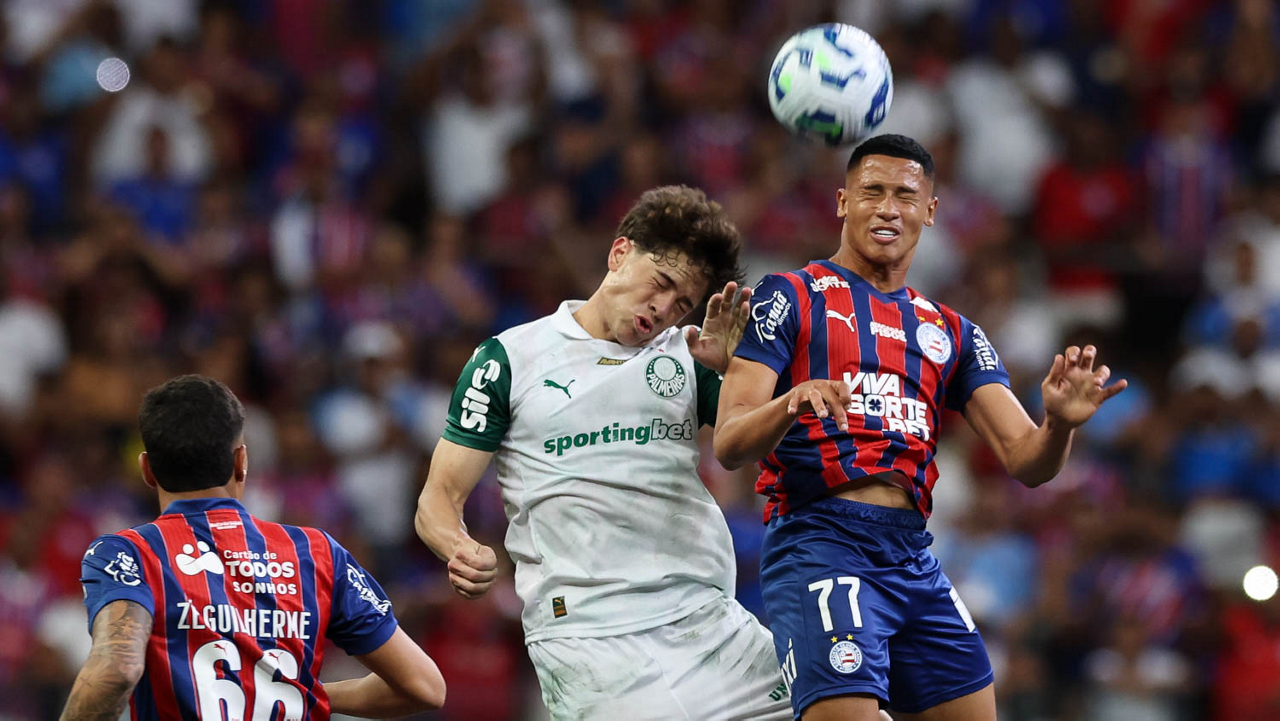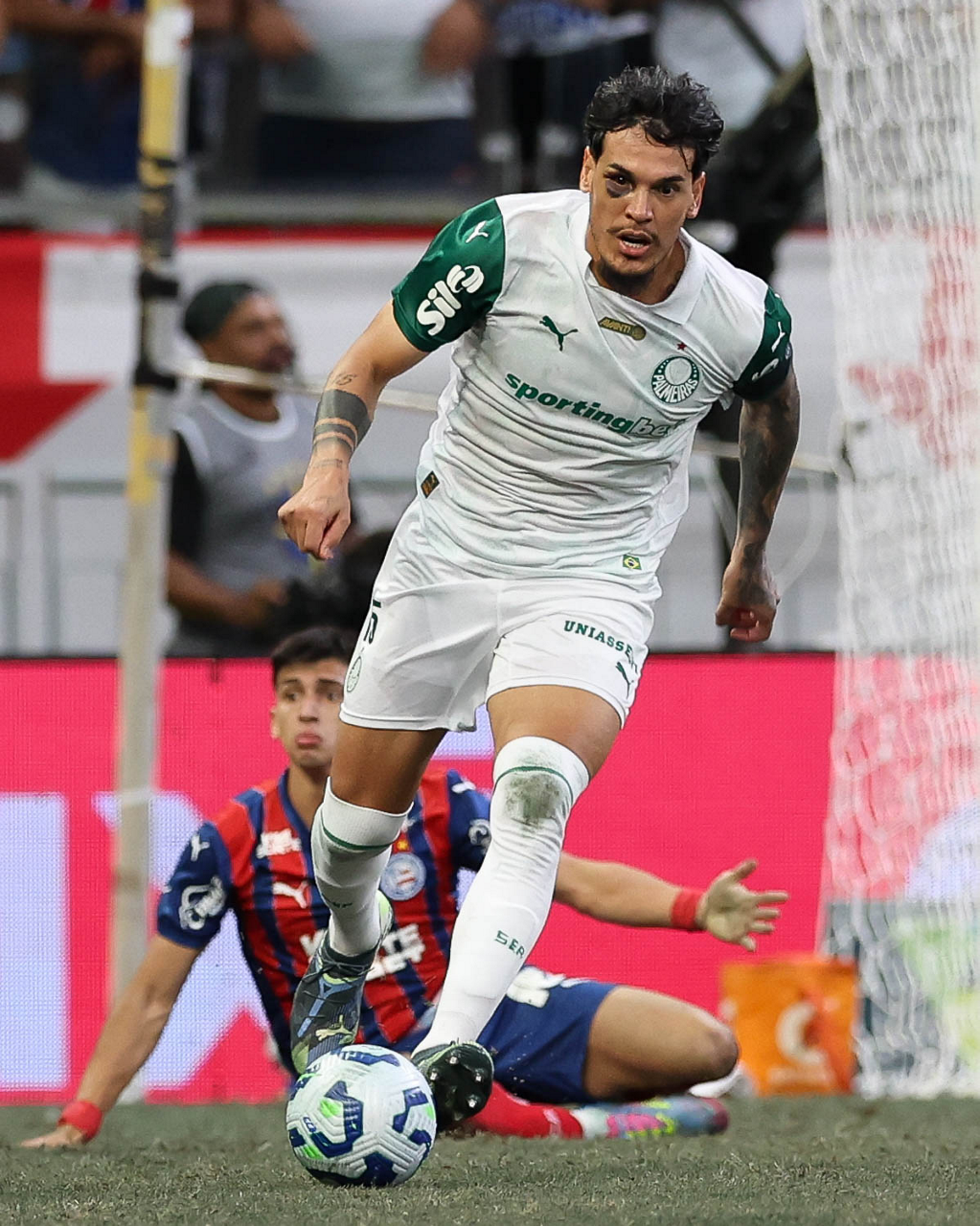 O técnico Abel Ferreira e o jogador Felipe Anderson (E), da SE Palmeiras, em jogo contra a equipe do EC Bahia, durante partida válida pela vigésima quinta rodada, do Campeonato Brasileiro, Série A, na Arena Fonte Nova. (Foto: Cesar Greco/Palmeiras/by Canon)