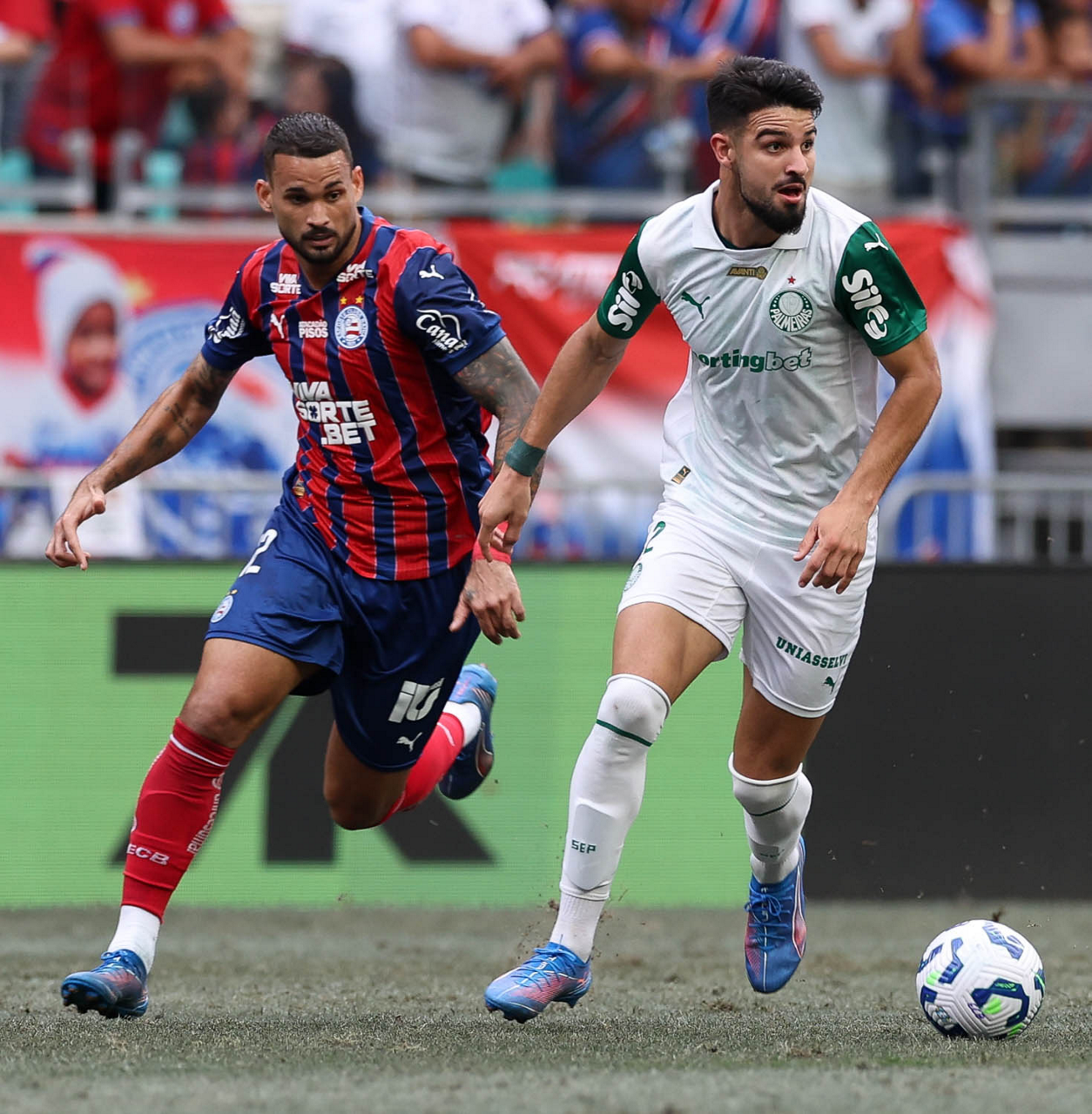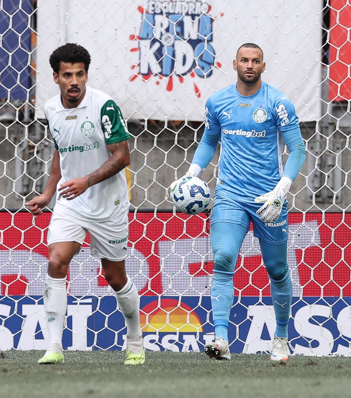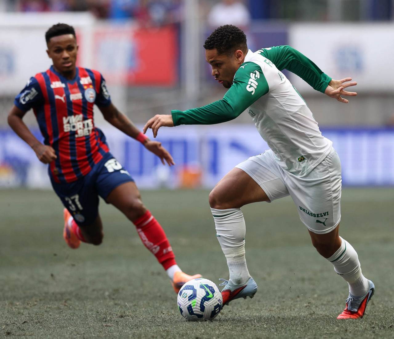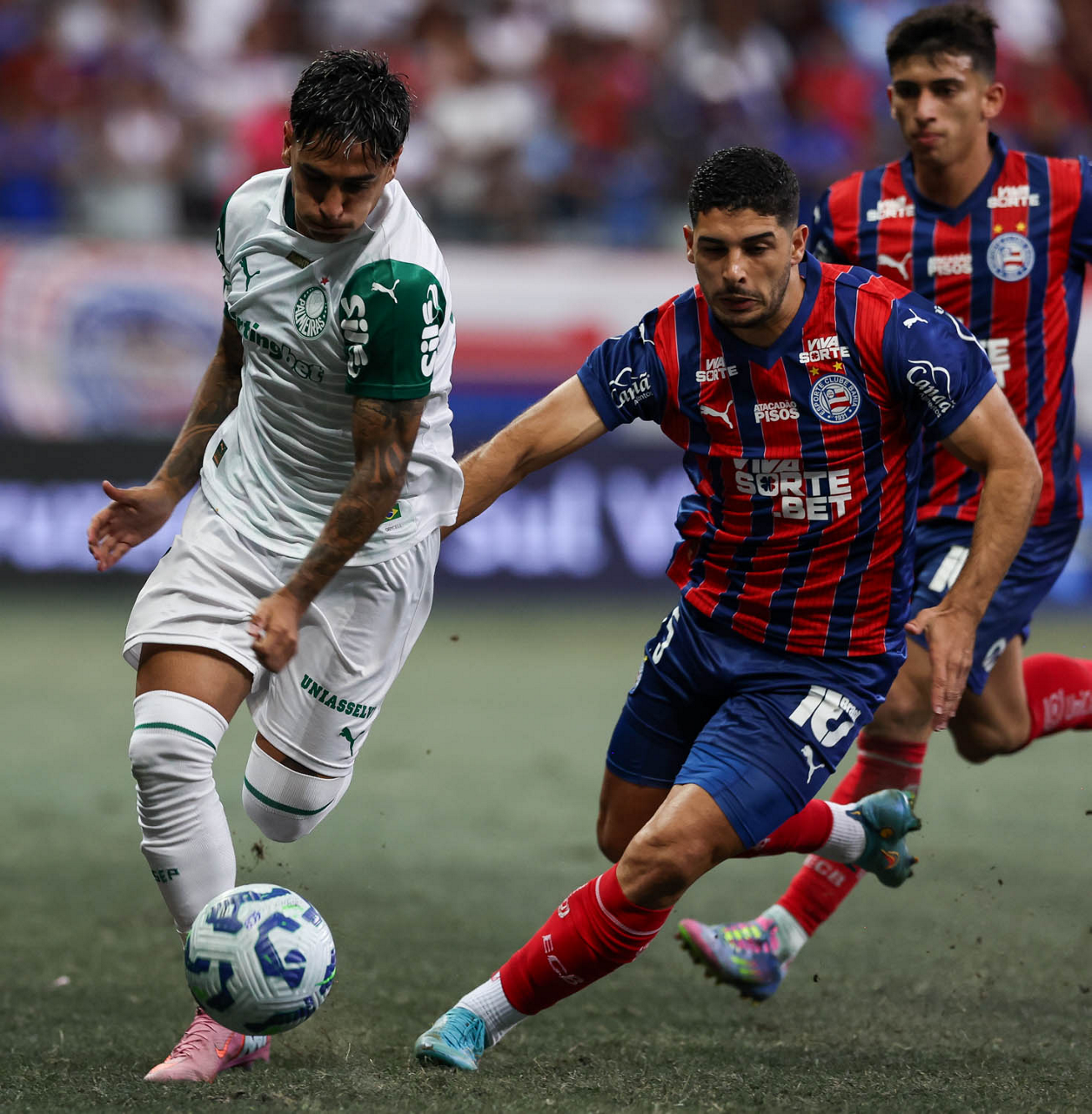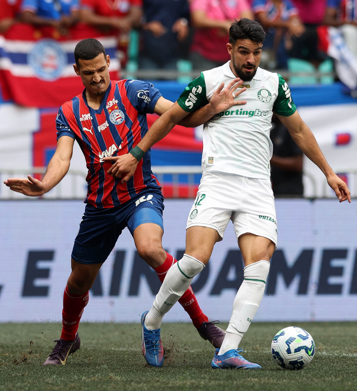 O técnico Abel Ferreira e o jogador Felipe Anderson (E), da SE Palmeiras, em jogo contra a equipe do EC Bahia, durante partida válida pela vigésima quinta rodada, do Campeonato Brasileiro, Série A, na Arena Fonte Nova. (Foto: Cesar Greco/Palmeiras/by Canon)