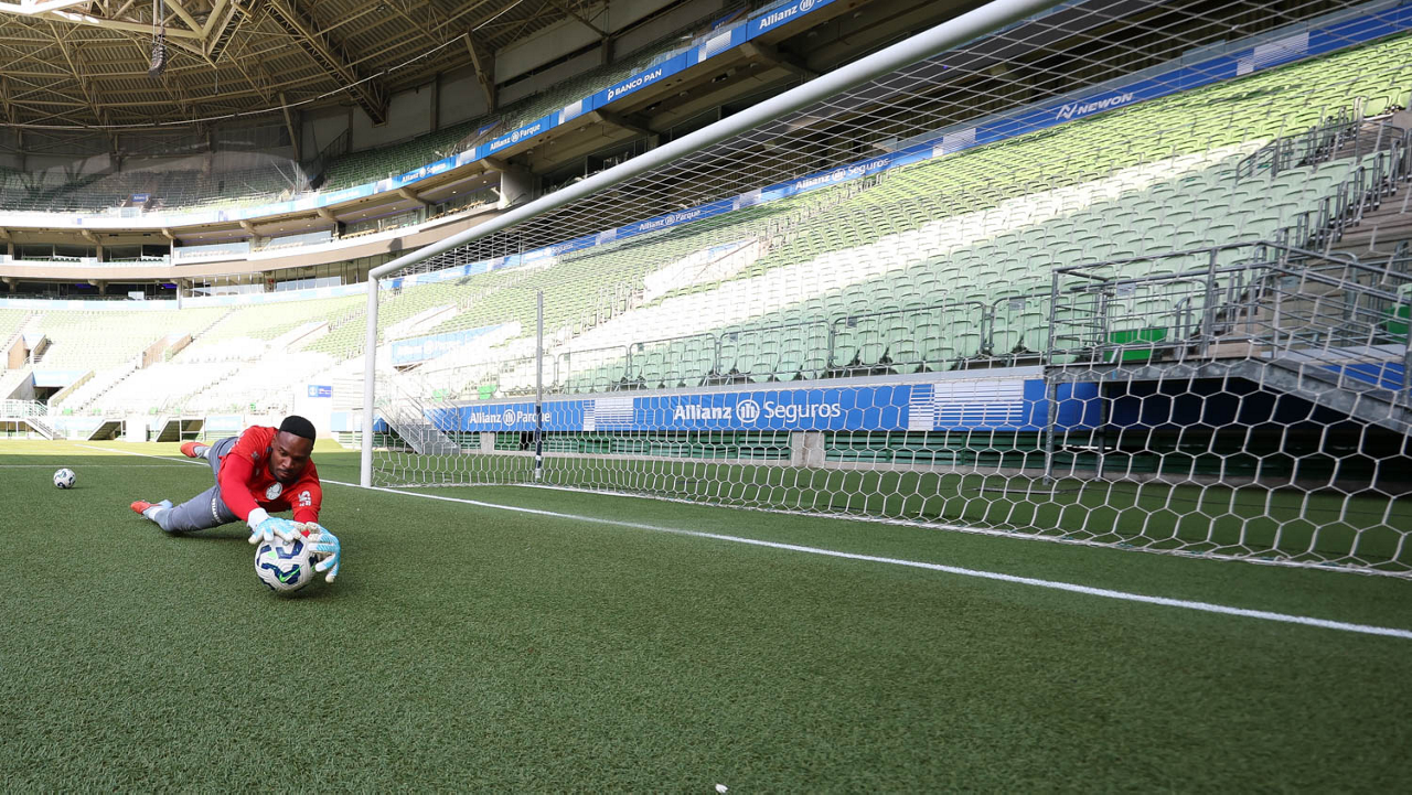 O goleiro Weverton, da SE Palmeiras, durante treinamento, na arena Allianz Parque. (Foto: Cesar Greco/Palmeiras/by Canon)
