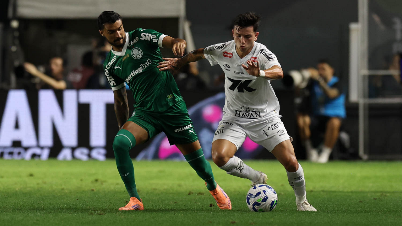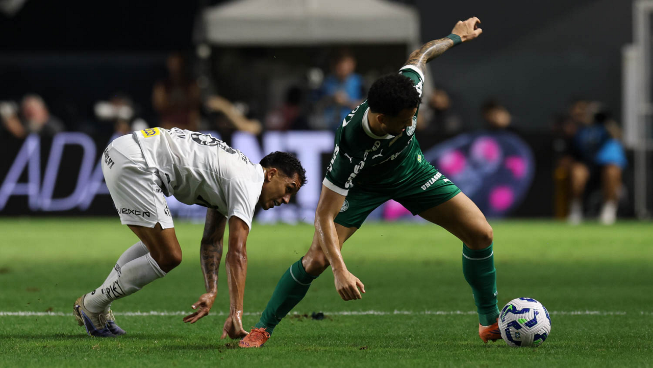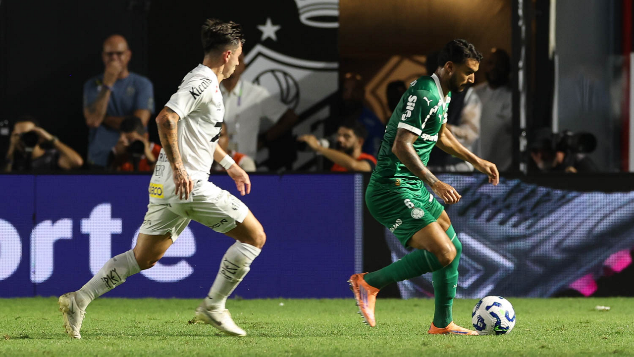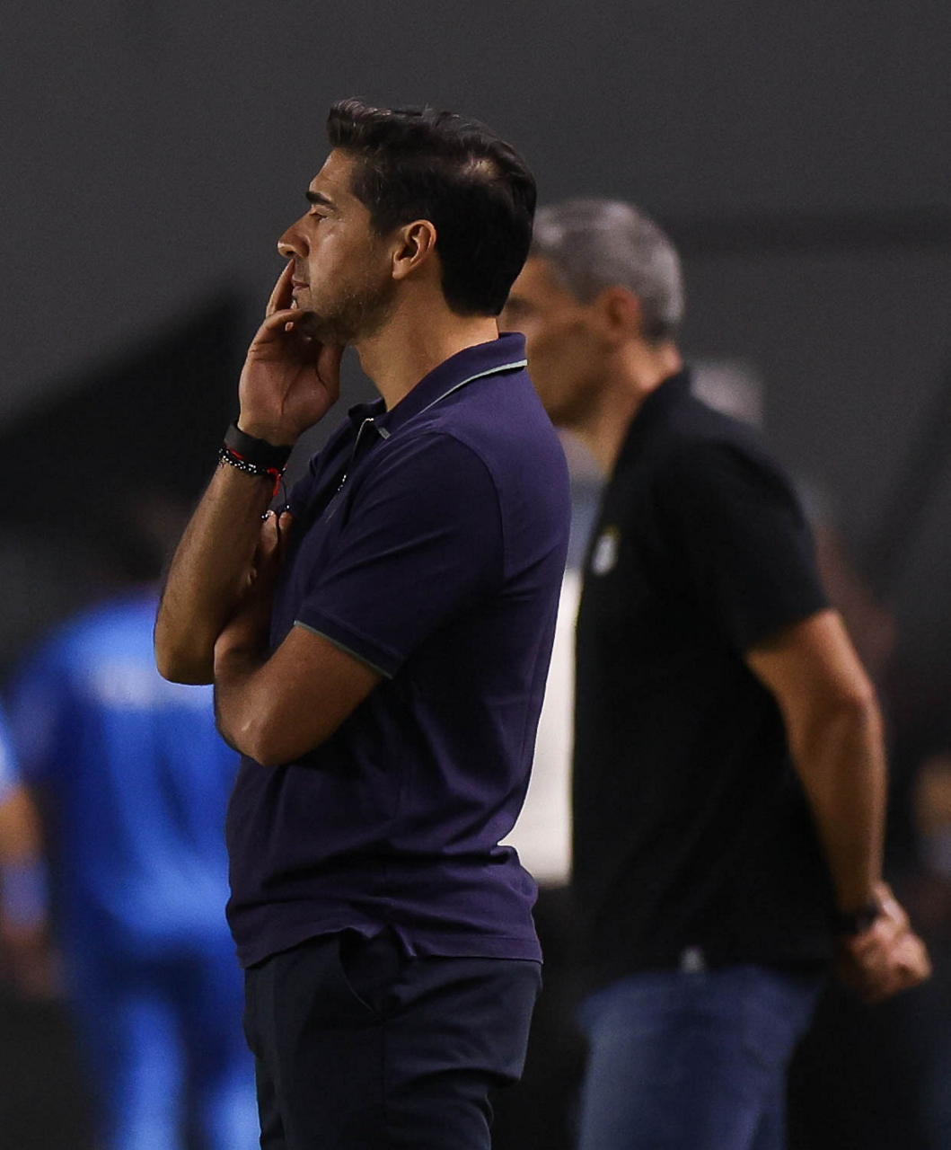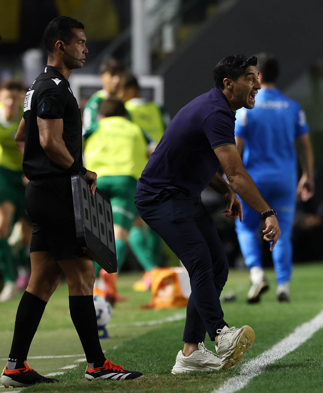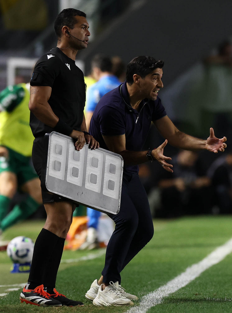 O técnico Abel Ferreira e o jogador Felipe Anderson (E), da SE Palmeiras, em jogo contra a equipe do Santos FC, durante partida válida pela décima terceira rodada, do Campeonato Brasileiro, Série A, no Estádio Vila Belmiro. (Foto: Cesar Greco/Palmeiras/by Canon)